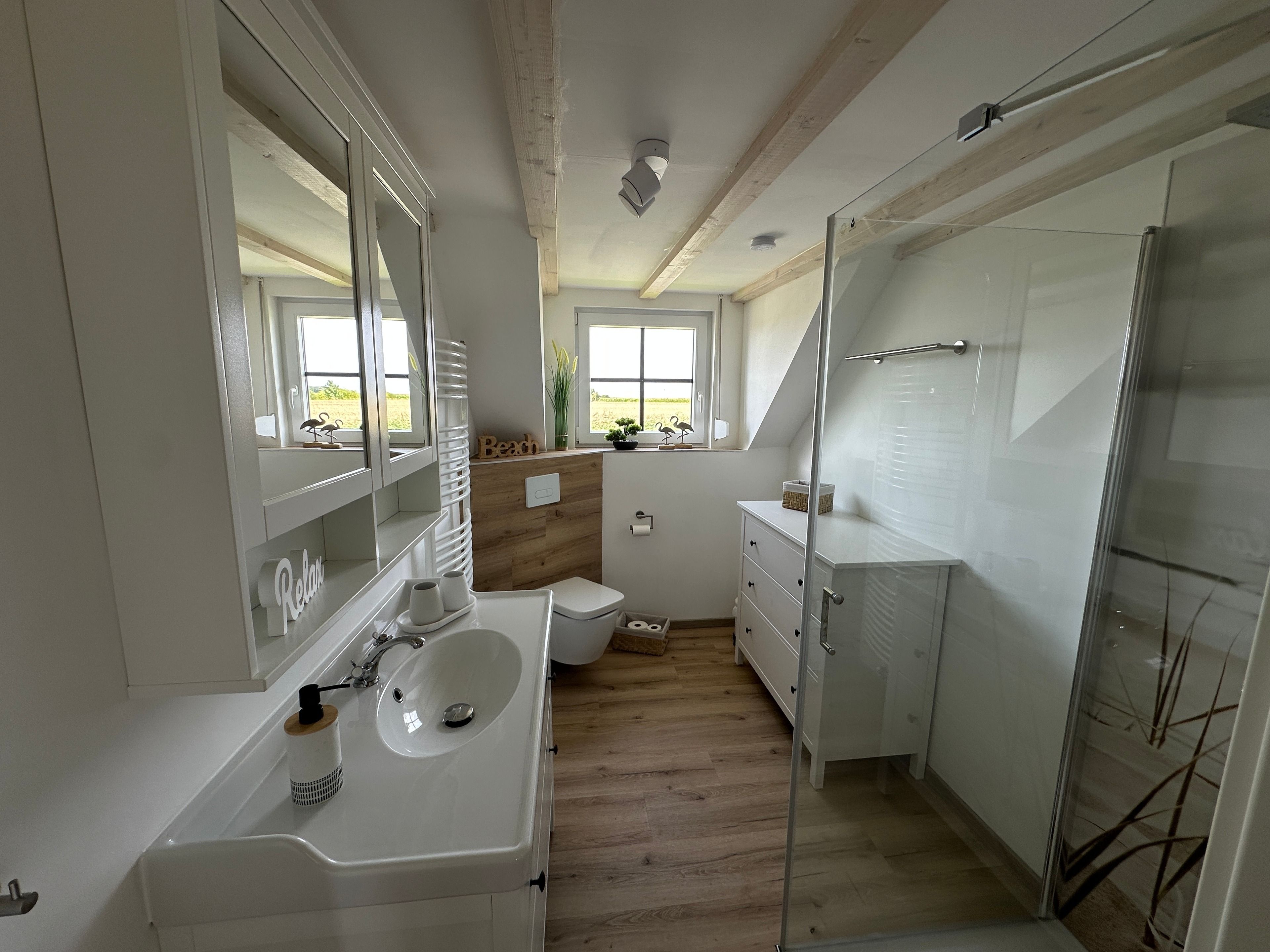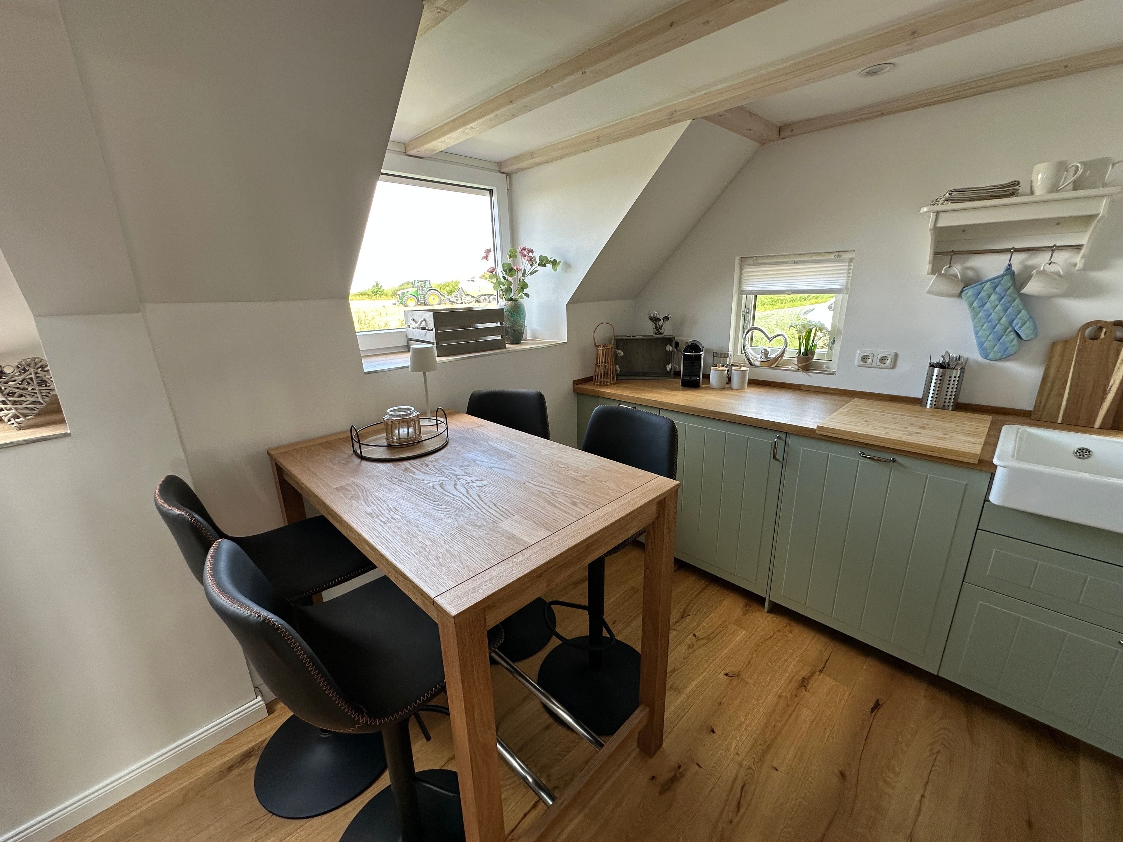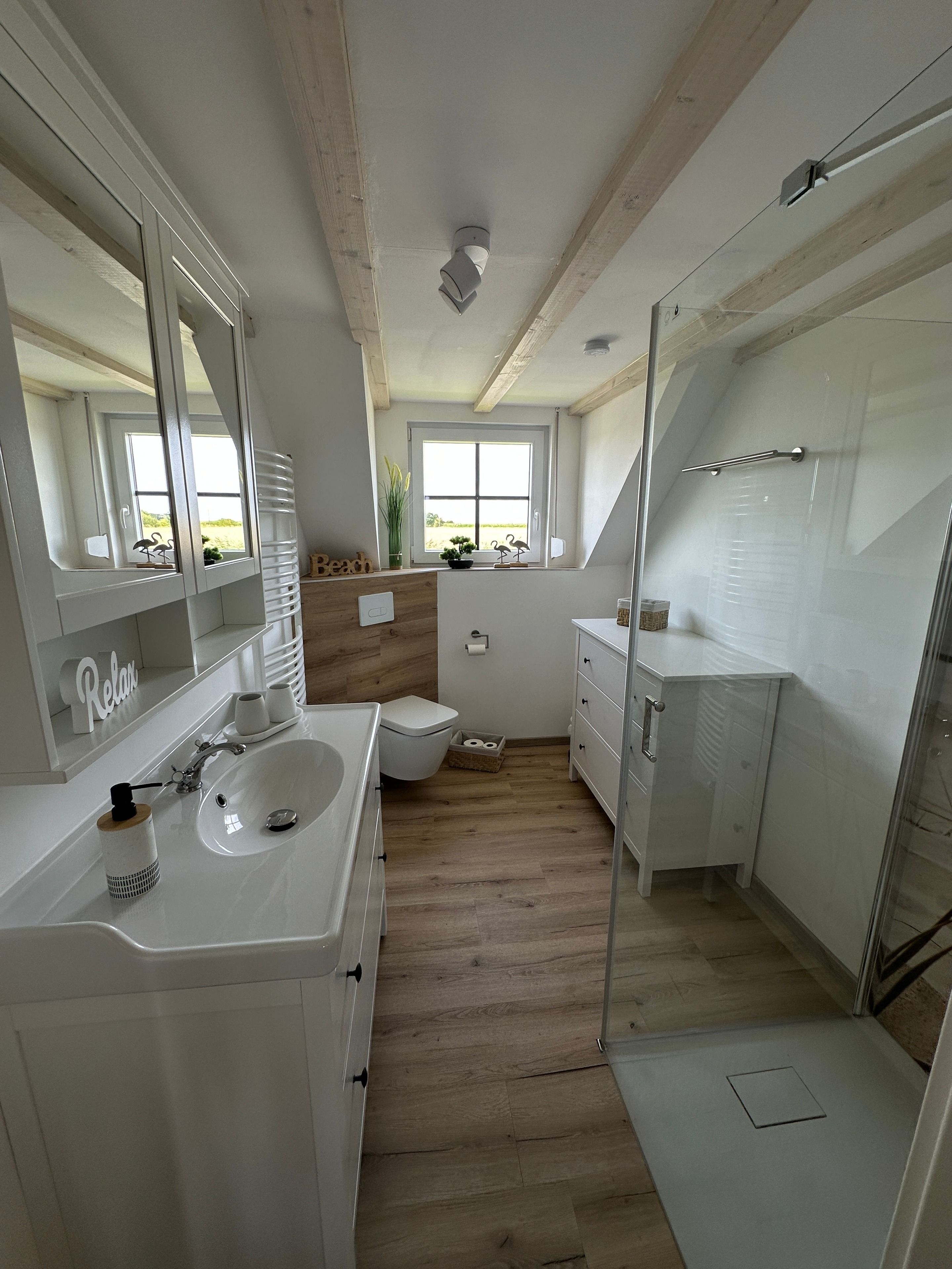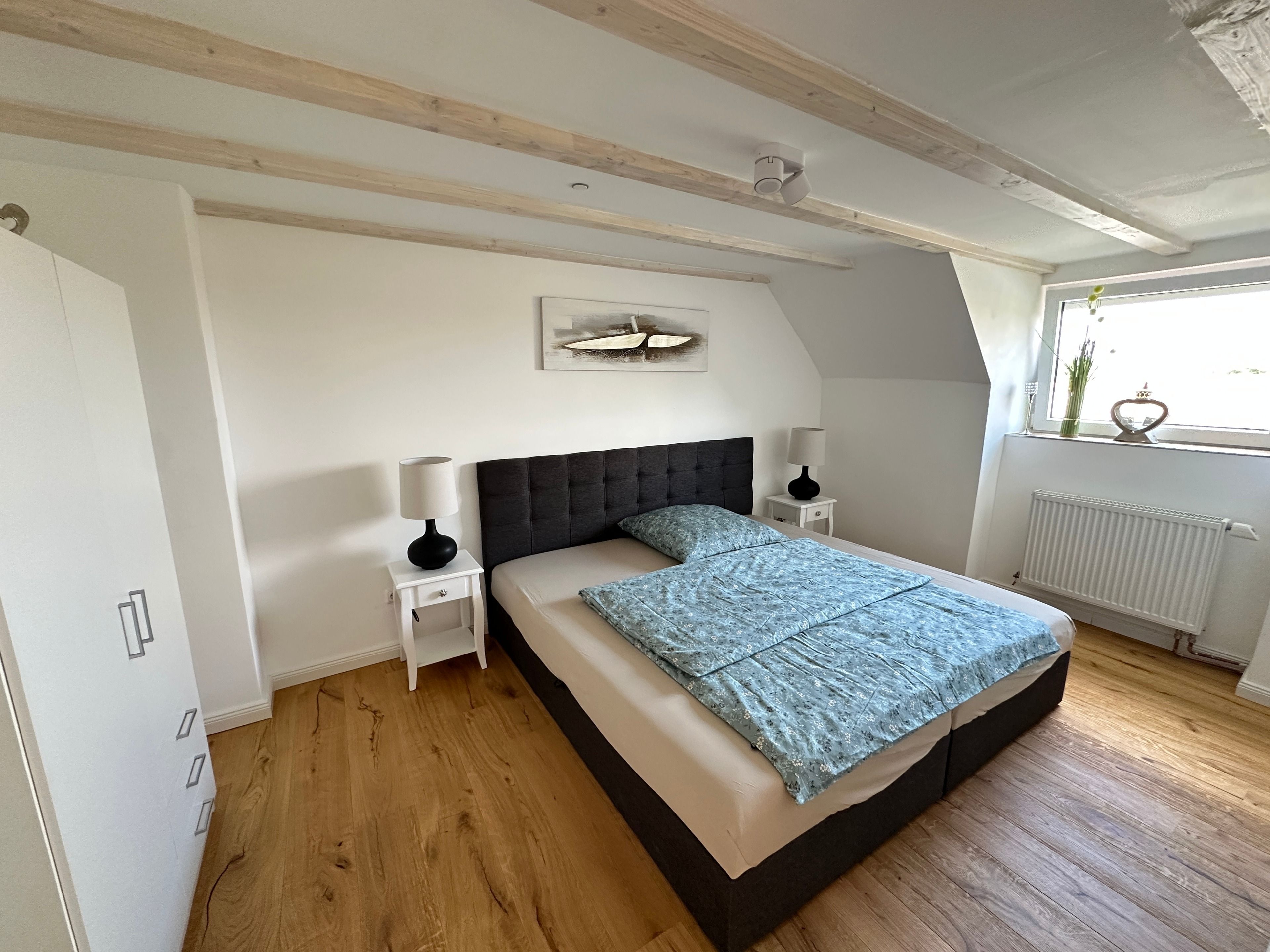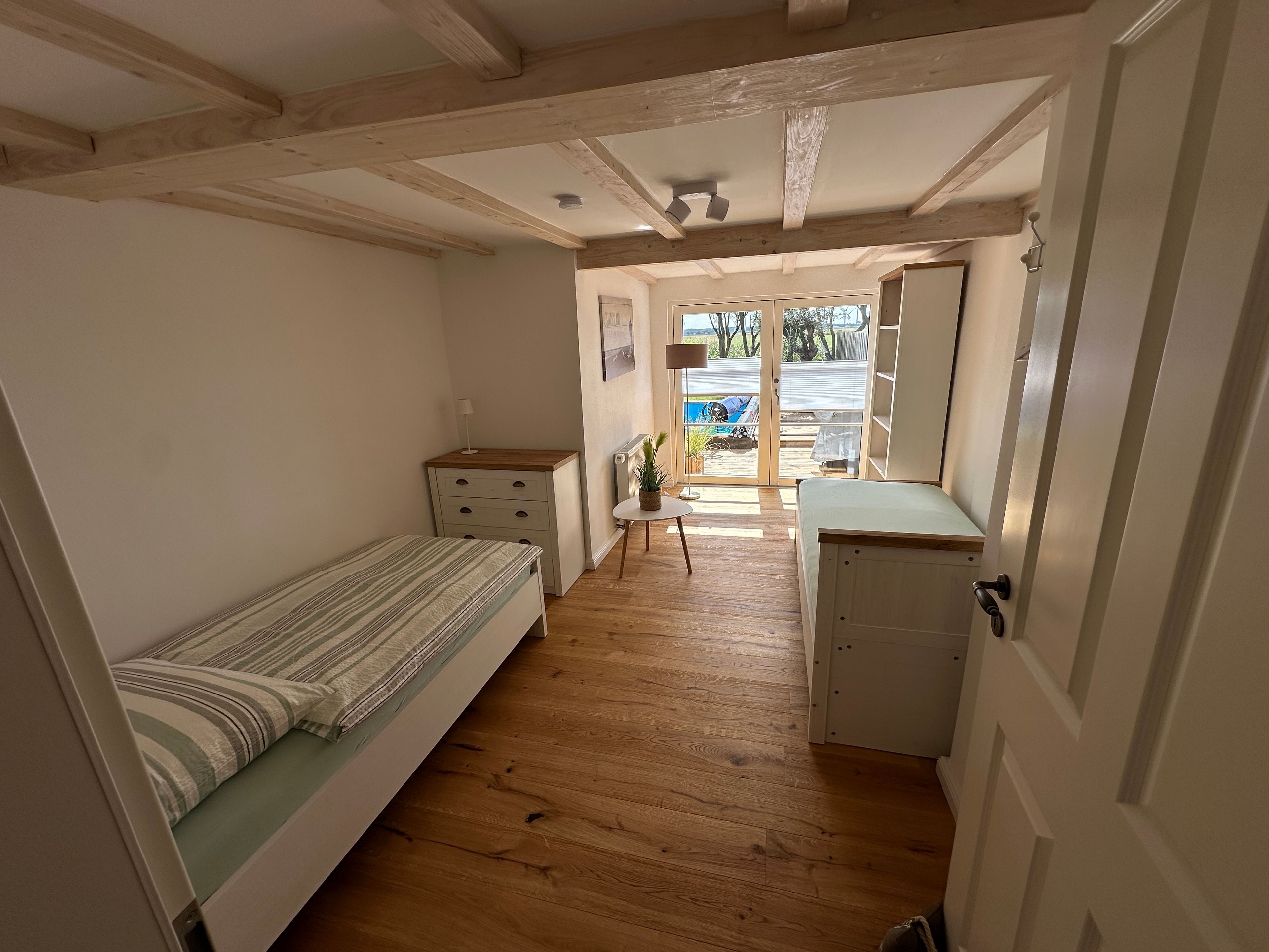 Frisch erstellte Ferienwohnung im Erdgeschoss mit zwei Schlafzimmern, Wohnzimmer, Bad mit Dusche und WC, Küche mit Einbauküche.