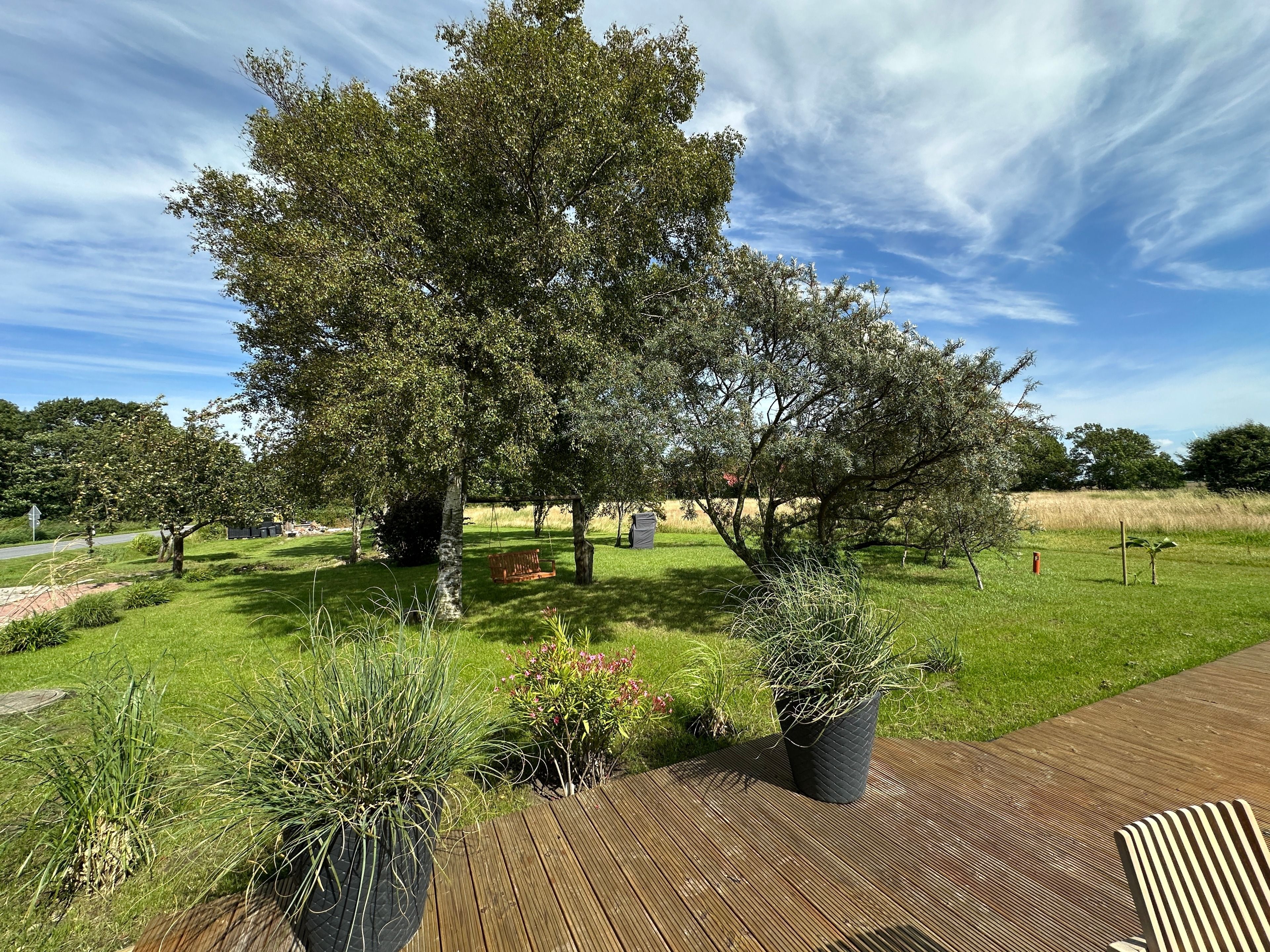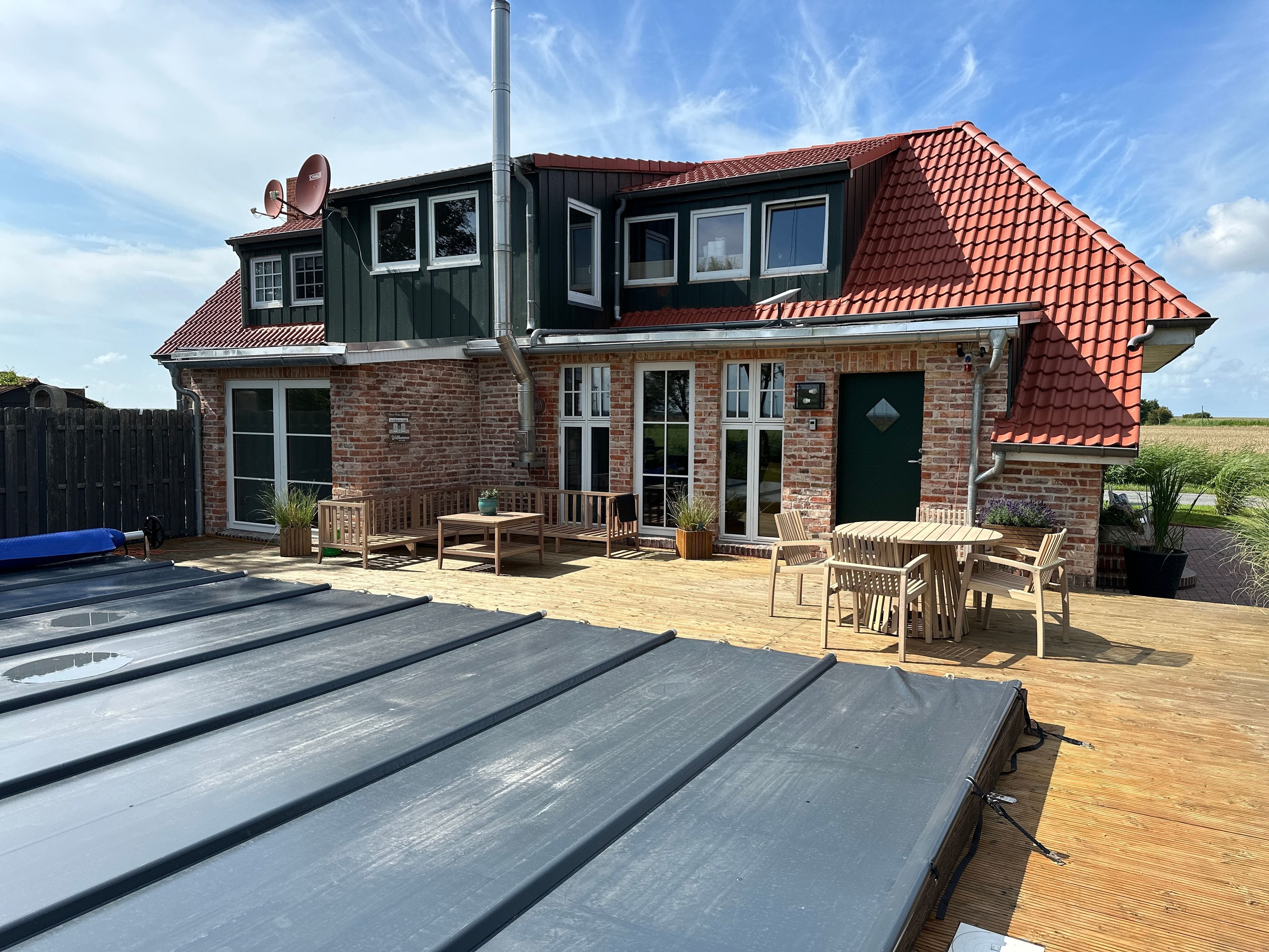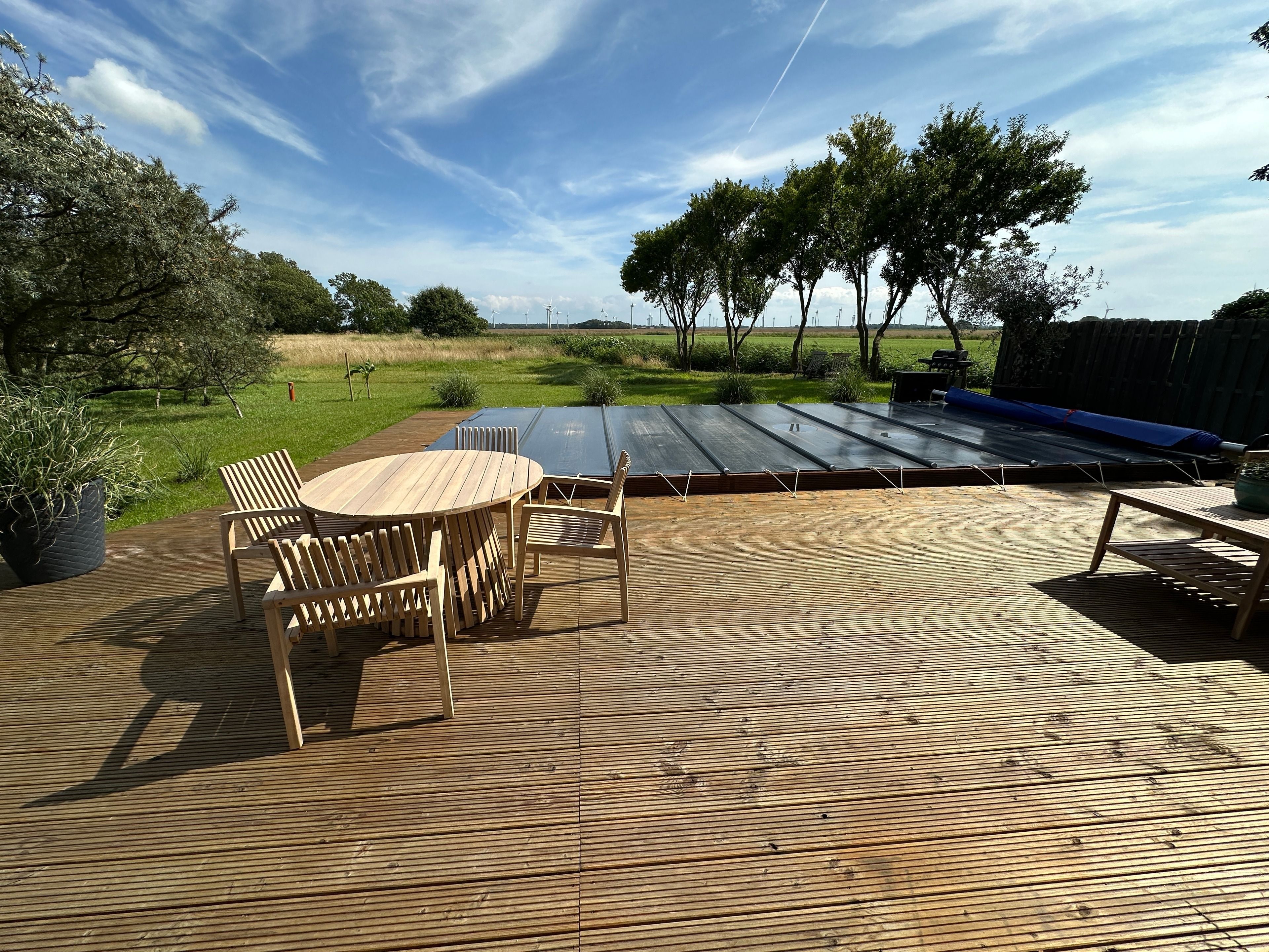 Der Außenbereich lädt mit seiner großzügigen Holzterrasse, die den ganzen Tag über Sonne bietet, zum Entspannen ein. Eine komfortable Lounge-Garnitur, eine Holztischgruppe mit vier Stühlen, zwei Sonnenliegen, ein Strandkorb, eine Hängematte sowie eine Hängebank lassen keinen Wunsch für Ihre Erholung offen. Highlight ist der große, beheizte Pool, der Ihnen von Mai bis Oktober zur Verfügung steht und für erfrischende Momente sorgt. Der etwa 2000 qm große Garten bietet zudem einen befreienden Blick über Felder und Wiesen, während Ihnen drei kostenlose KFZ-Parkplätze direkt am Haus den nötigen Komfort für Ihre Mobilität bieten.