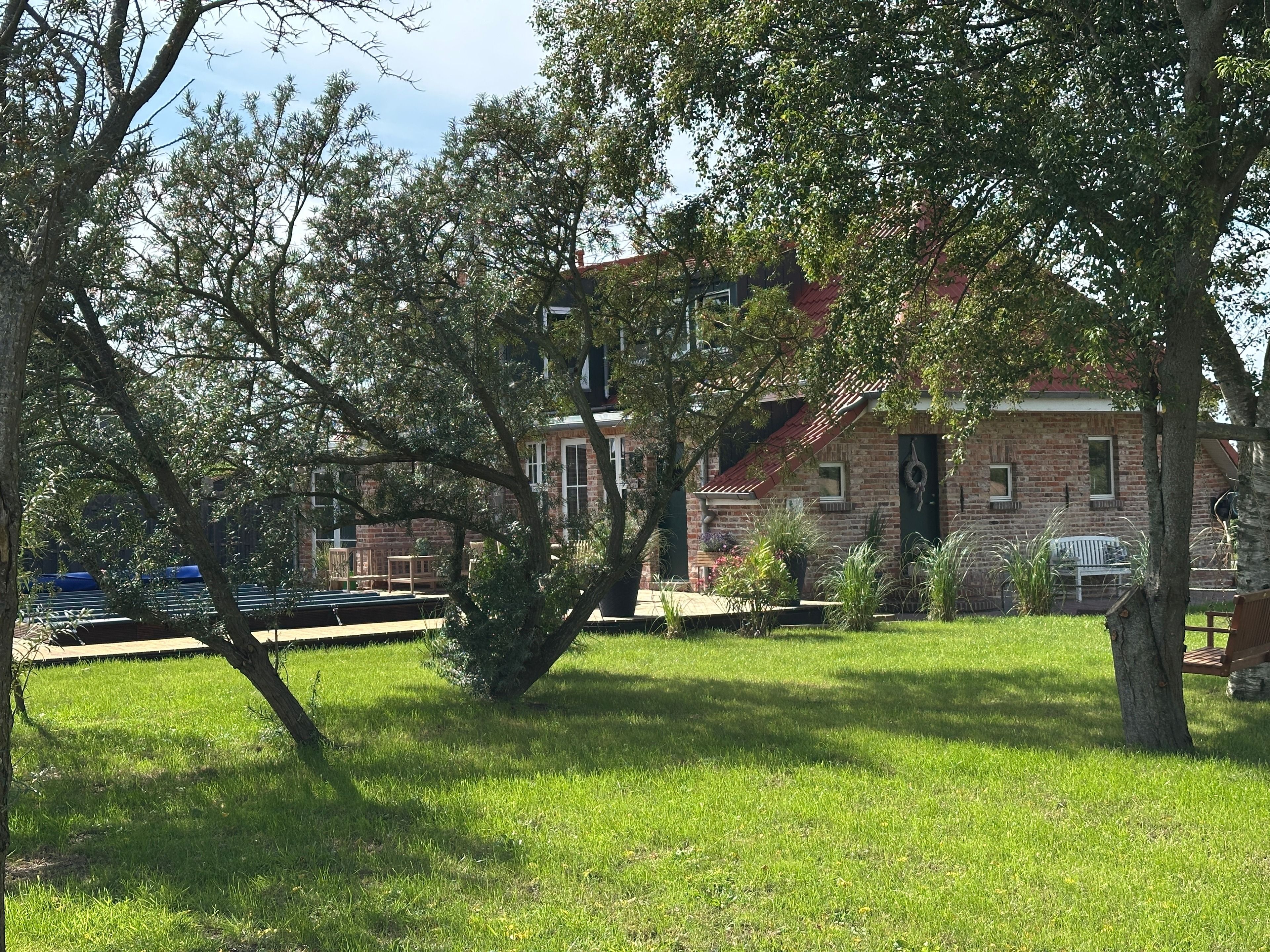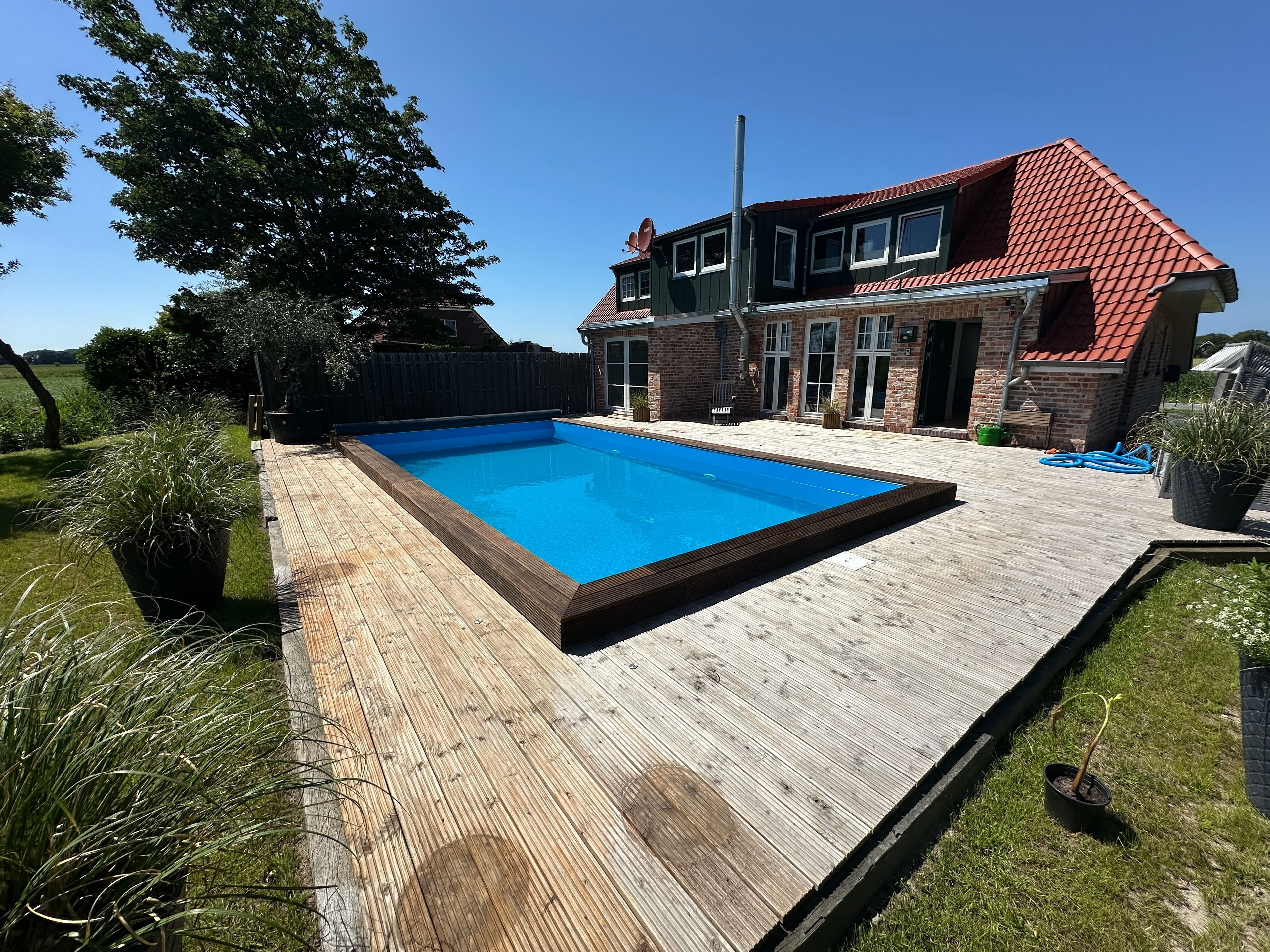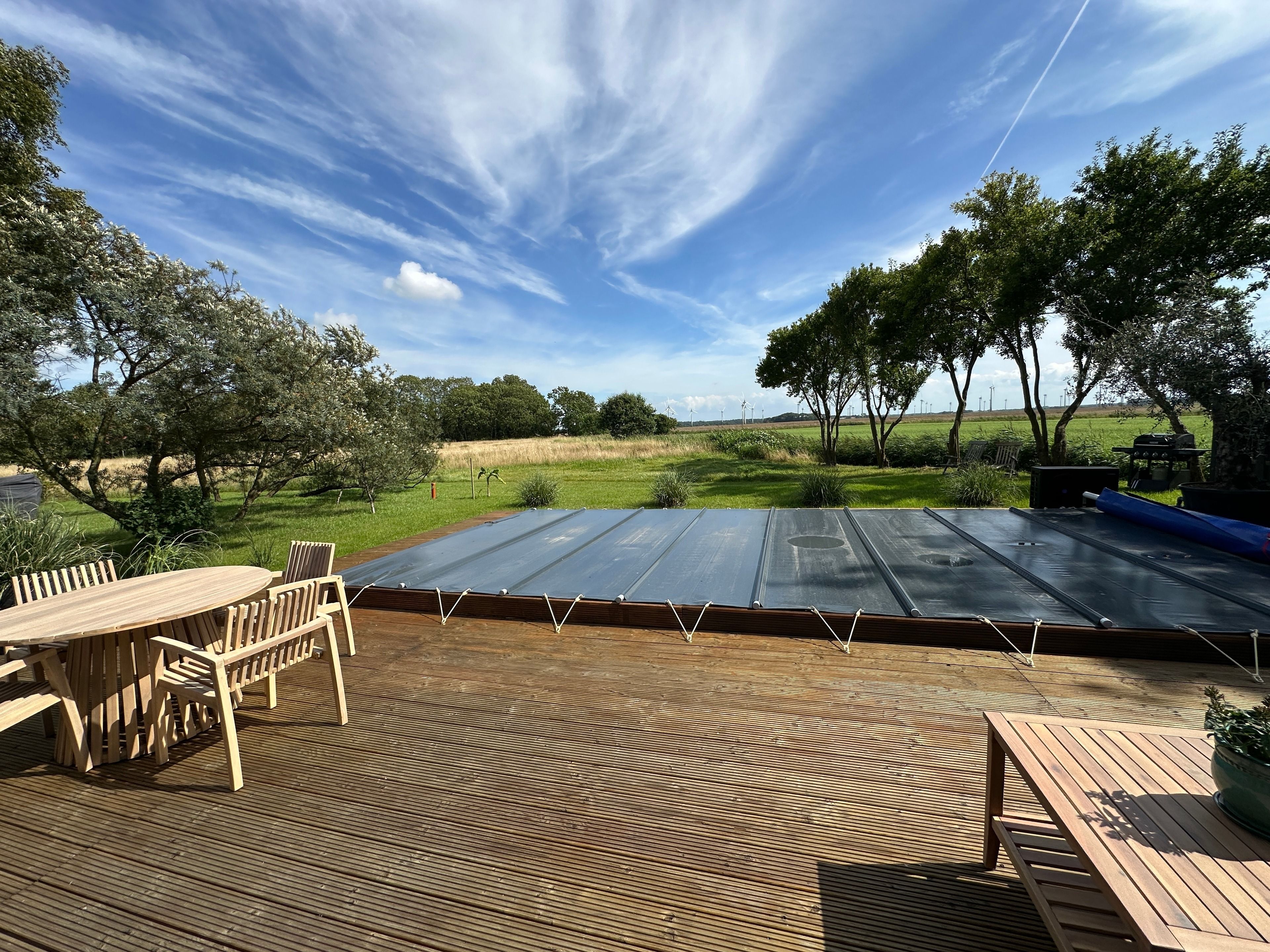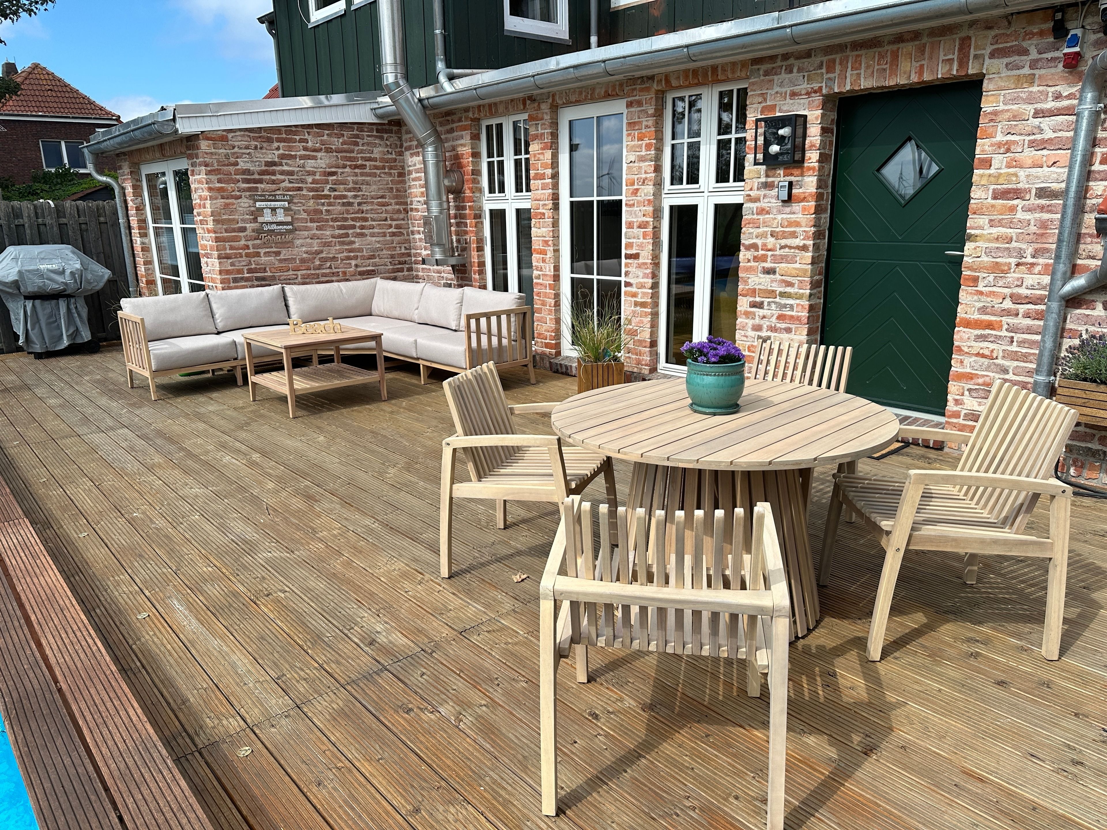 Der Außenbereich lädt mit seiner großzügigen Holzterrasse, die den ganzen Tag über Sonne bietet, zum Entspannen ein. Eine komfortable Lounge-Garnitur, eine Holztischgruppe mit vier Stühlen, zwei Sonnenliegen, ein Strandkorb, eine Hängematte sowie eine Hängebank lassen keinen Wunsch für Ihre Erholung offen. Highlight ist der große, beheizte Pool, der Ihnen von Mai bis Oktober zur Verfügung steht und für erfrischende Momente sorgt. Der etwa 2000 qm große Garten bietet zudem einen befreienden Blick über Felder und Wiesen, während Ihnen drei kostenlose KFZ-Parkplätze direkt am Haus den nötigen Komfort für Ihre Mobilität bieten.