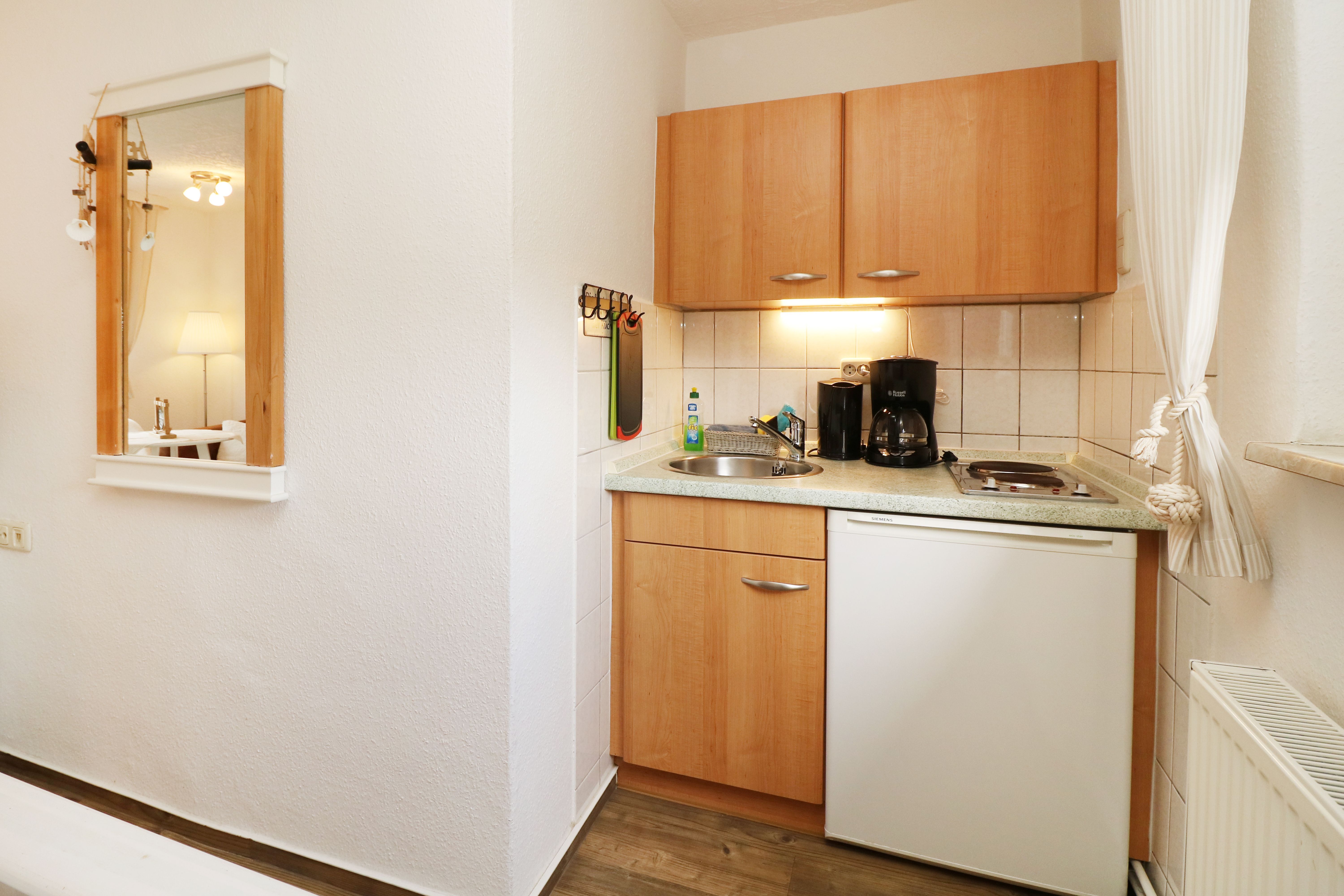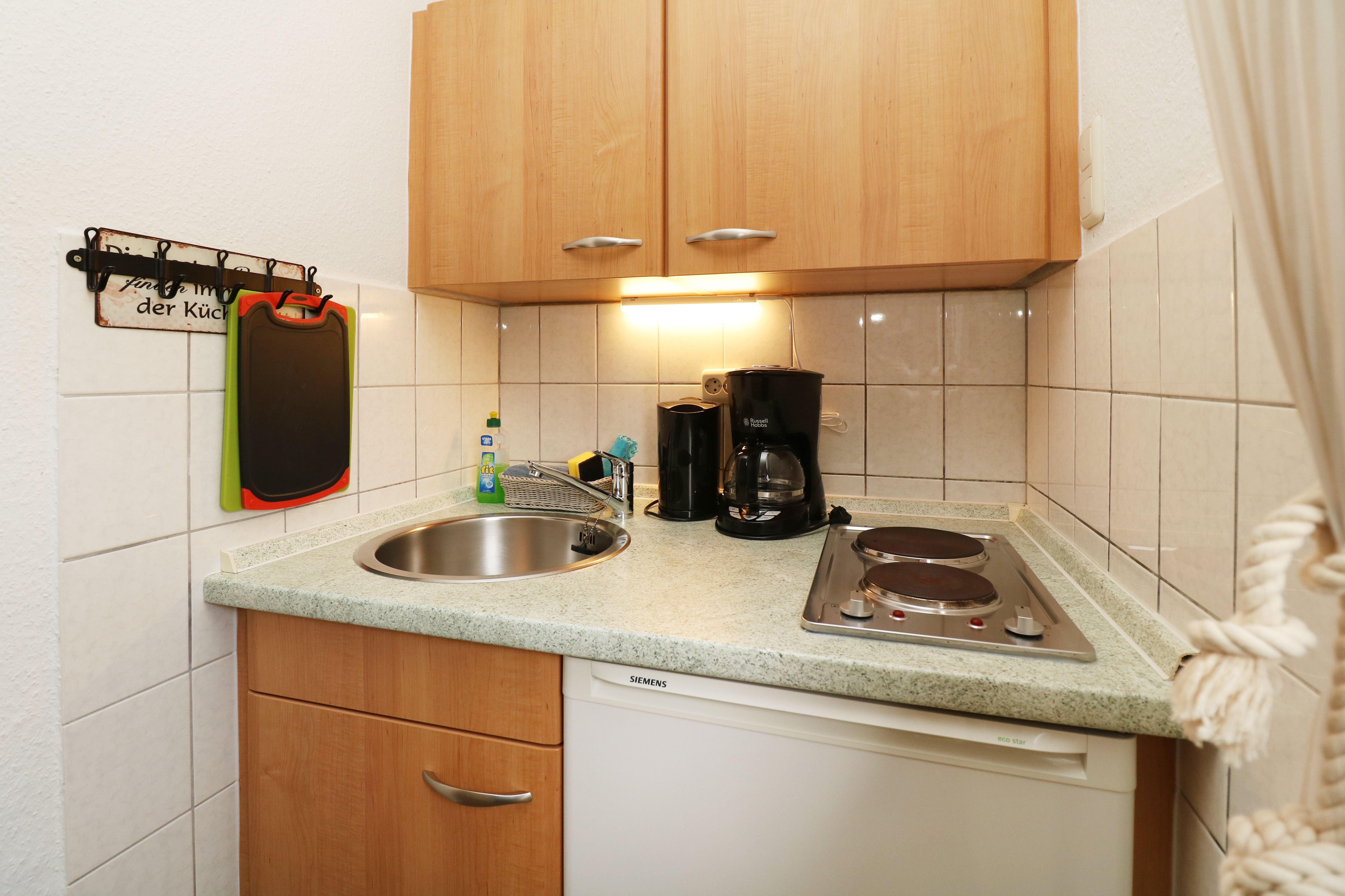 Die Küche ist als Kochnische oder als extra Raum integriert und bietet grundlegende Annehmlichkeiten wie ein Cerankochfeld, einem Kühlschrank mit Gefriermöglichkeit und einer kompletten Küchenausstattung. Dazu gehören auch Kaffeemaschine, Wasserkocher und Toaster.