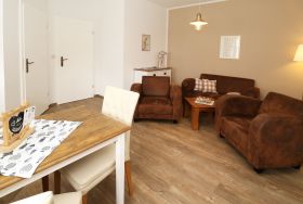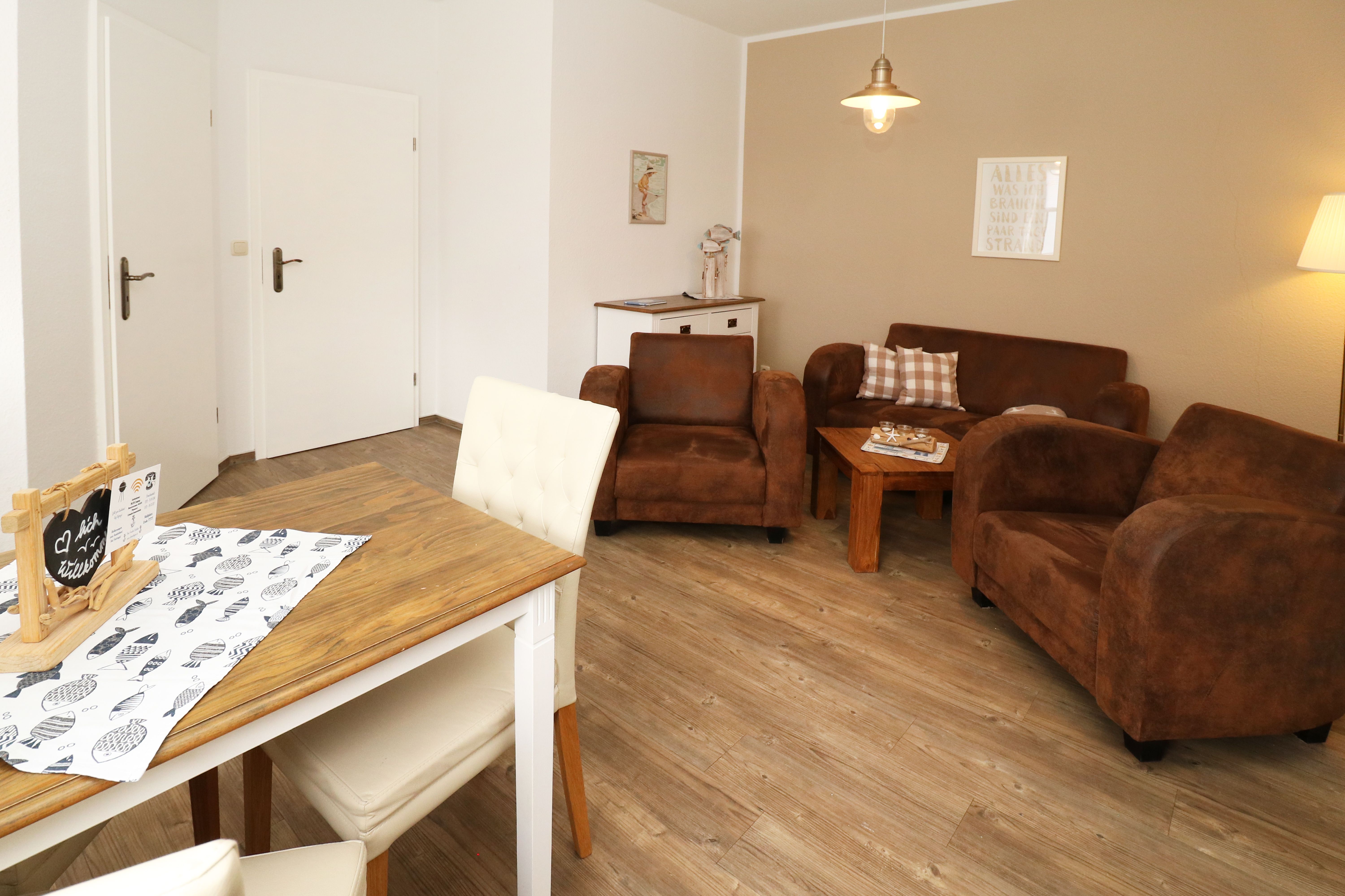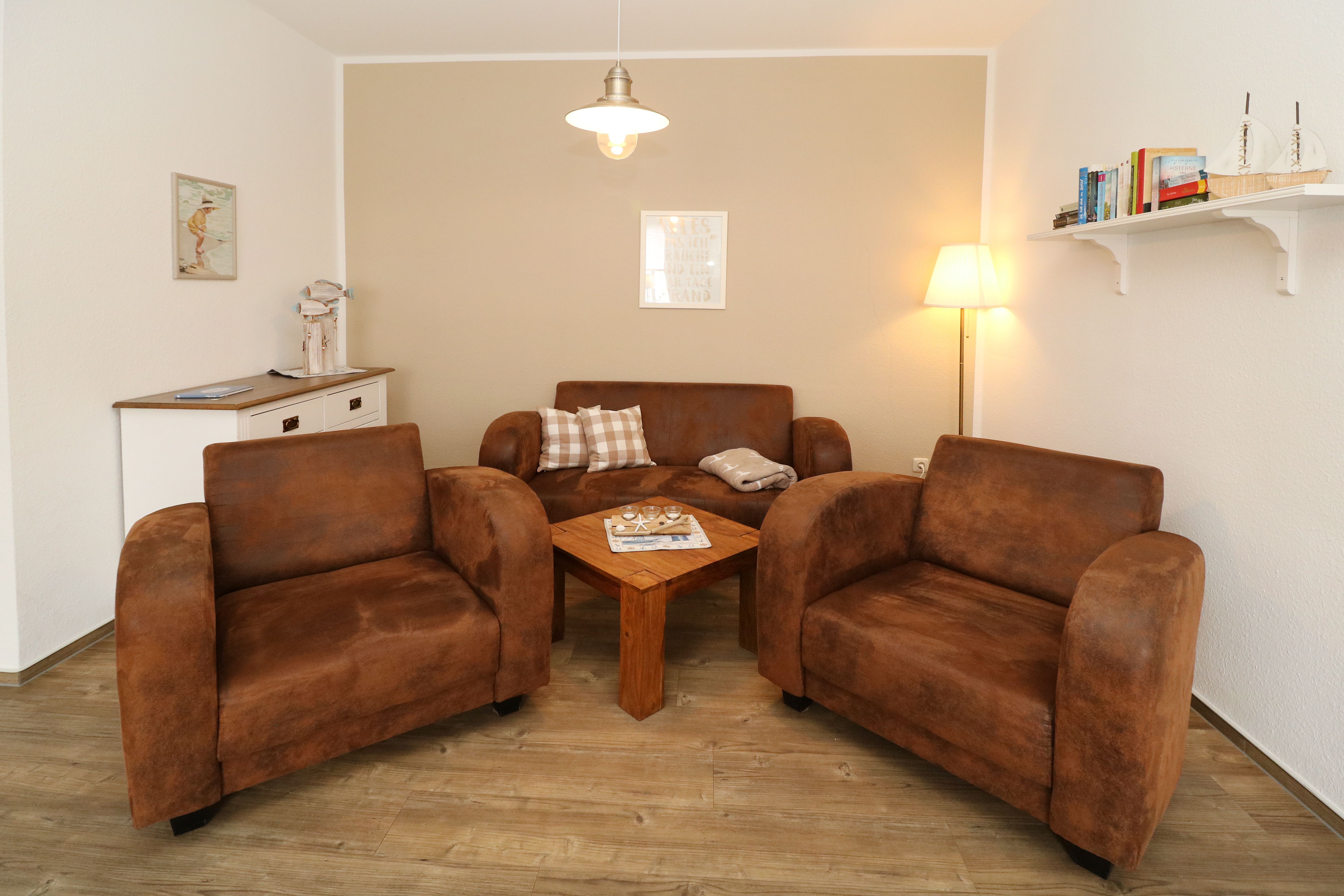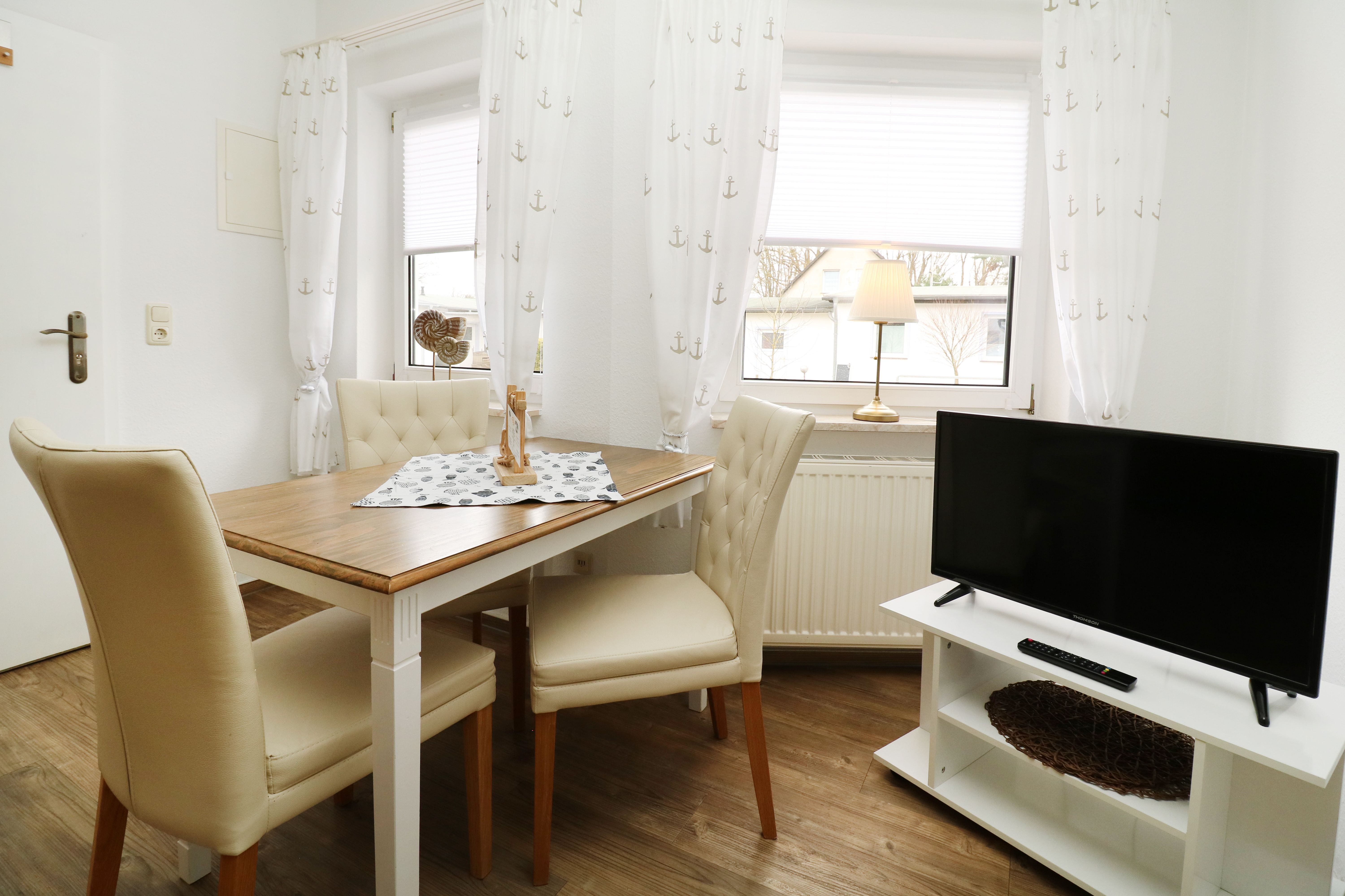 Im Wohnzimmer finden Sie einen gemütlichen Essbereich für drei Personen. Ein bequemes Sofa, zwei Sessel und der TV laden zum Entspannen ein.