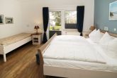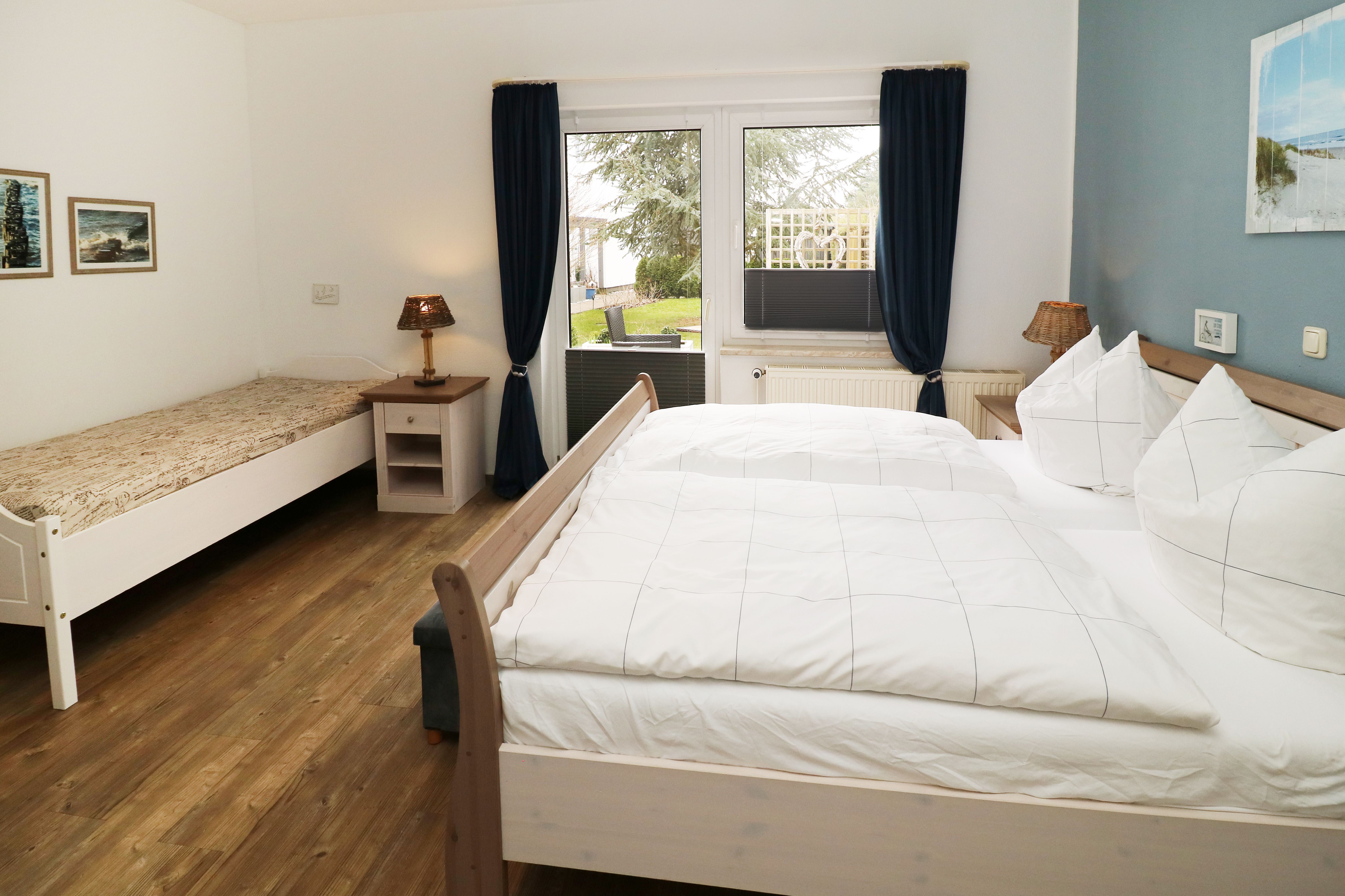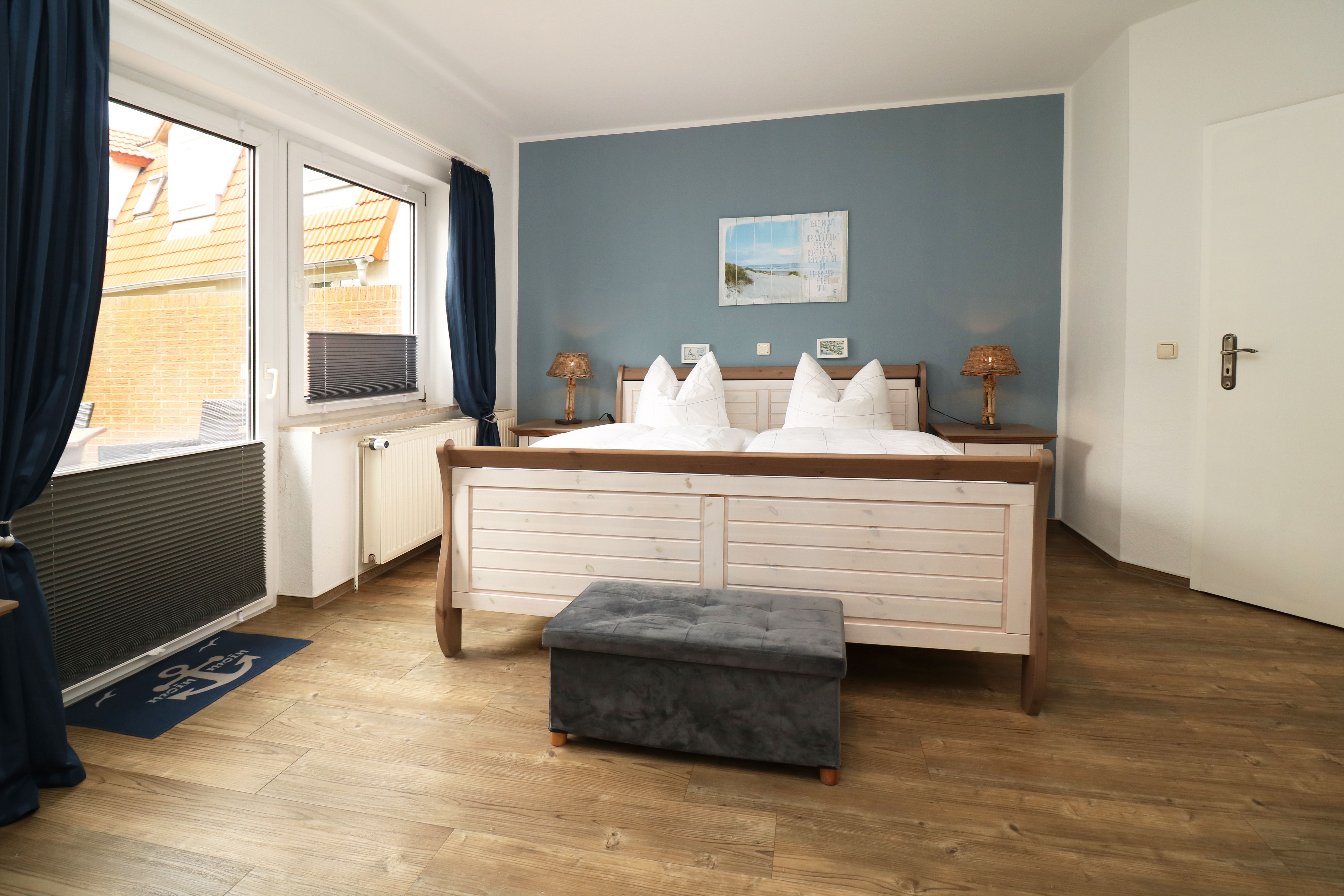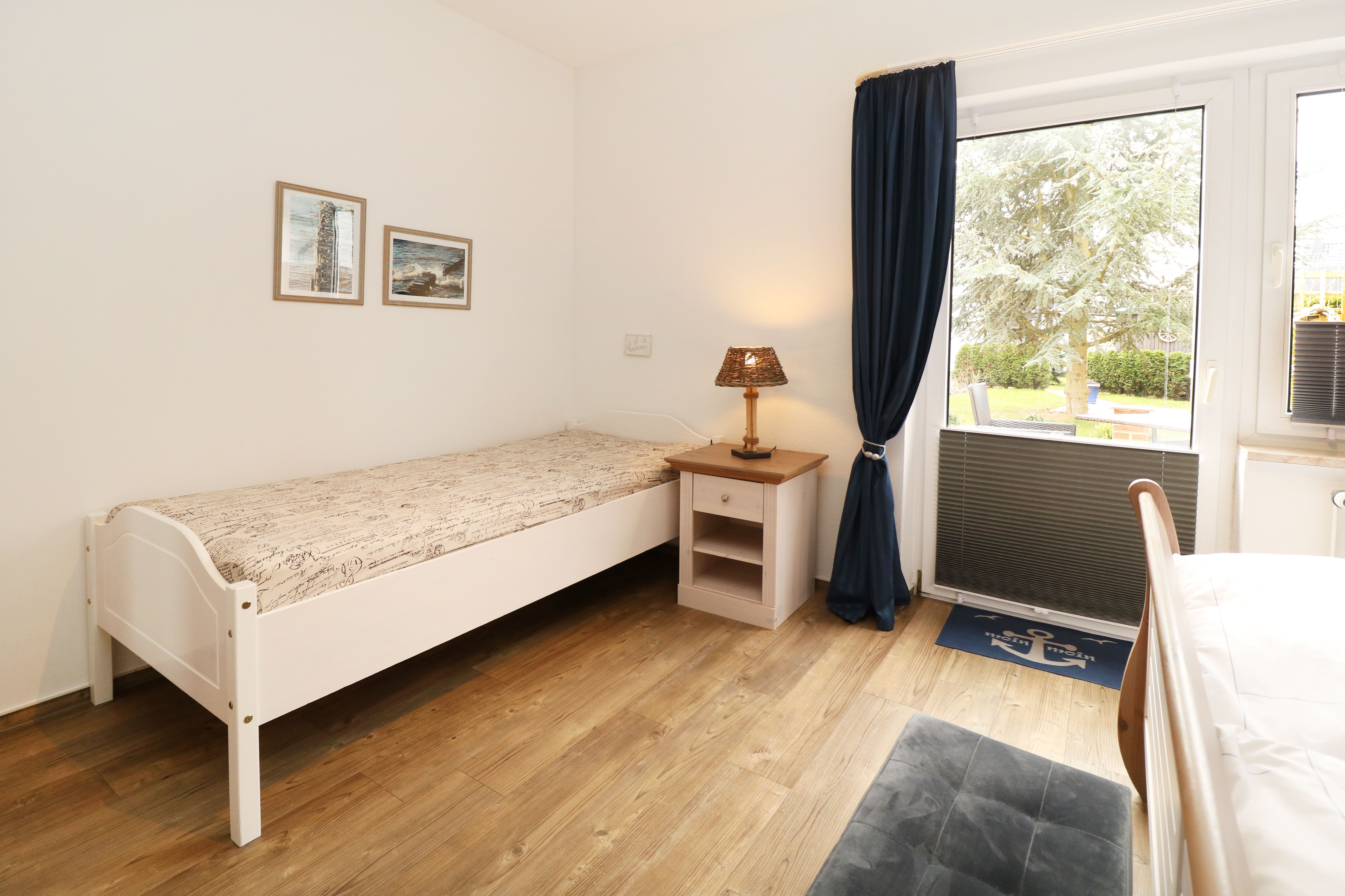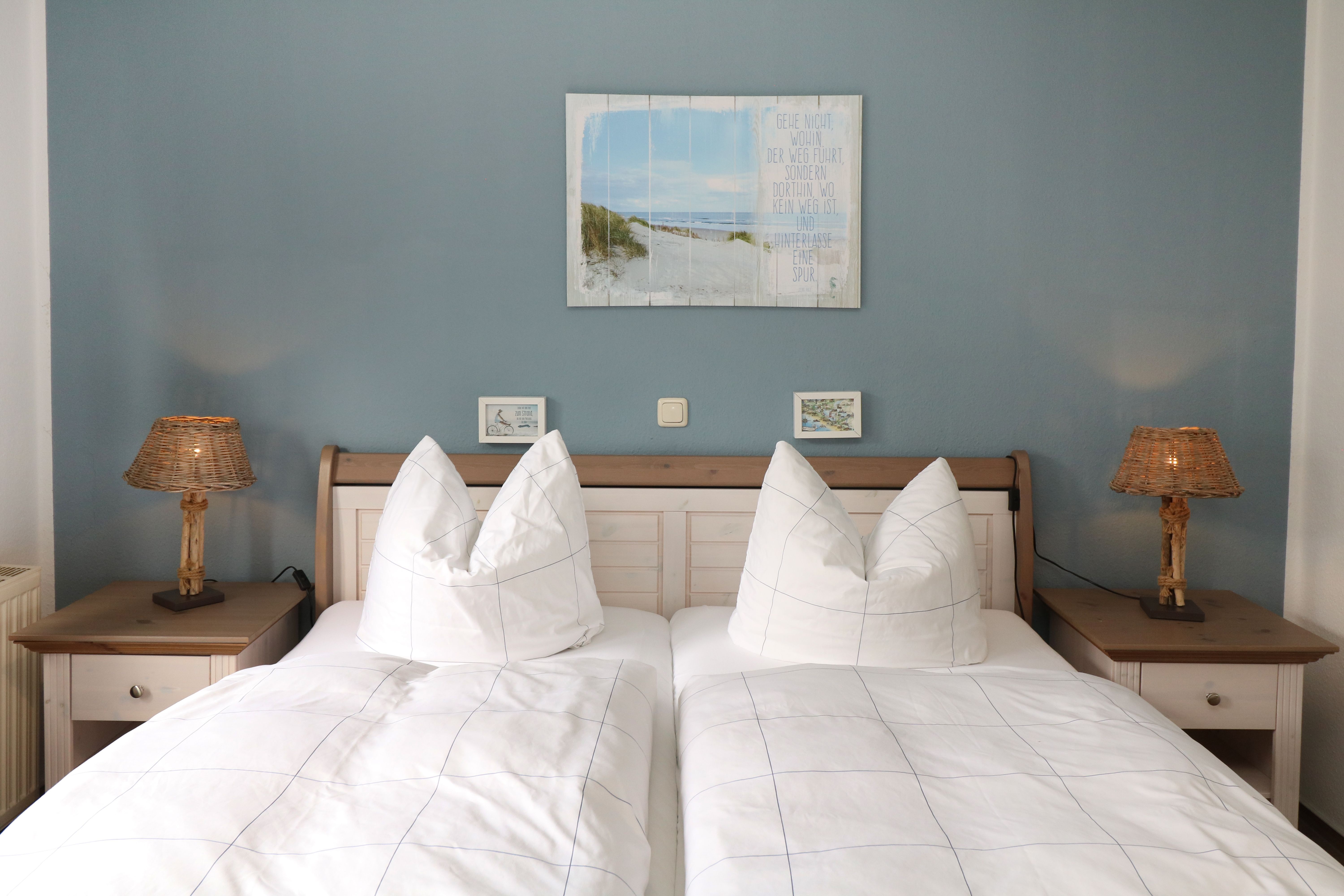 Das maritim eingerichtete Schlafzimmer verfügt über ein Doppelbett (180x200cm) sowie über ein Einzelbett (90x200cm) -