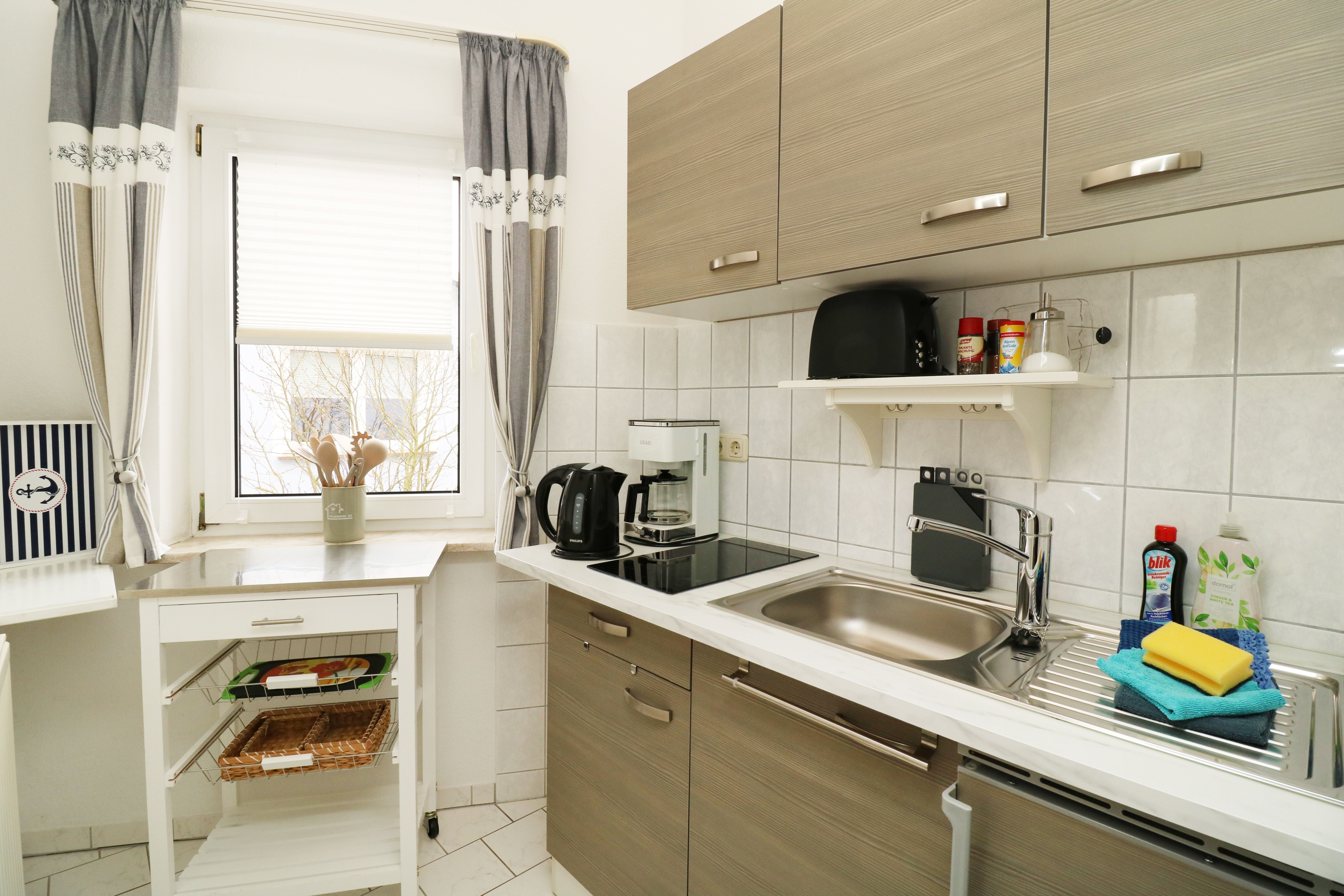 einem Kühlschrank mit Gefriermöglichkeit und einer kompletten Küchenausstattung. Dazu gehören auch Kaffeemaschine, Wasserkocher und Toaster.