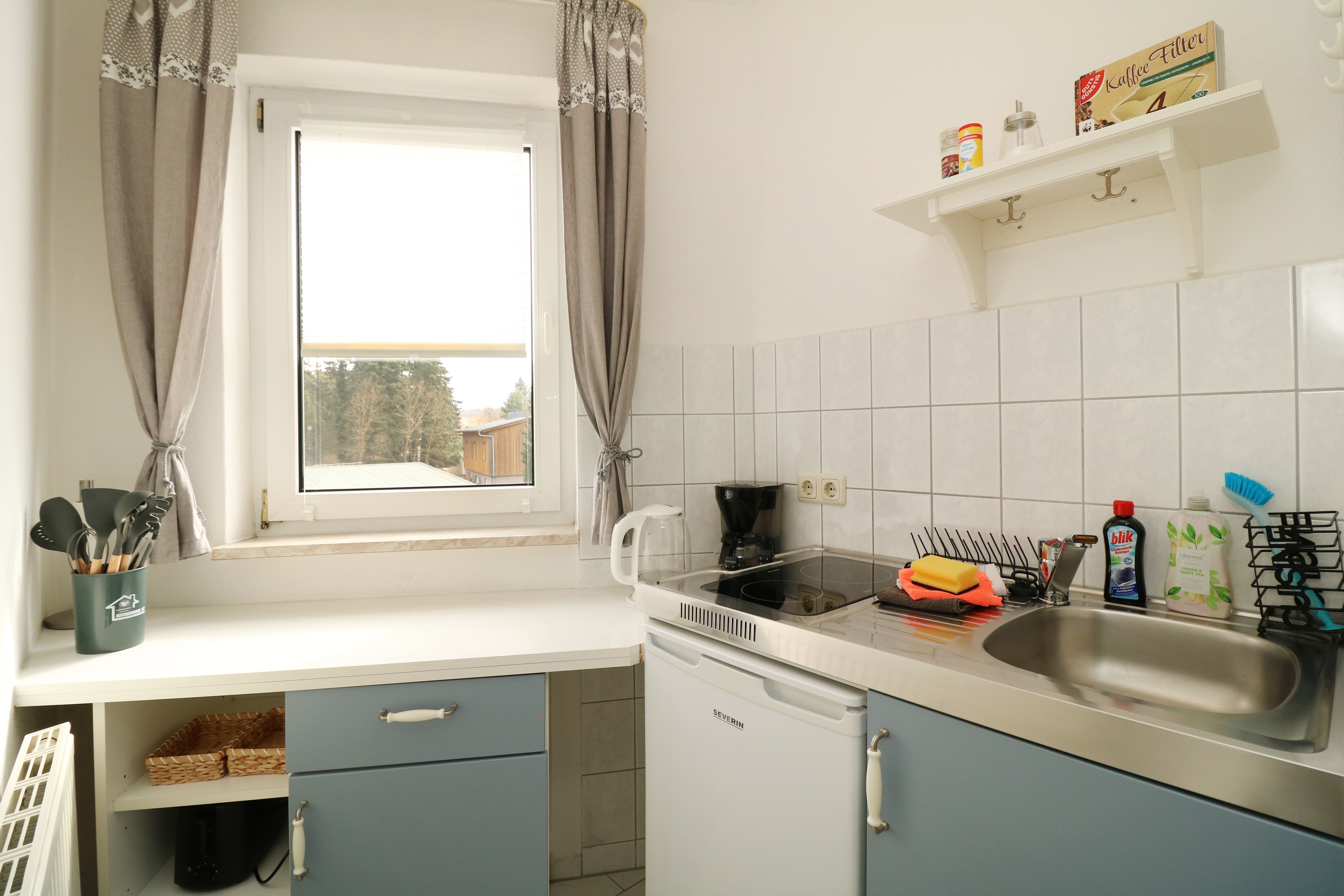 einem Kühlschrank mit Gefriermöglichkeit und einer kompletten Küchenausstattung. Dazu gehören auch Kaffeemaschine, Wasserkocher und Toaster.