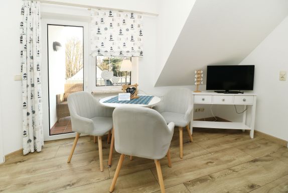 Im Wohnzimmer finden Sie einen gemütlichen Essbereich für drei Personen. Ein bequemes Sofa, ein Sessel und der TV laden zum Entspannen ein.
