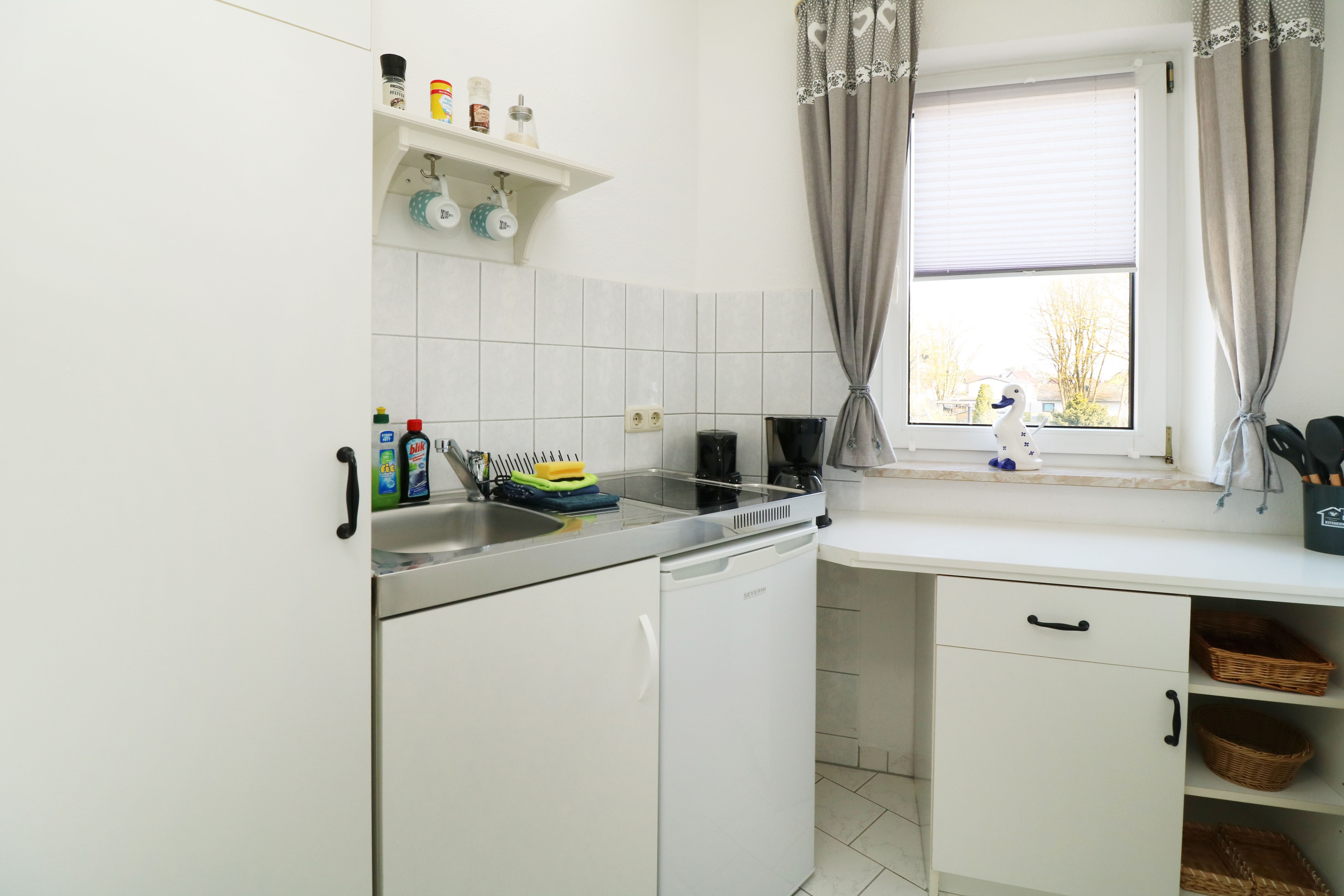 einem Kühlschrank mit Gefriermöglichkeit und einer kompletten Küchenausstattung. Dazu gehören auch Kaffeemaschine, Wasserkocher und Toaster.