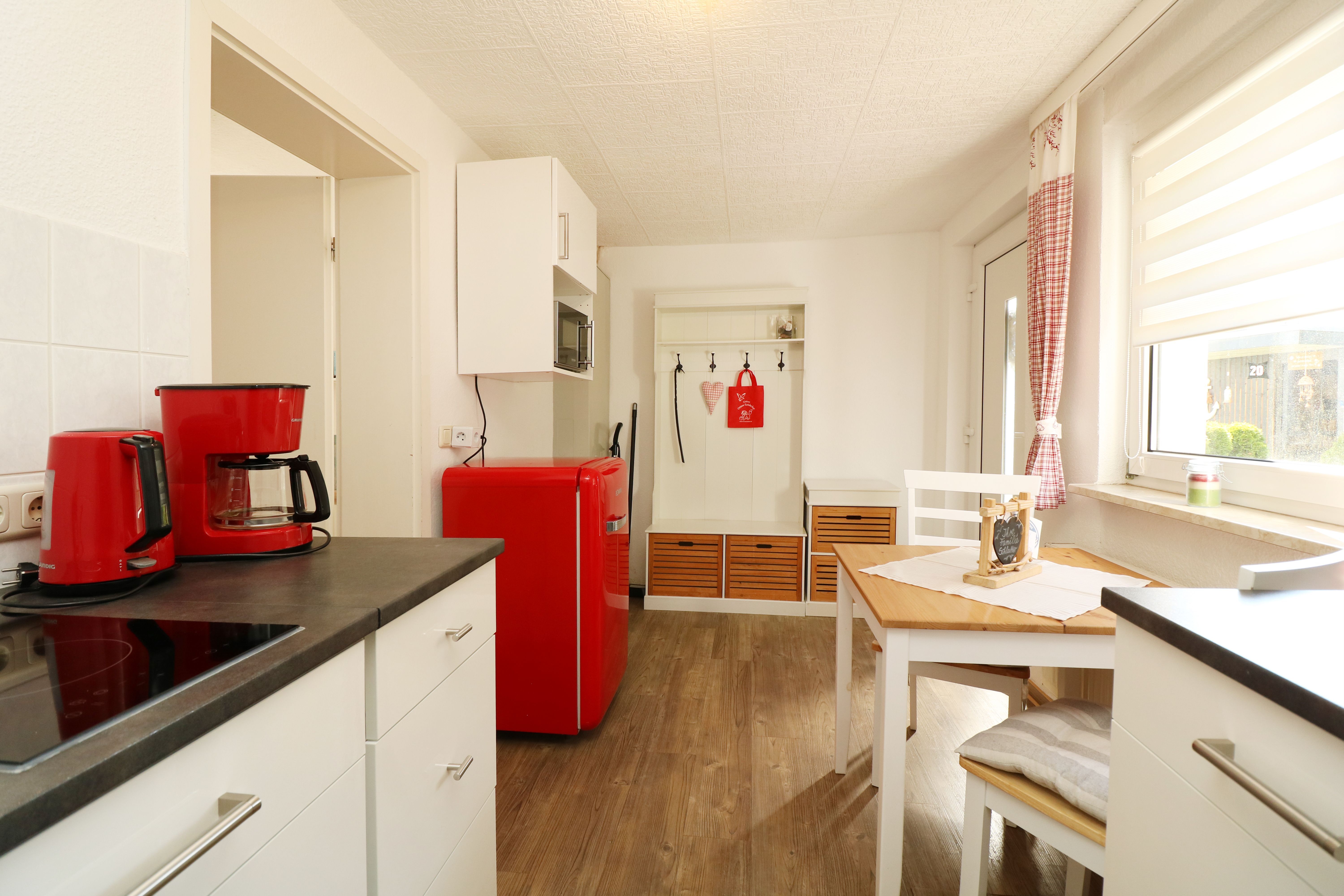 wie ein Cerankochfeld, ein Kühlschrank und einer kompletten Küchenausstattung. Dazu gehören auch Kaffeemaschine, Wasserkocher und Toaster.