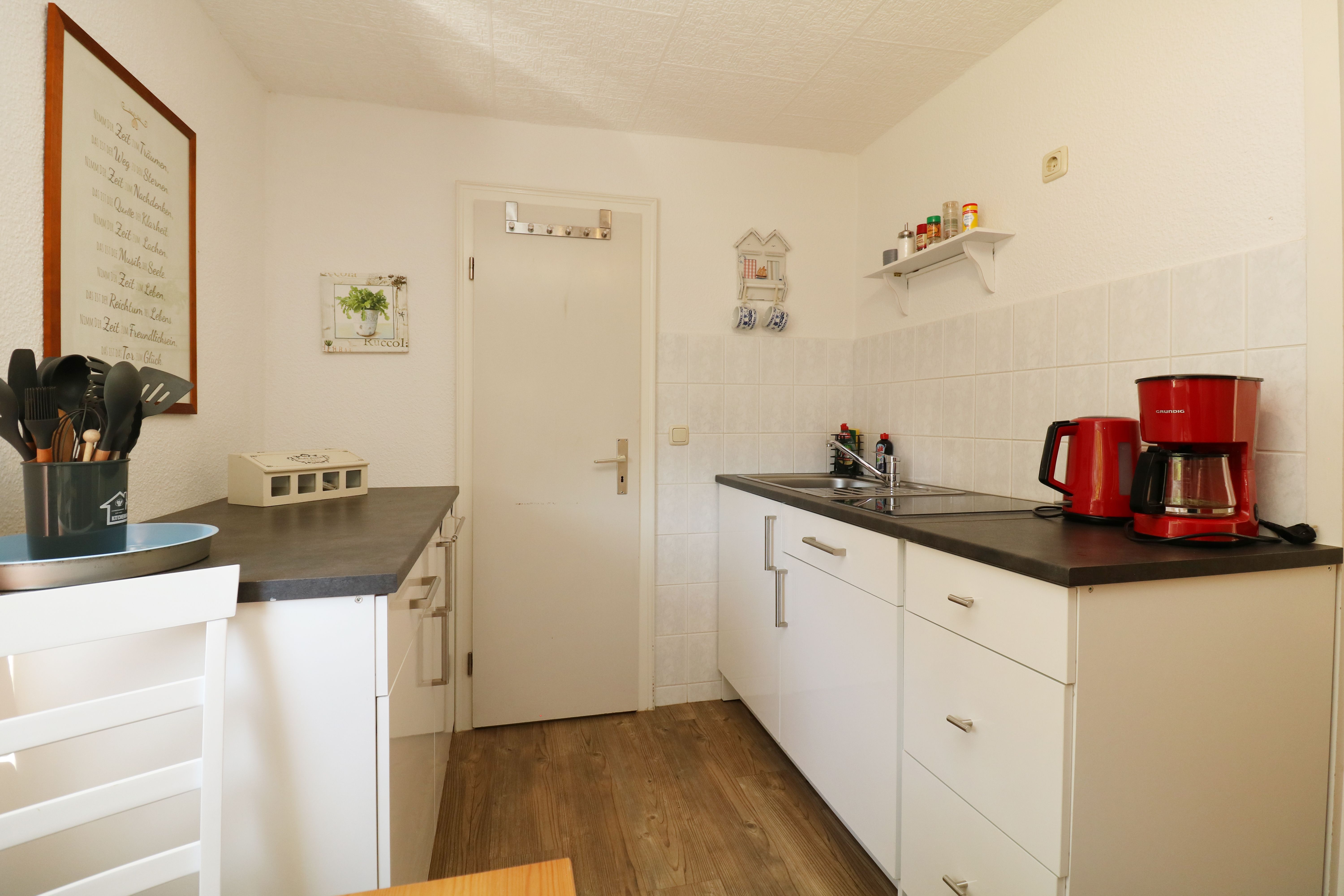 Die moderne Küchenzeile ist im angrenzendem Wohnraum integriert und bietet grundlegende Annehmlichkeiten