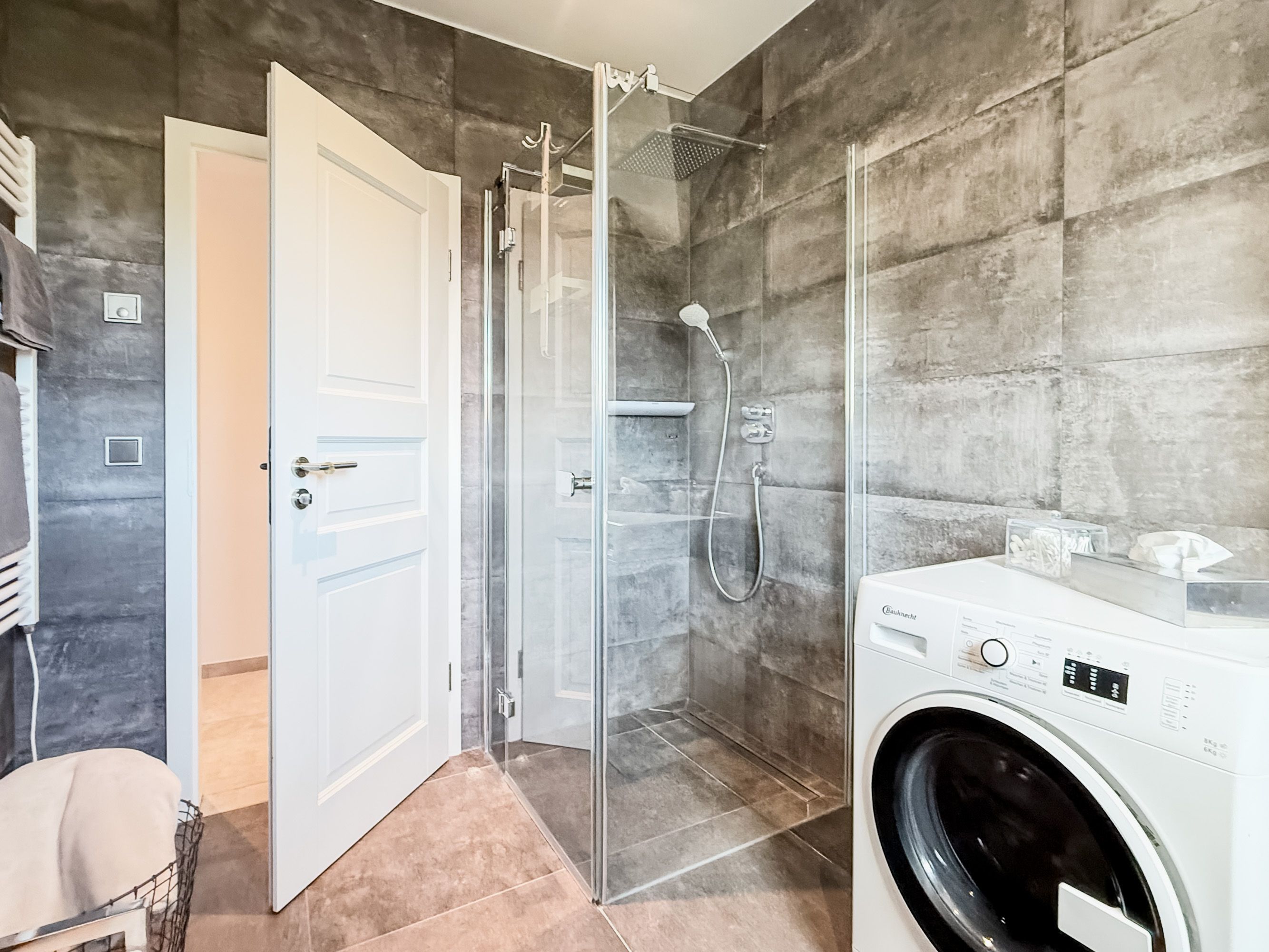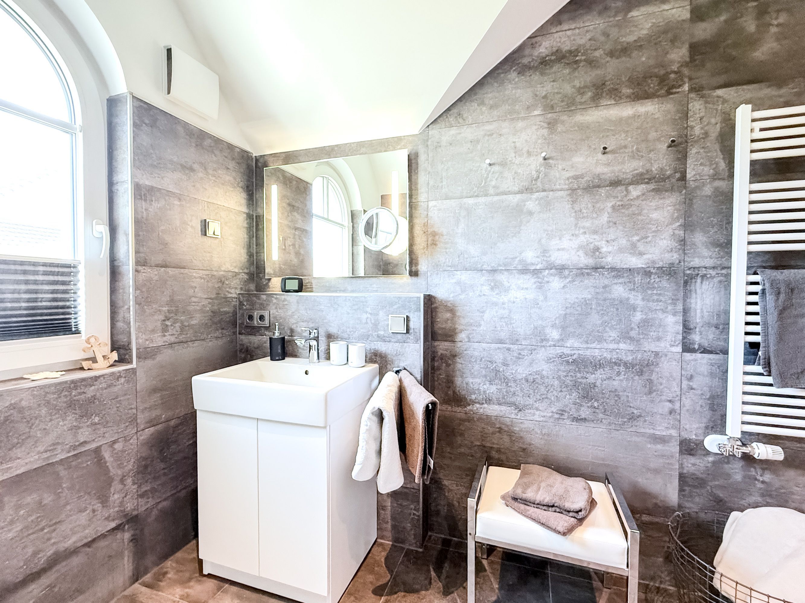 • Modernes Bad: Ebenerdige Dusche, Handtuchtrockner, Föhn, Fußbodenheizung