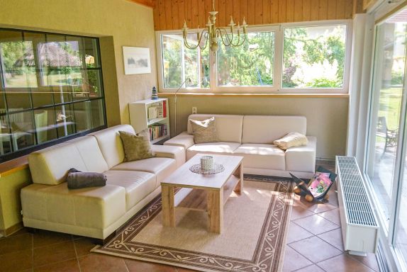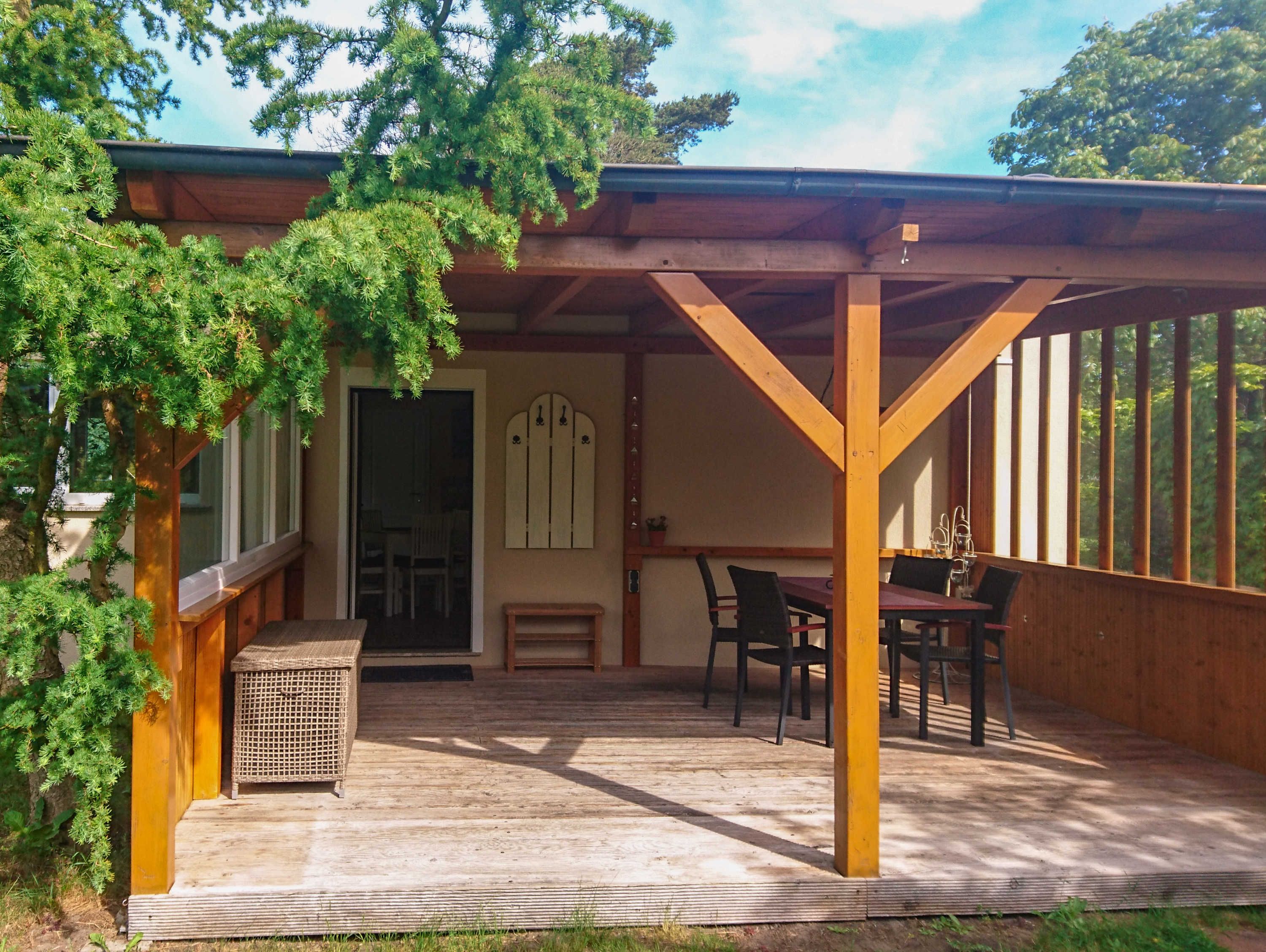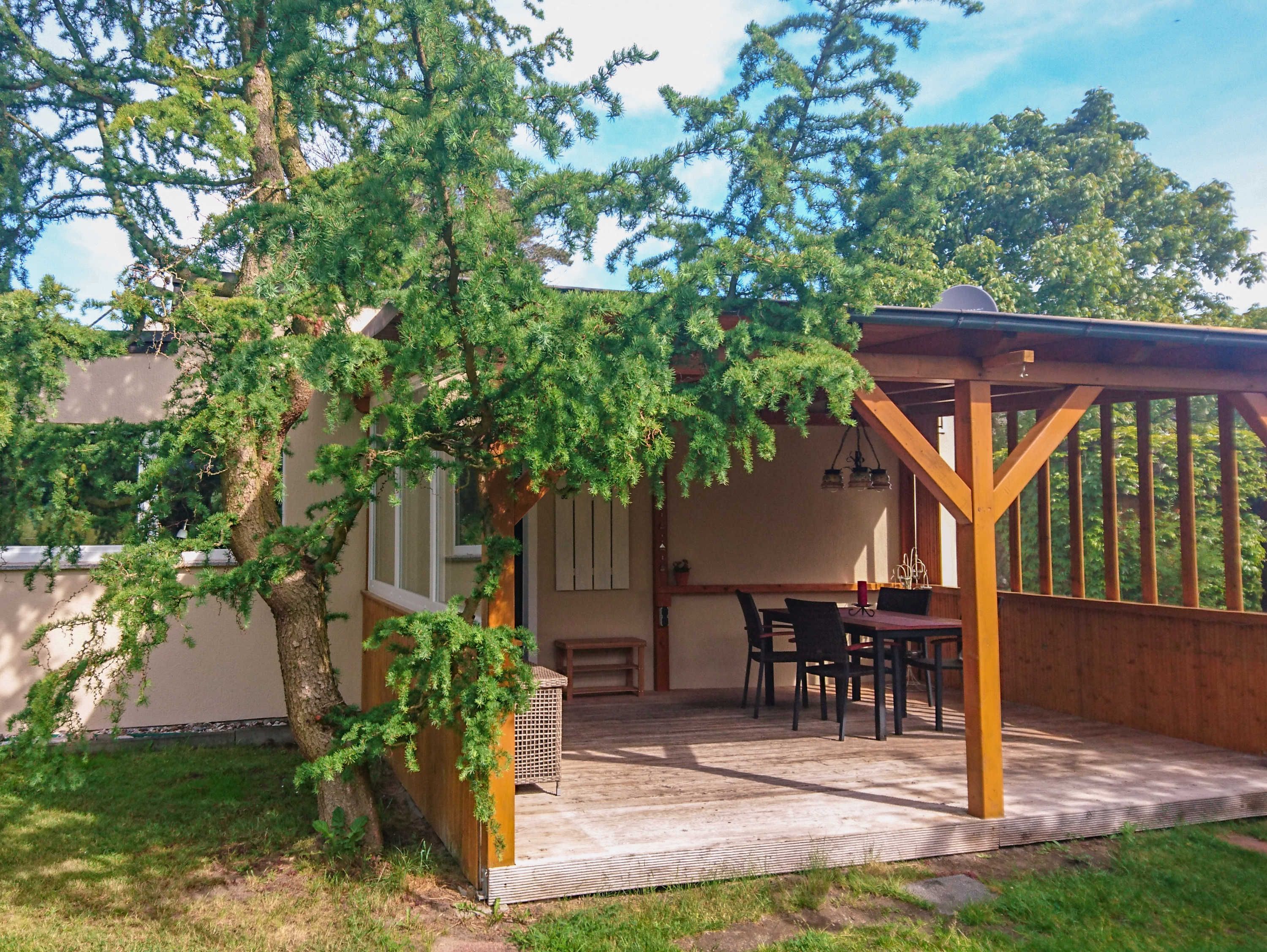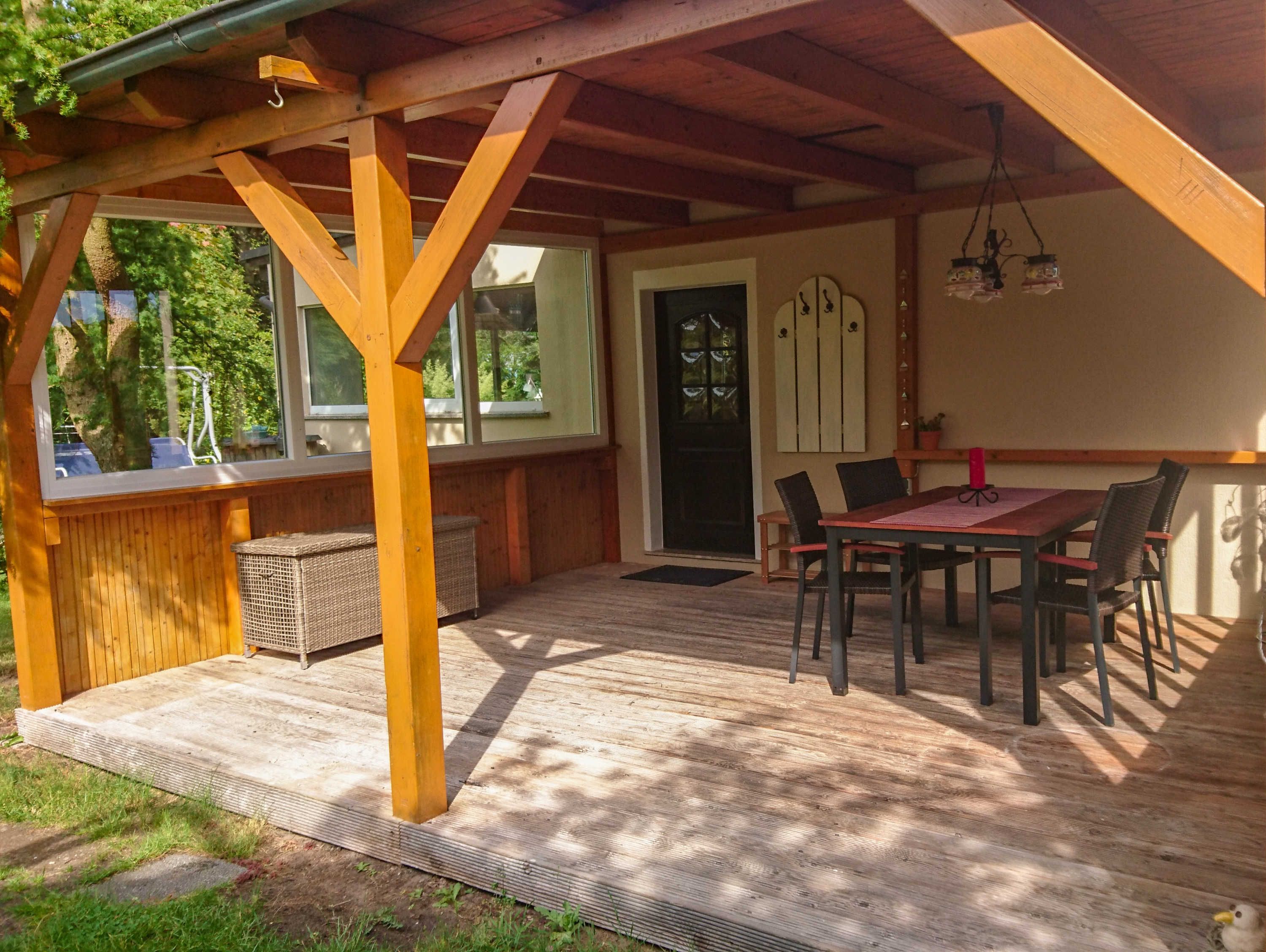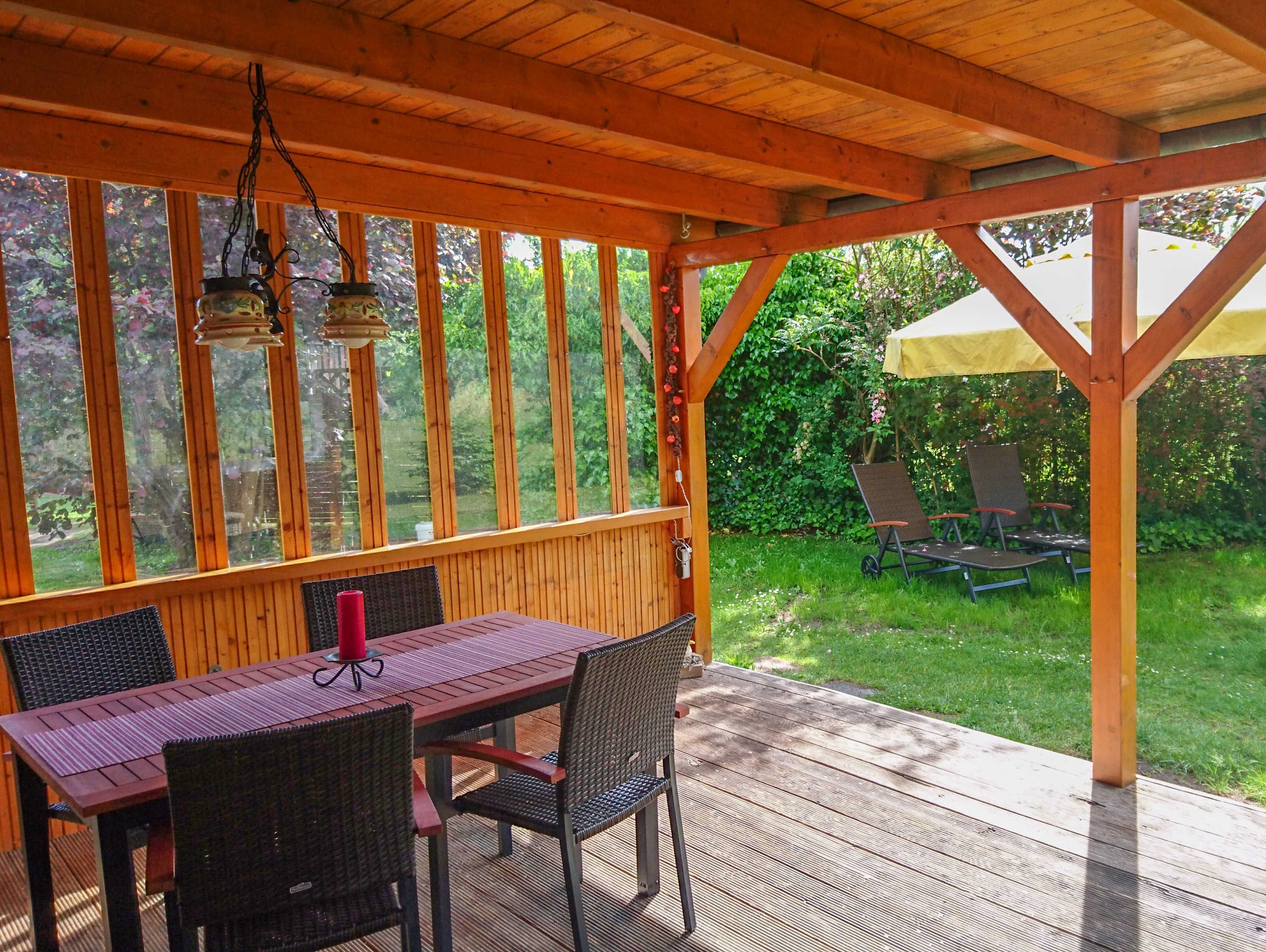 Von der Küche aus zugänglich ist die offene, überdachte Terrasse mit Sitzgelegenheiten. Im Garten stehen den Gästen Sonnenliegen, ein Sonnenschirm und ein Grill zur Verfügung, außerdem weitere Sitzgelegenheiten z.B. Hollywoodschaukel. Für Kinder gibt es eine Schaukel und vor allem ausreichend Platz zum Spielen.