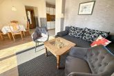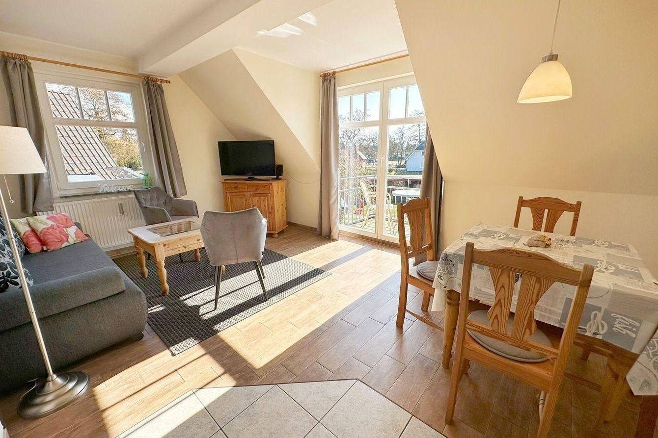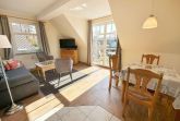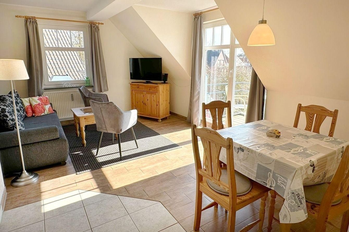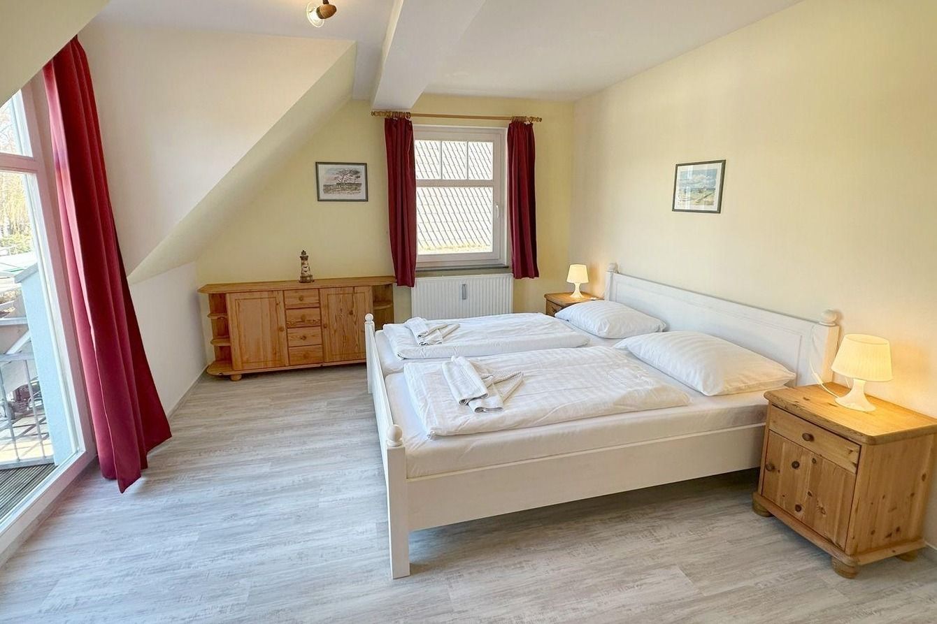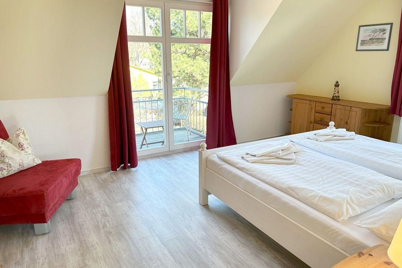 In der Wohnung finden Sie ein Schlafzimmer mit Doppelbett, Kleiderschrank und einen Zugang zum Balkon (Nord). Für die dritte Person gibt es hier auch eine Aufbettungsmöglichkeit (Einzelliege). Im Wohnzimmer mit Sat-TV hat bei Bedarf eine weitere Person einen Schlafplatz auf der gemütlichen Ausziehcouch. Der Südbalkon ist direkt vom Wohnzimmer aus begehbar.