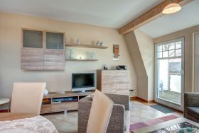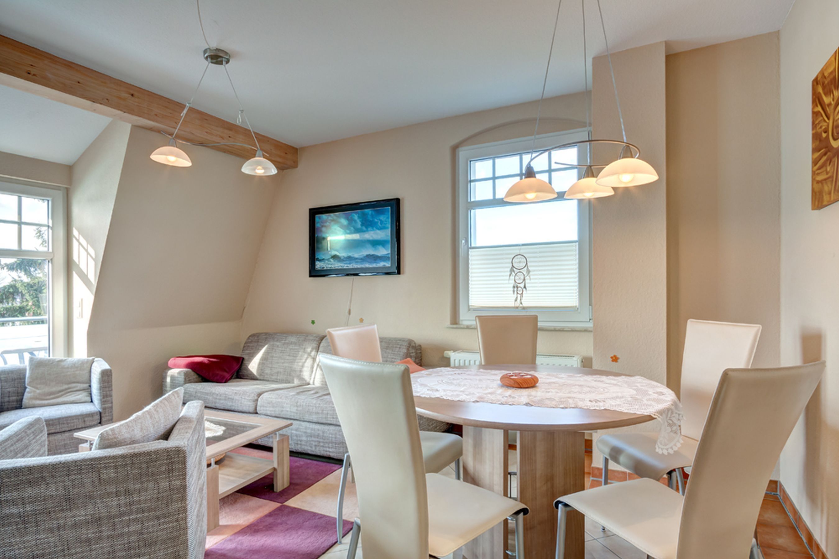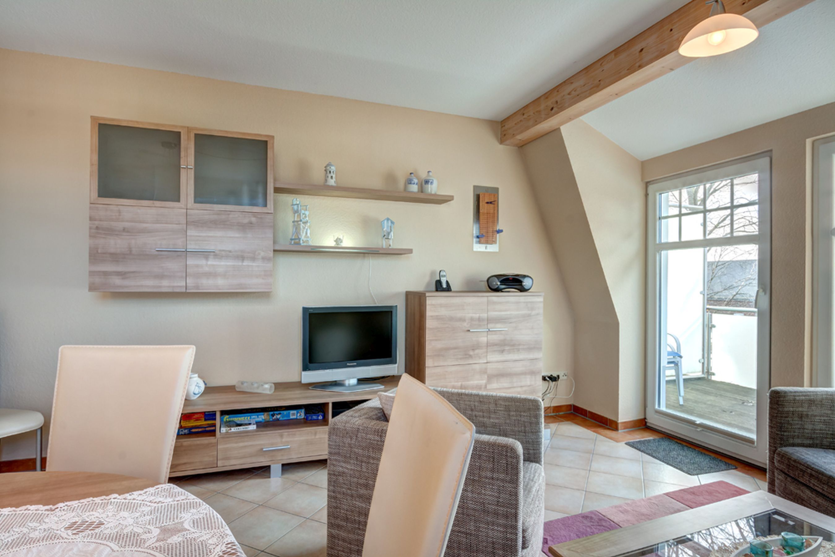 Das Wohnzimmer verfügt über eine gemütliche Maxi-Sitzecke mit modernster Schlaffunktion, welche mit wenigen Handgriffen zu einem Doppelbett mit Kaltschaummatratze umfunktioniert werden kann, eine moderne Schrankkombination mit Flachbild-TV, DVD-Player und CD-Radio, sowie einem Essbereich mit ausziehbarem Esstisch und 6 Stühlen.