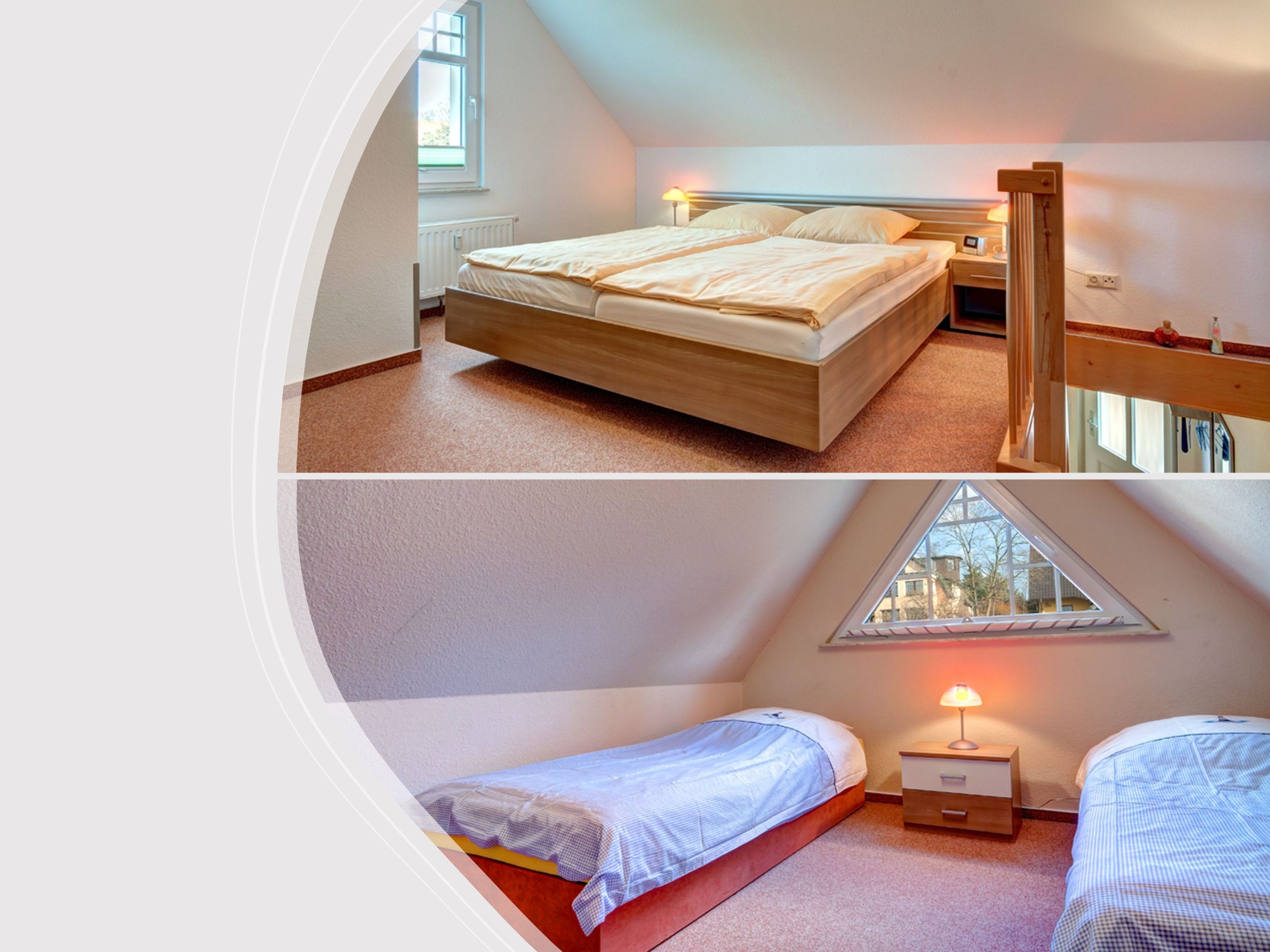 Das Schlafzimmer befindet sich im Dachgeschoss, erreichbar über eine Raumspartreppe. Hier stehen Ihnen ein großes Doppelbett mit 1,80 m breiter Liegefläche, sowie eine geräumige Kommode zur Verfügung.