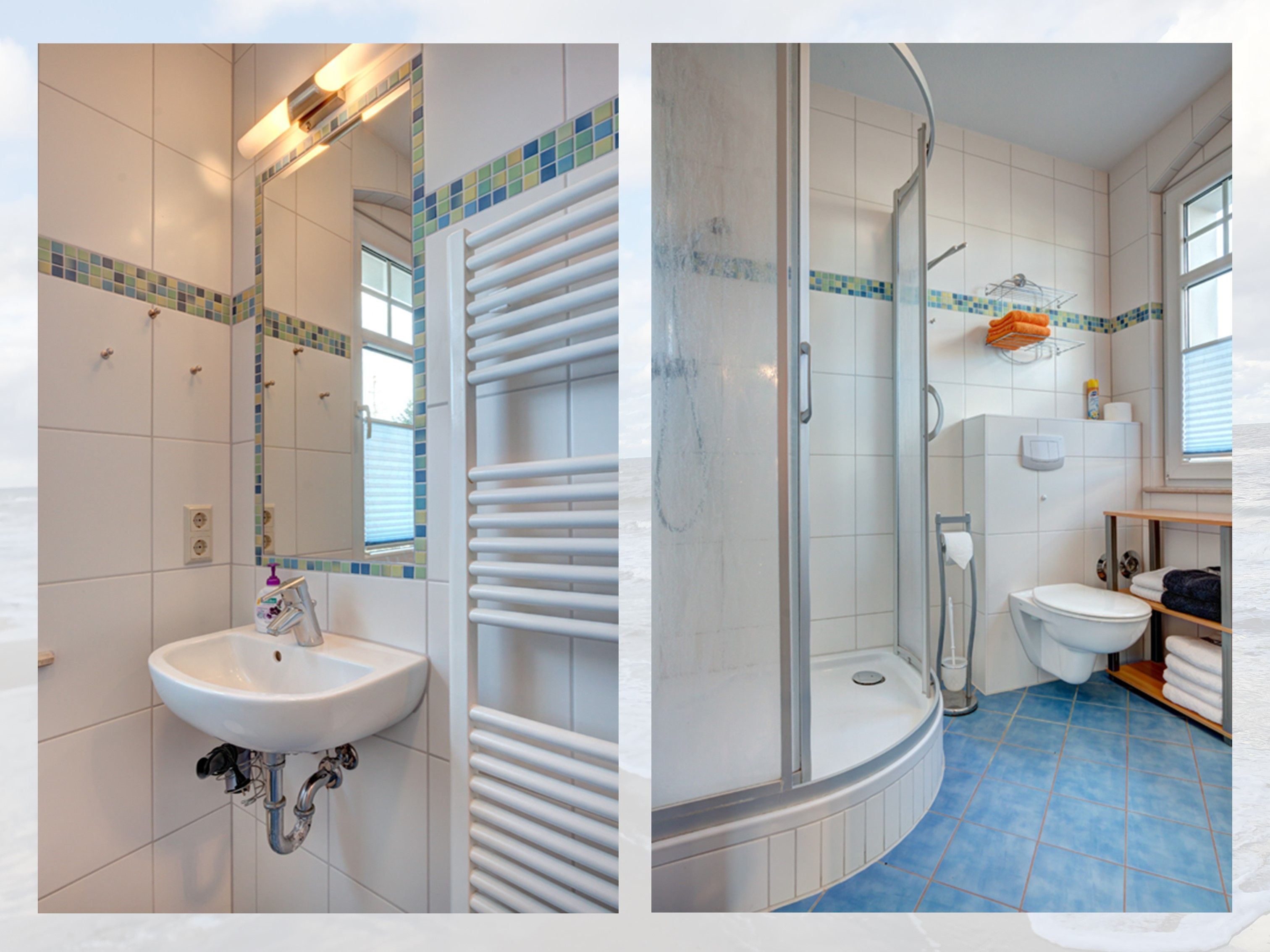 Das Badezimmer ist ausgestattet mit Dusche, WC, Waschbecken.