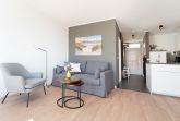 Der helle Wohnbereich lädt mit bequemen Sitzmöglichkeiten und einem Fernseher zu entspannten Stunden ein. Von hier aus gelangen Sie auf den möblierten Balkon, der zum Verweilen an der frischen Ostseeluft einlädt. Die offene Küchenzeile ist modern ausgestattet und verfügt über Backofen, Geschirrspülmaschine, Kühlschrank, Mikrowelle, Kaffeemaschine, Toaster und weitere nützliche Utensilien. Im Schlafzimmer sorgt ein komfortables Doppelbett (2x 80x200 cm) für erholsamen Schlaf. Das Badezimmer ist mit Dusche und WC ausgestattet.