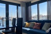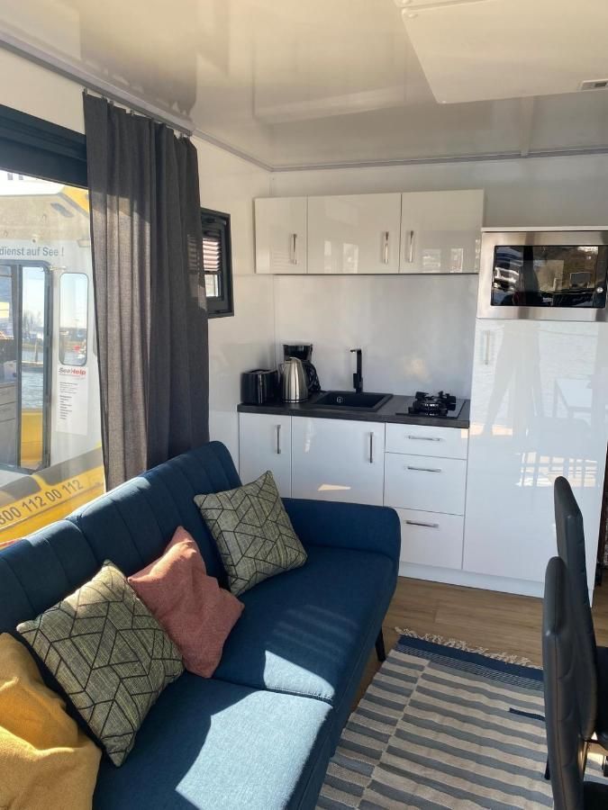 Auf zwei Ebenen erstreckt sich dieses exklusive Hausboot Meeresbrise auf ca. 18 m² Wohnfläche und zusätzlich die möblierte Dachterrasse mit ca. 15 m² als Sonnendeck, verbunden über eine außenliegende Treppe. Der moderne und konzipierte Wohnbereich mit stilvoller Couch bietet Ihnen einen fantastischen Panoramablick über den Jachthafen und vom Sonnendeck über die Ostsee. Näher am Wasser kann man nicht Urlaub machen!