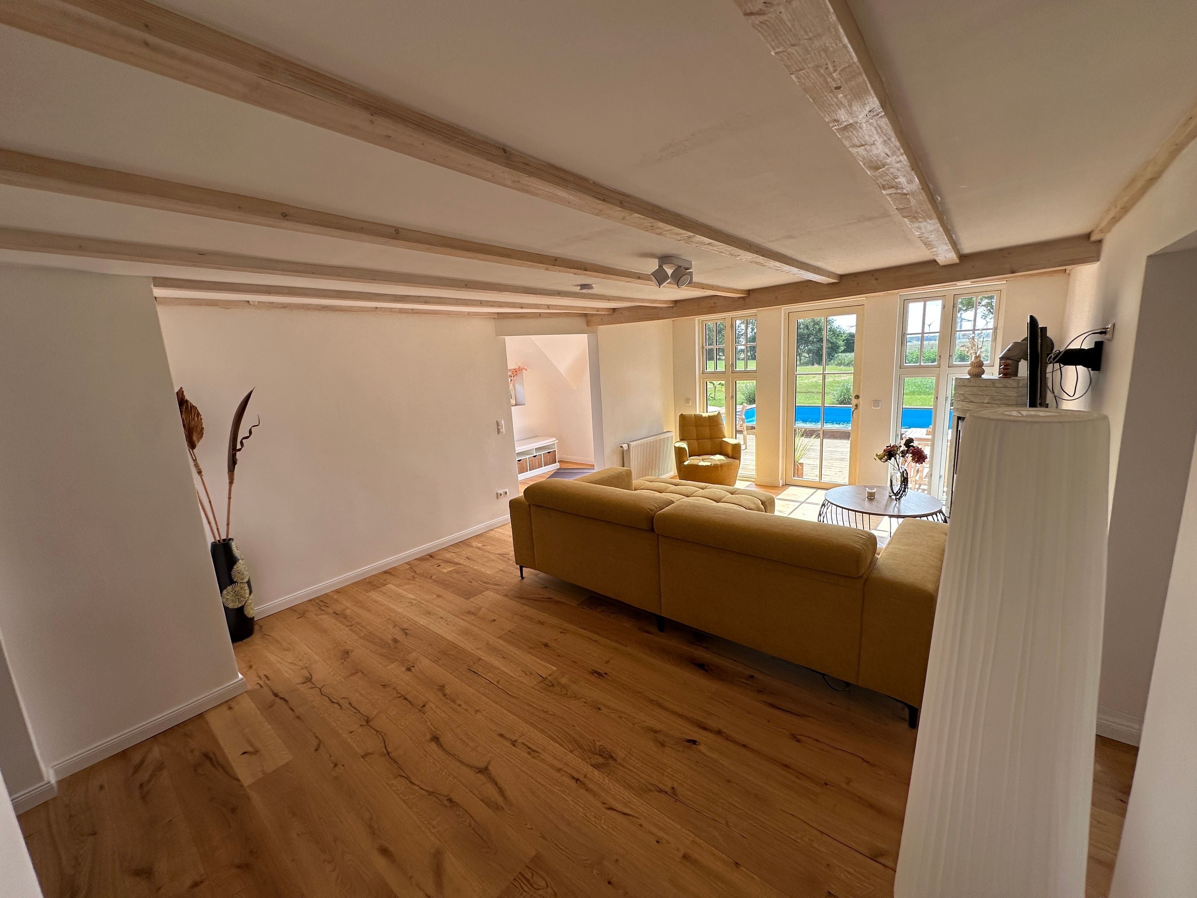 Der Fußboden besteht aus Echtholz, Eiche-Parkett Landhausdielen.