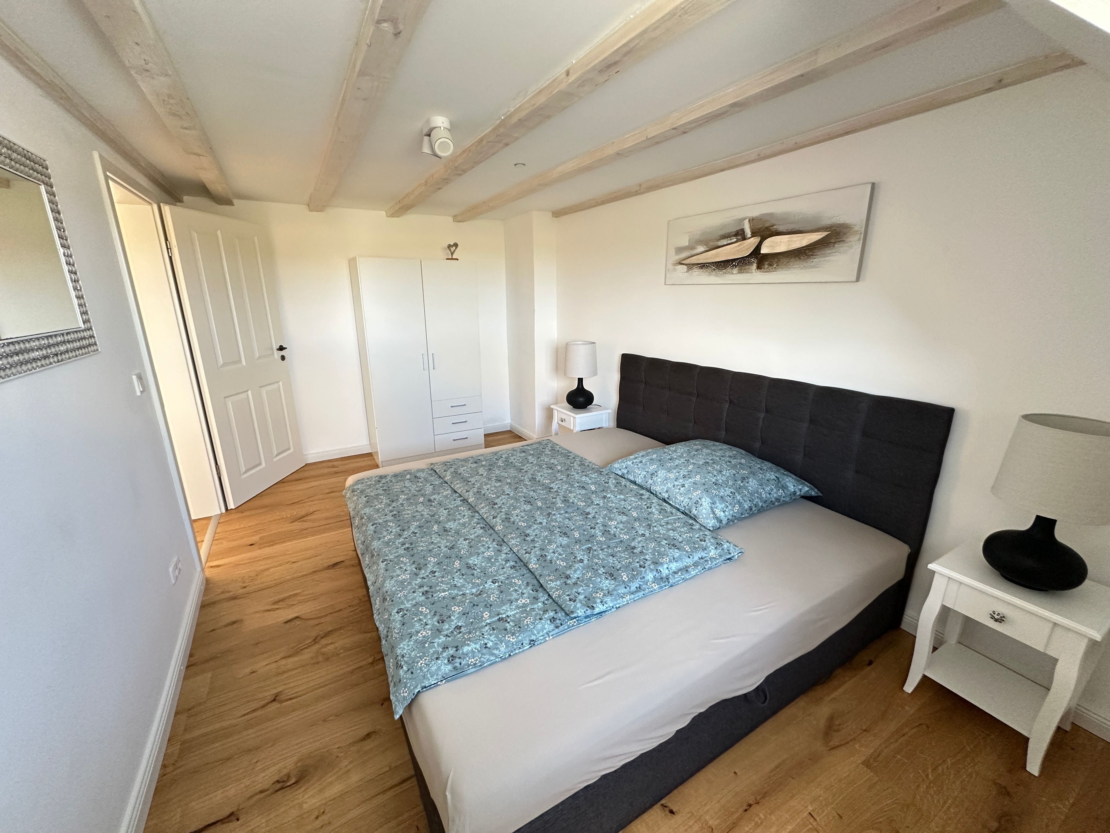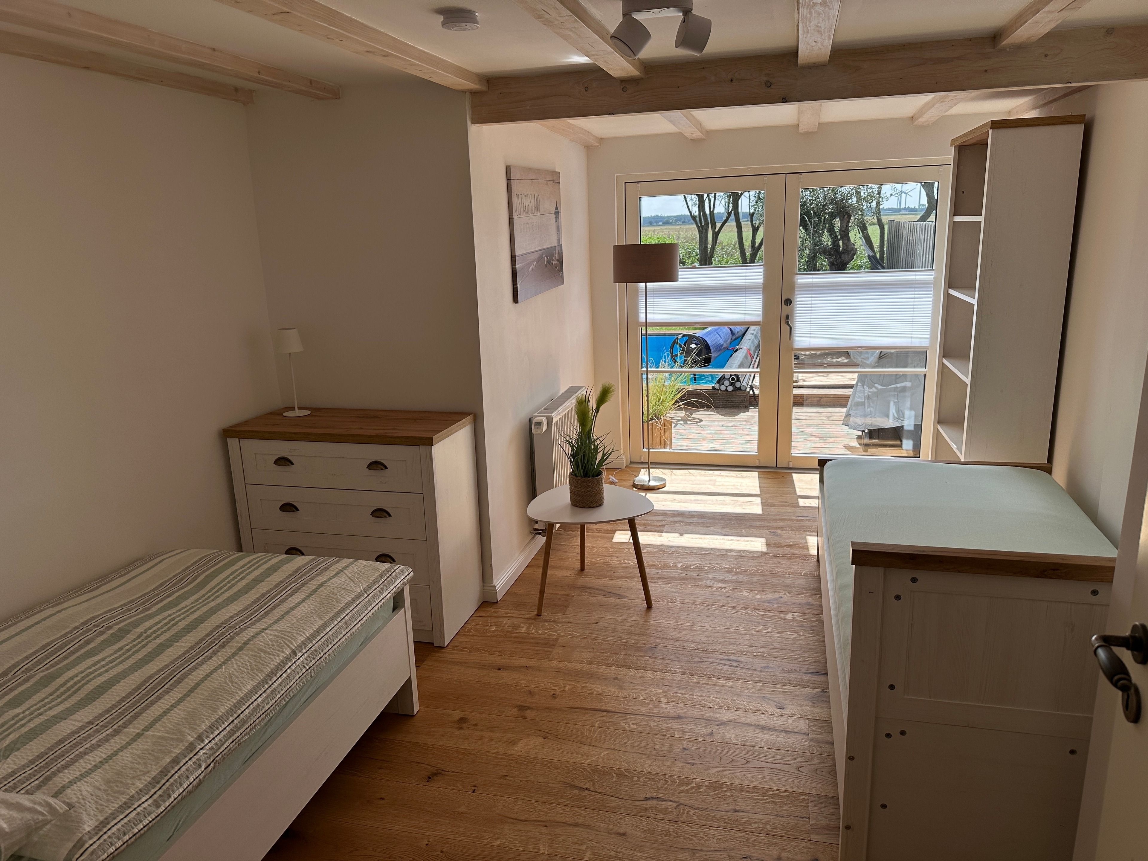 Die beiden Schlafzimmer sind zum einen mit zwei Einzelbetten und einem Regal ausgestattet, das andere mit einem Doppelbett 180x200 und einem Kleiderschrank.