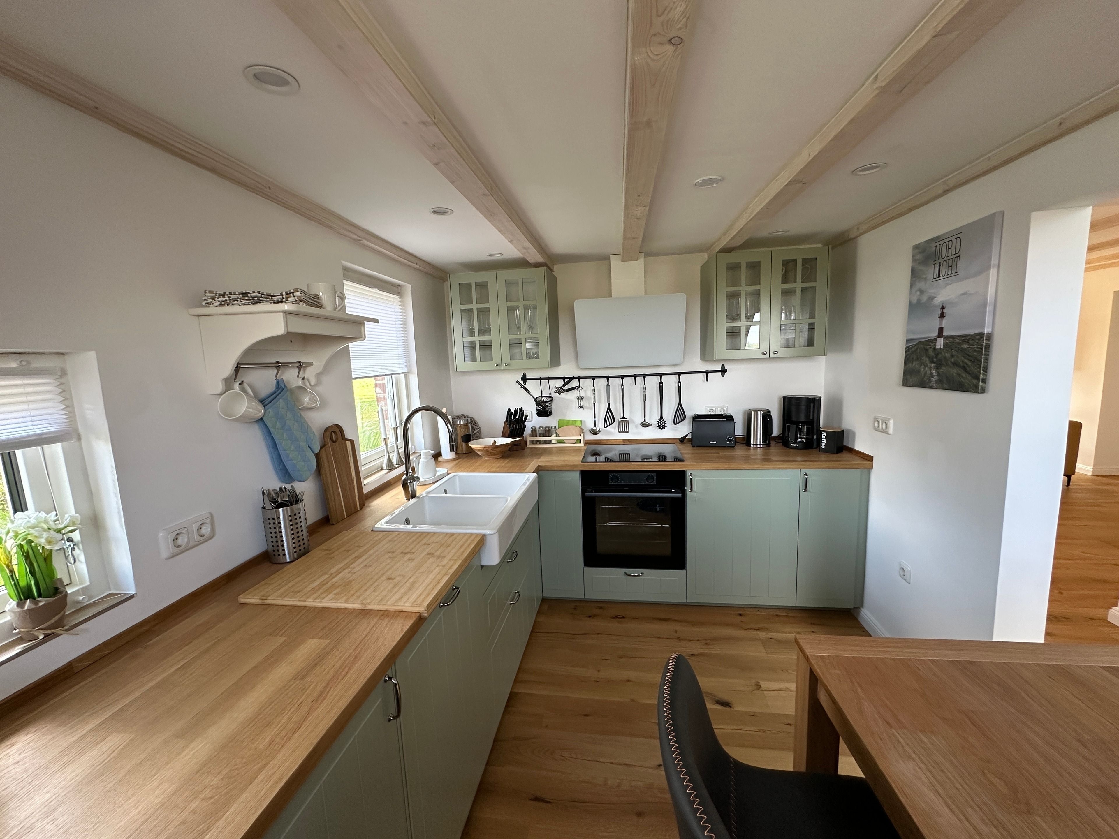 In der Küche essen Sie an einem Hochtisch mit vier Barhockern und können durch die Fenster auf den nahen Deich blicken.