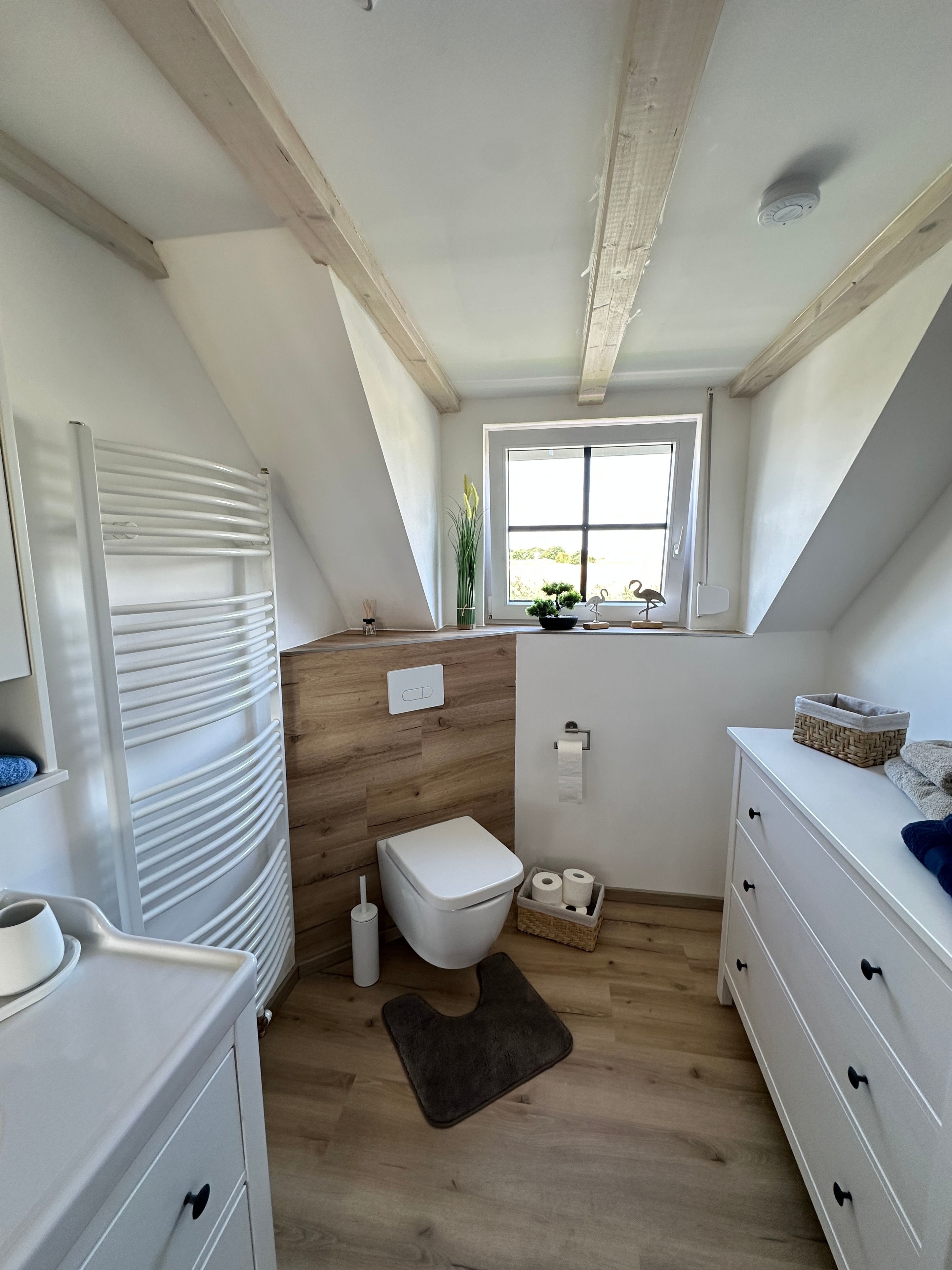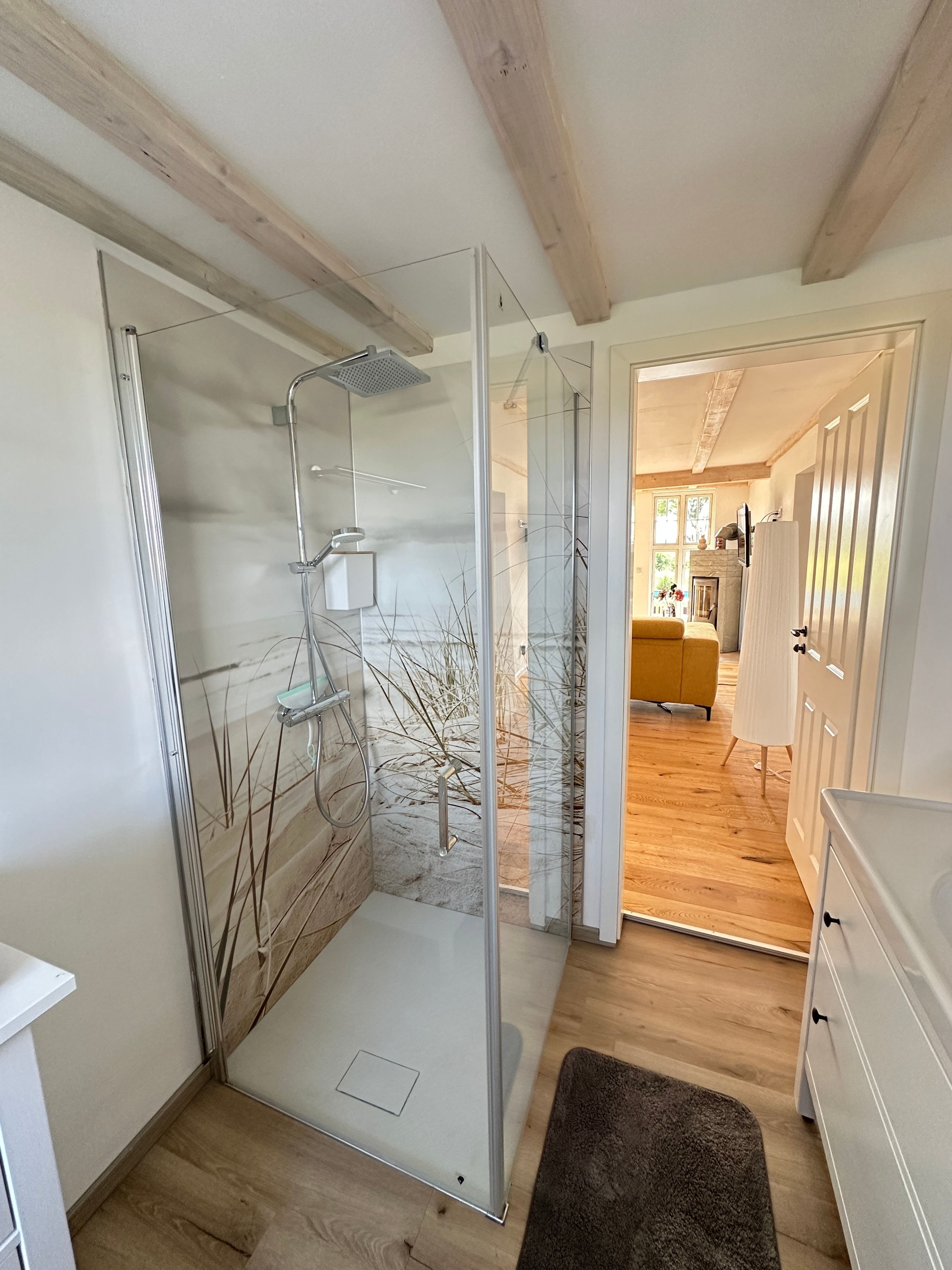 Frisch erstellte Ferienwohnung im Erdgeschoss mit ca. 85 m² Wohnfläche, verteilt auf zwei Schlafzimmer, ein Wohnzimmer, ein Bad mit Dusche und WC und eine Küche mit Einbauküche.