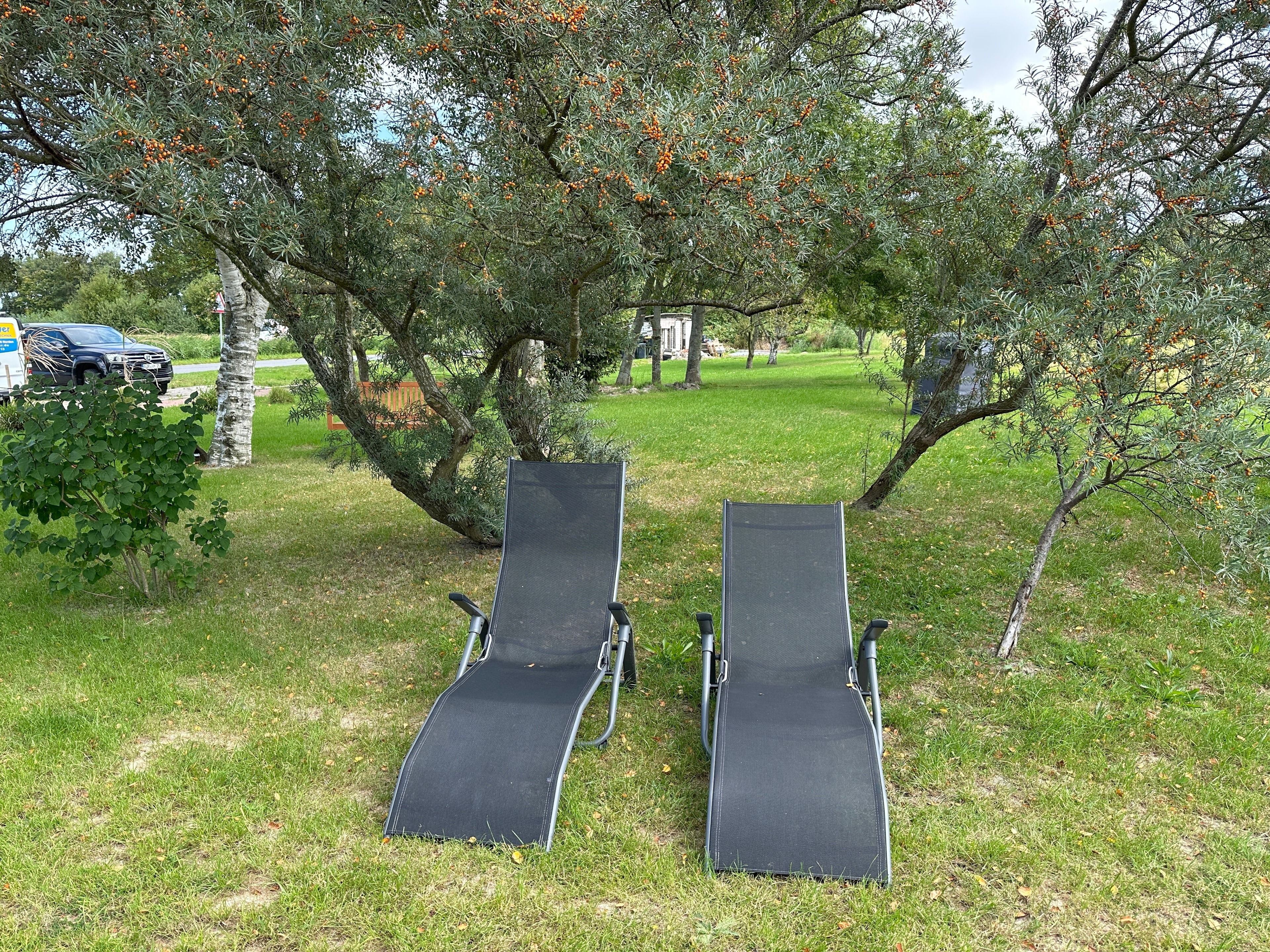 Weiterhin sind zwei Sonnenliegen vorhanden, ein Strandkorb, eine Hängematte und eine Hängebank.