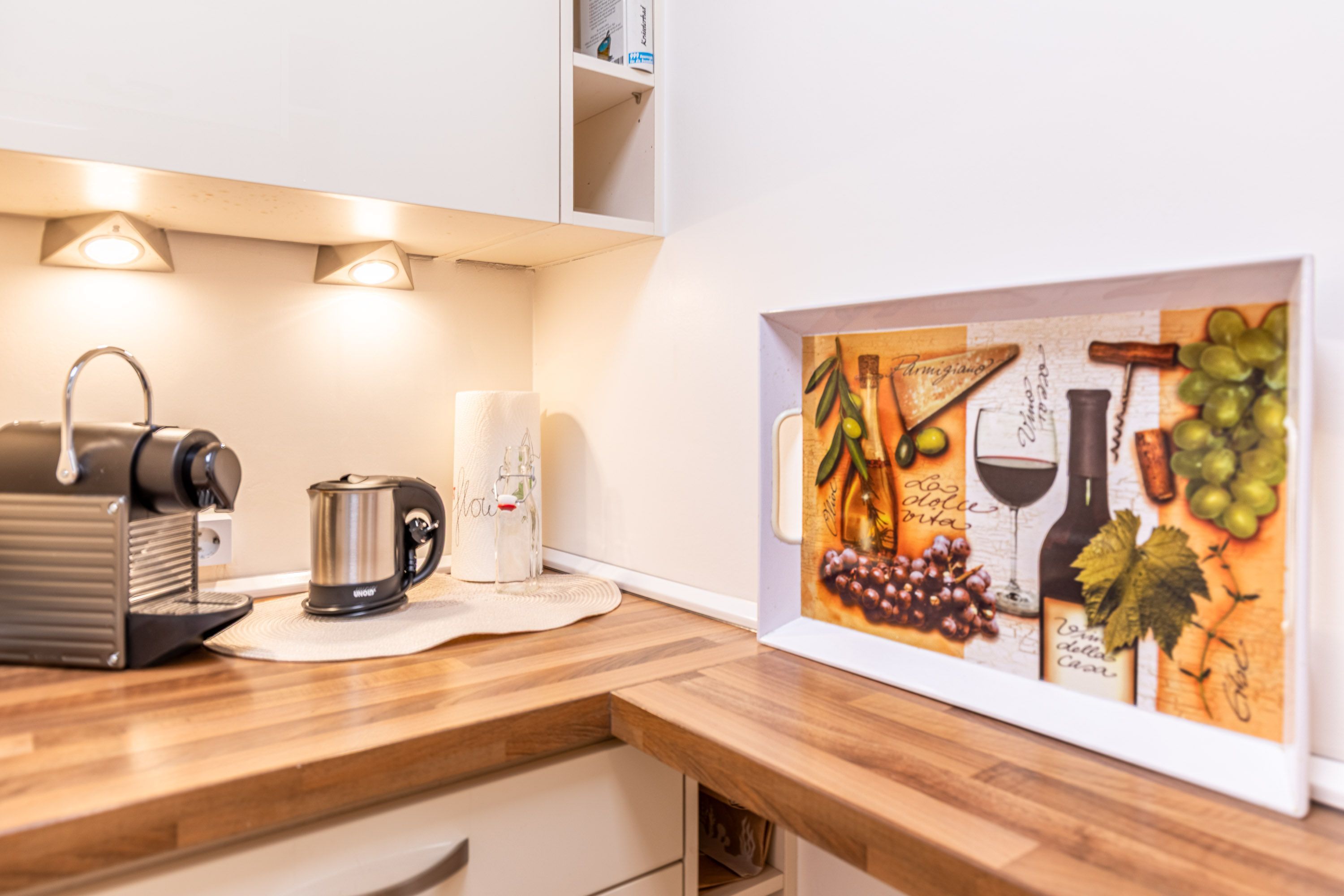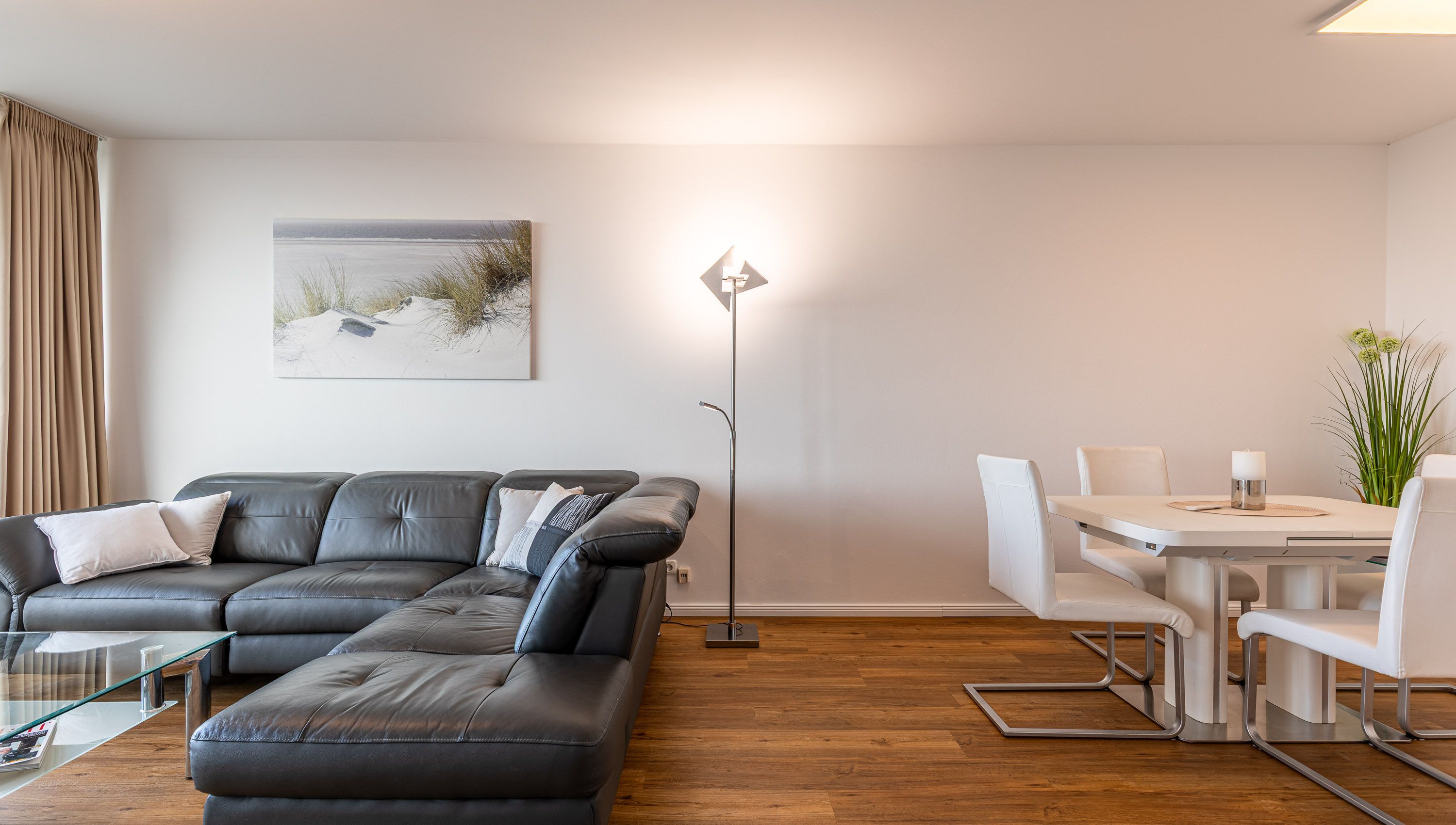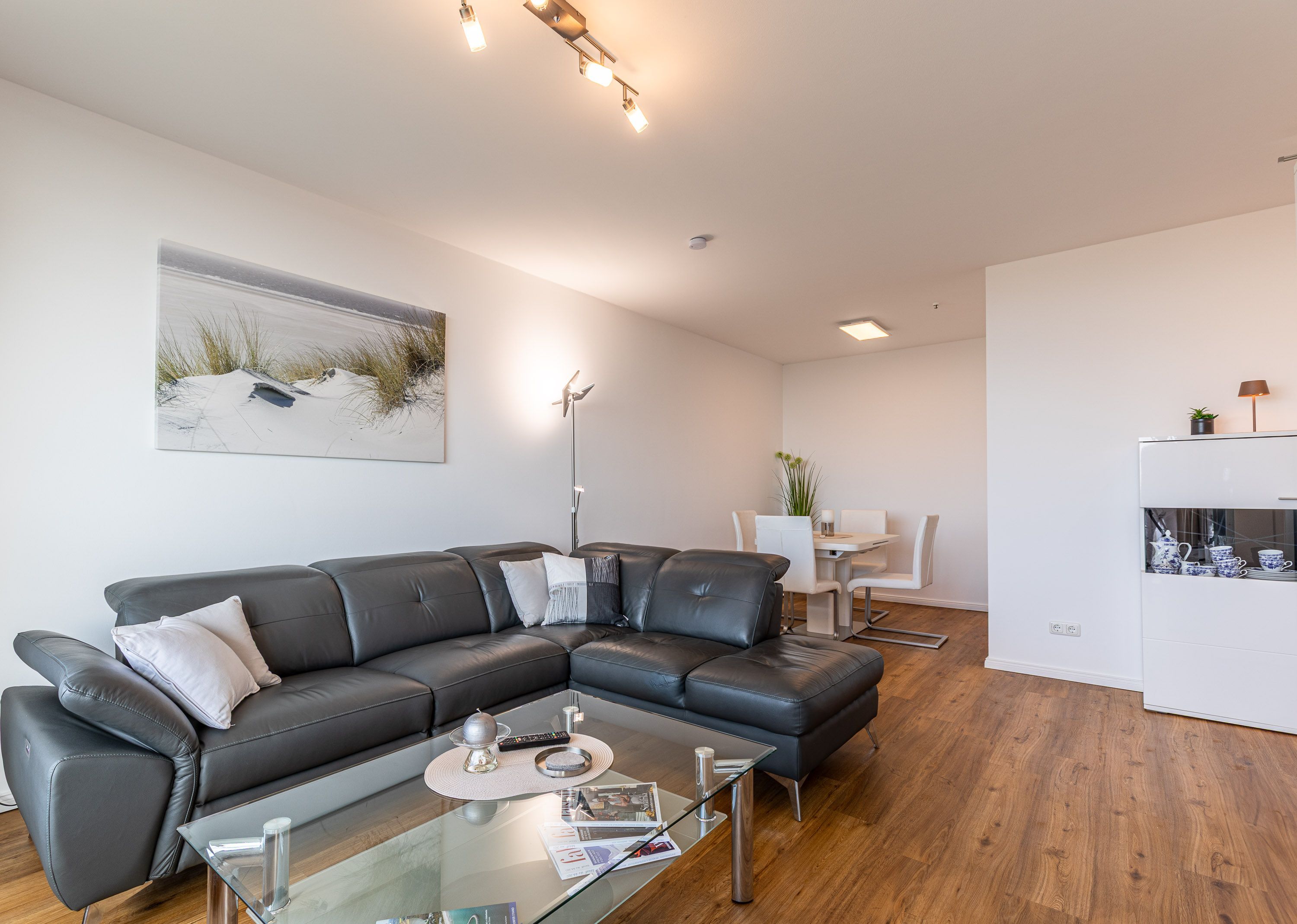 Die moderne Küche mit Geschirrspüler, Mikrowelle und Backofen lässt keine Wünsche offen. Im gemütlichen Wohnbereich mit Couchgarnitur und Essecke können Sie entspannen, das Schlafzimmer mit komfortablem Doppelbett (180 × 200 cm) verspricht erholsame Nächte. Vom Wohn- und Schlafzimmer gelangen Sie direkt auf den Balkon, um den Blick auf Meer und Strand zu genießen.