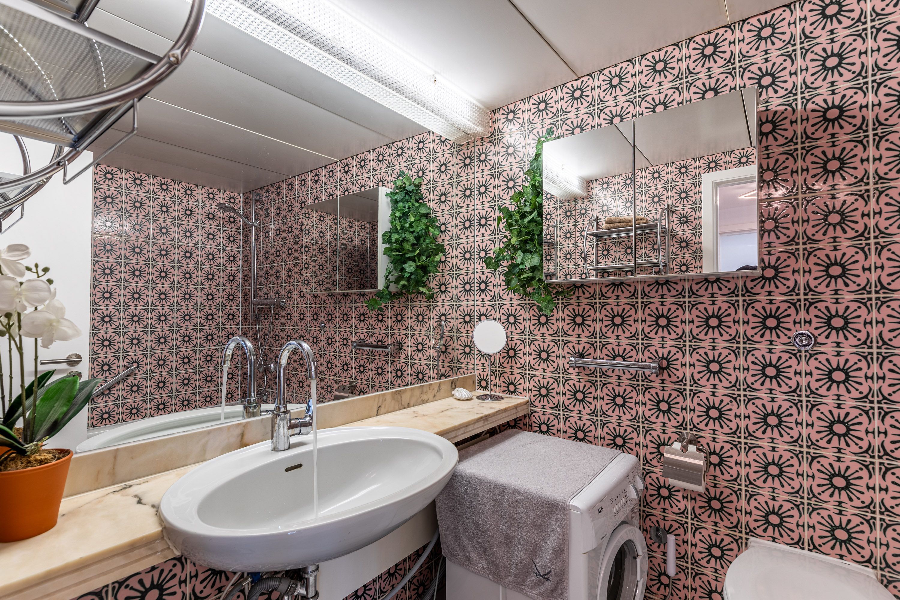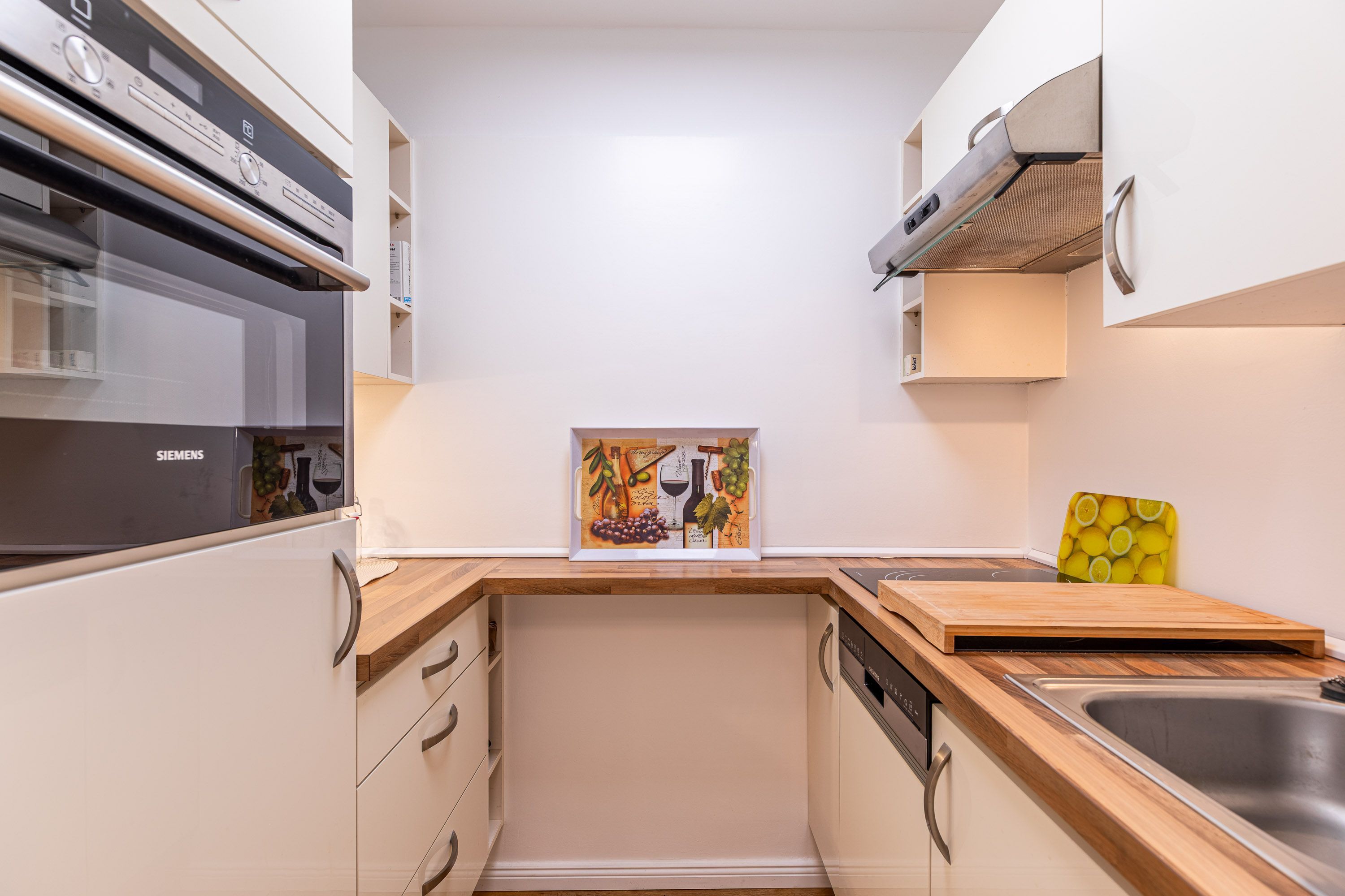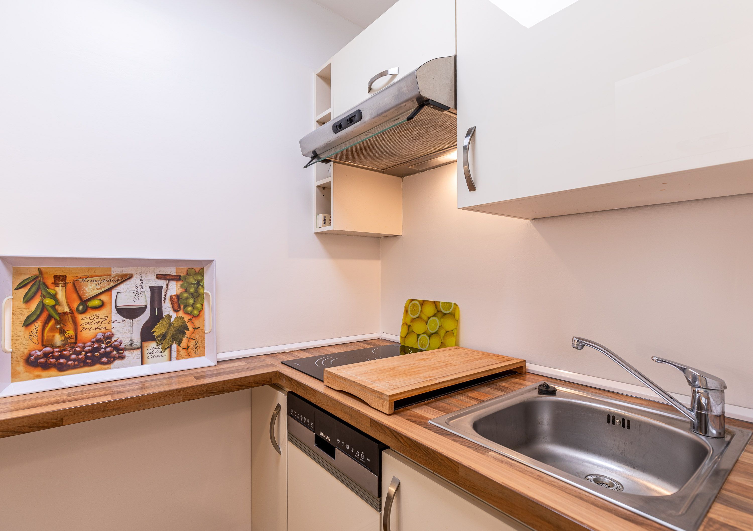 Das Bad mit Vollwanne, WC und Föhn sorgt für Komfort, ebenso wie kostenfreies WLAN, TV, Waschmaschine, Aufzug und ein eigener Tiefgaragenstellplatz (Einfahrtshöhe 1,85 m).