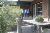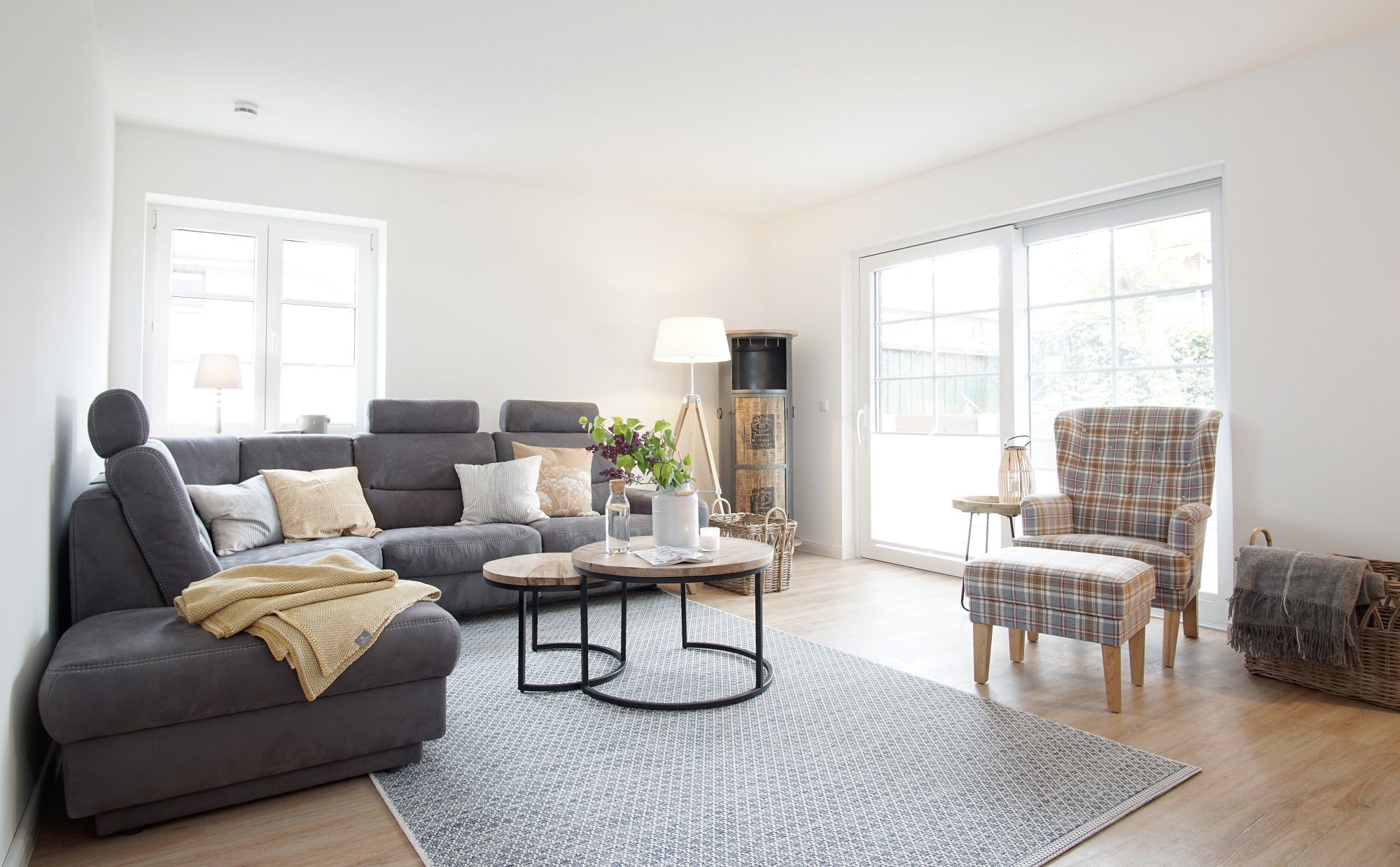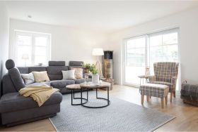 Über das helle, offene Wohnzimmer gelangt man auf die großzügige Terrasse mit eigenem Strandkorb. Hier kann man ab dem Vormittag bis in die Abendstunden die Sonne genießen, während die kleinen Kinder in der Sandkiste spielen.