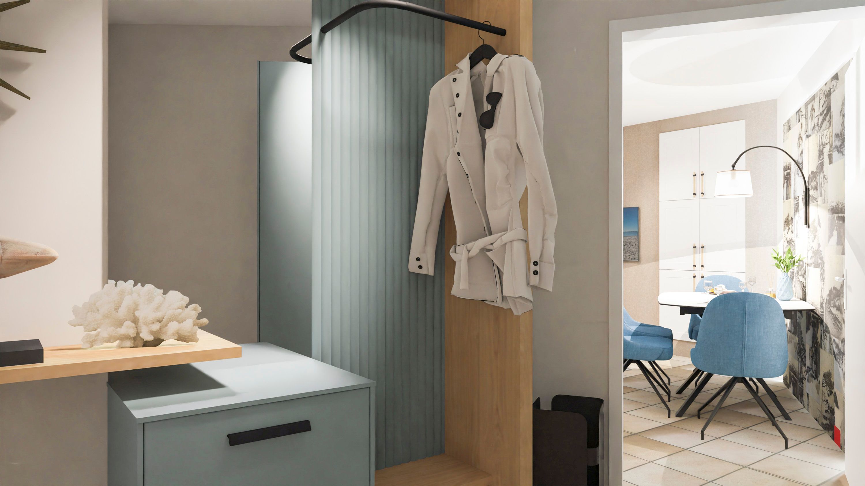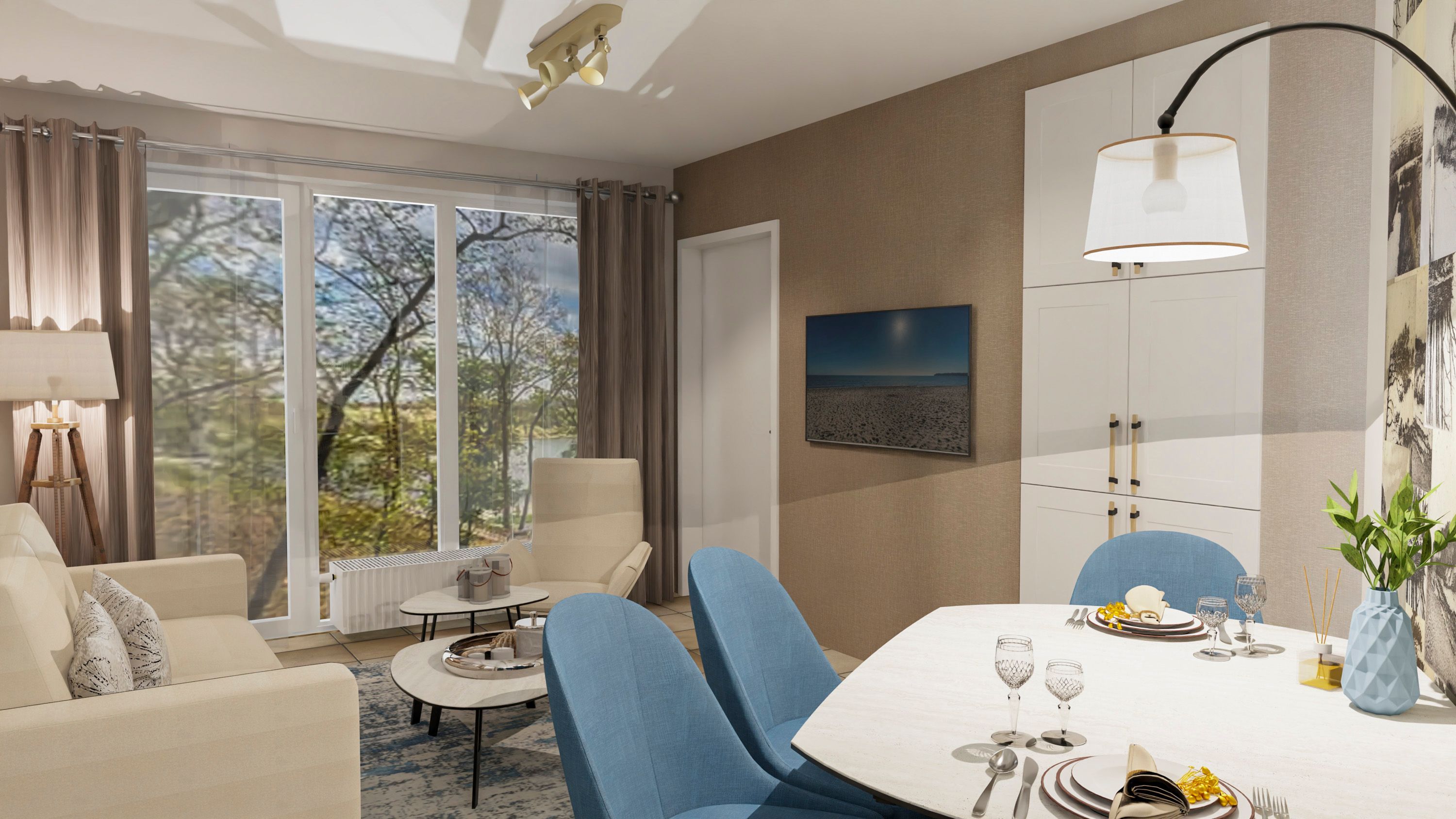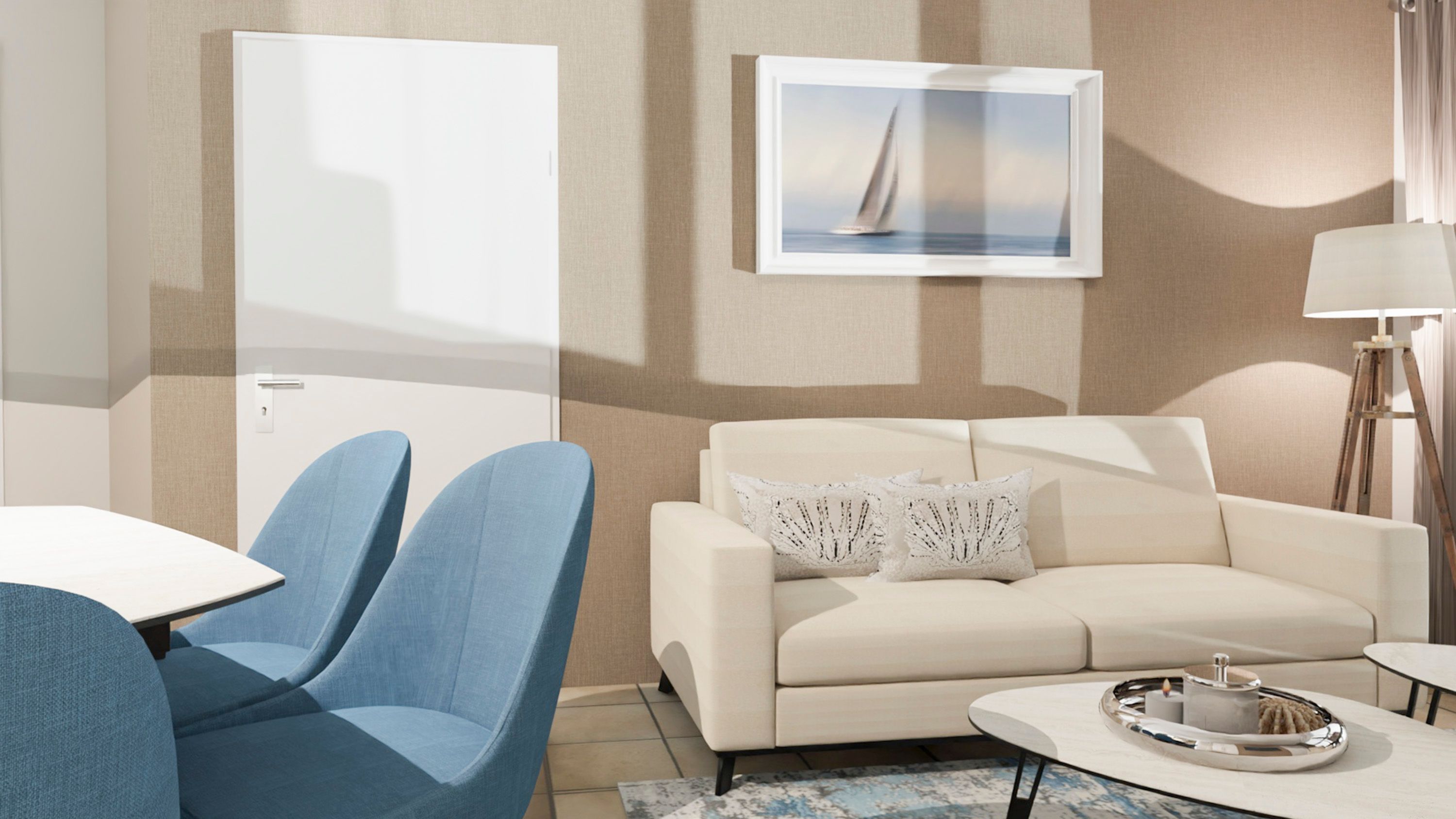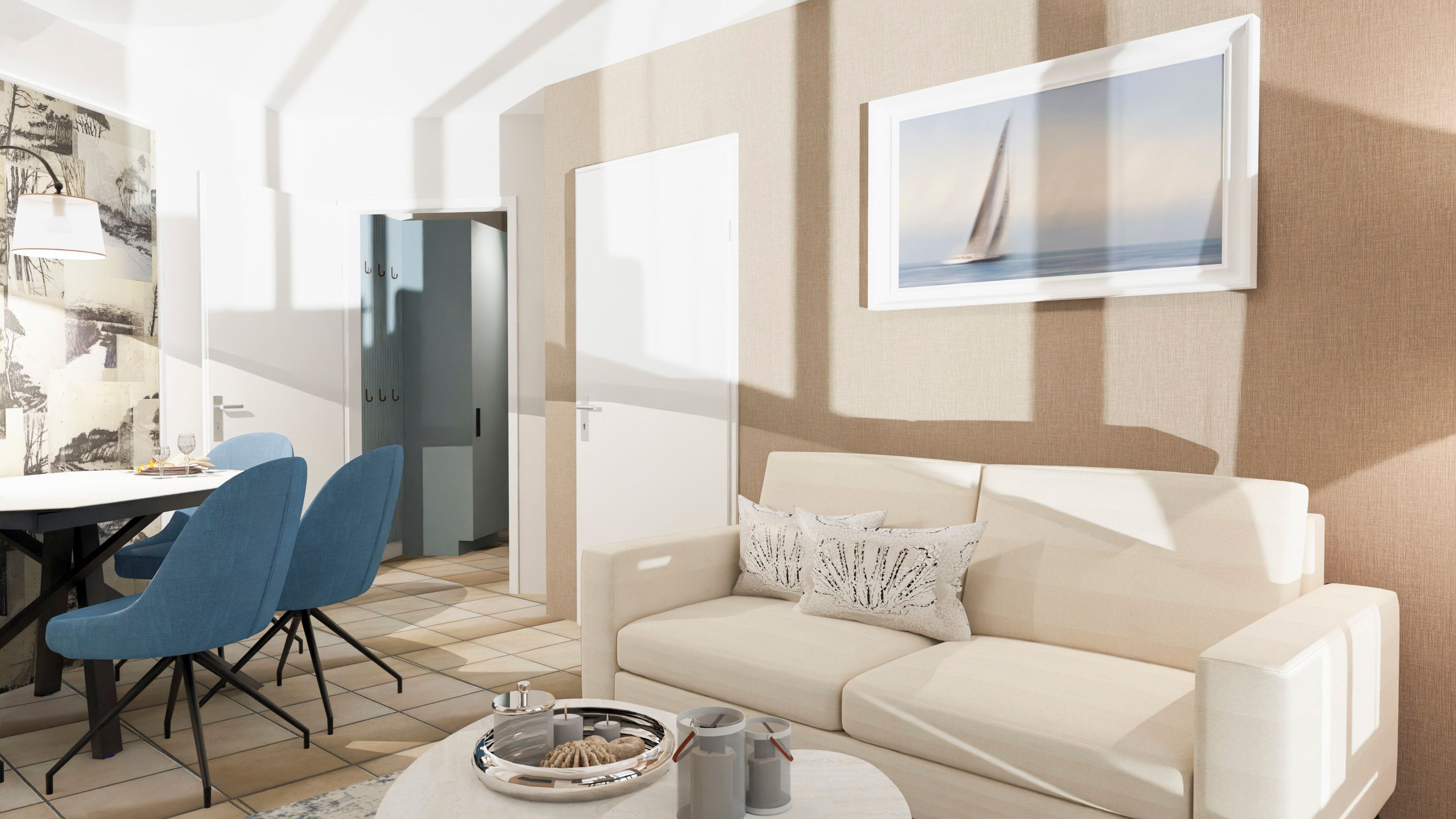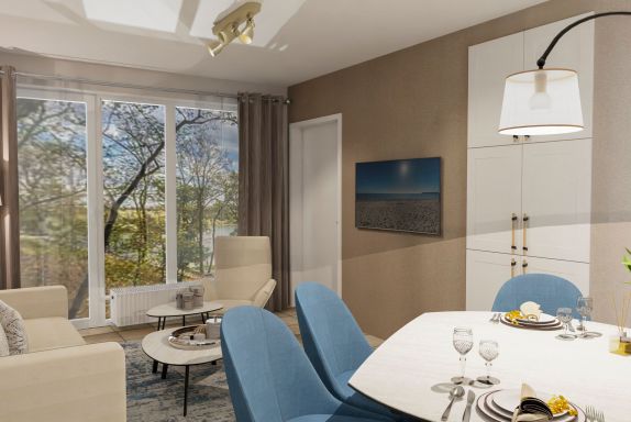 Die Ferienwohnung Ostseeblick empfängt Sie mit einer warmen, freundlichen Atmosphäre und durchdachter Ausstattung. Der Wohnbereich mit gemütlicher Couch und Esstisch lädt zum Entspannen ein sei es beim Frühstück, beim Spieleabend oder beim Musikhören. Im Schlafzimmer sorgt das bequeme Doppelbett für angenehme Nächte ruhig und strandnah zugleich.