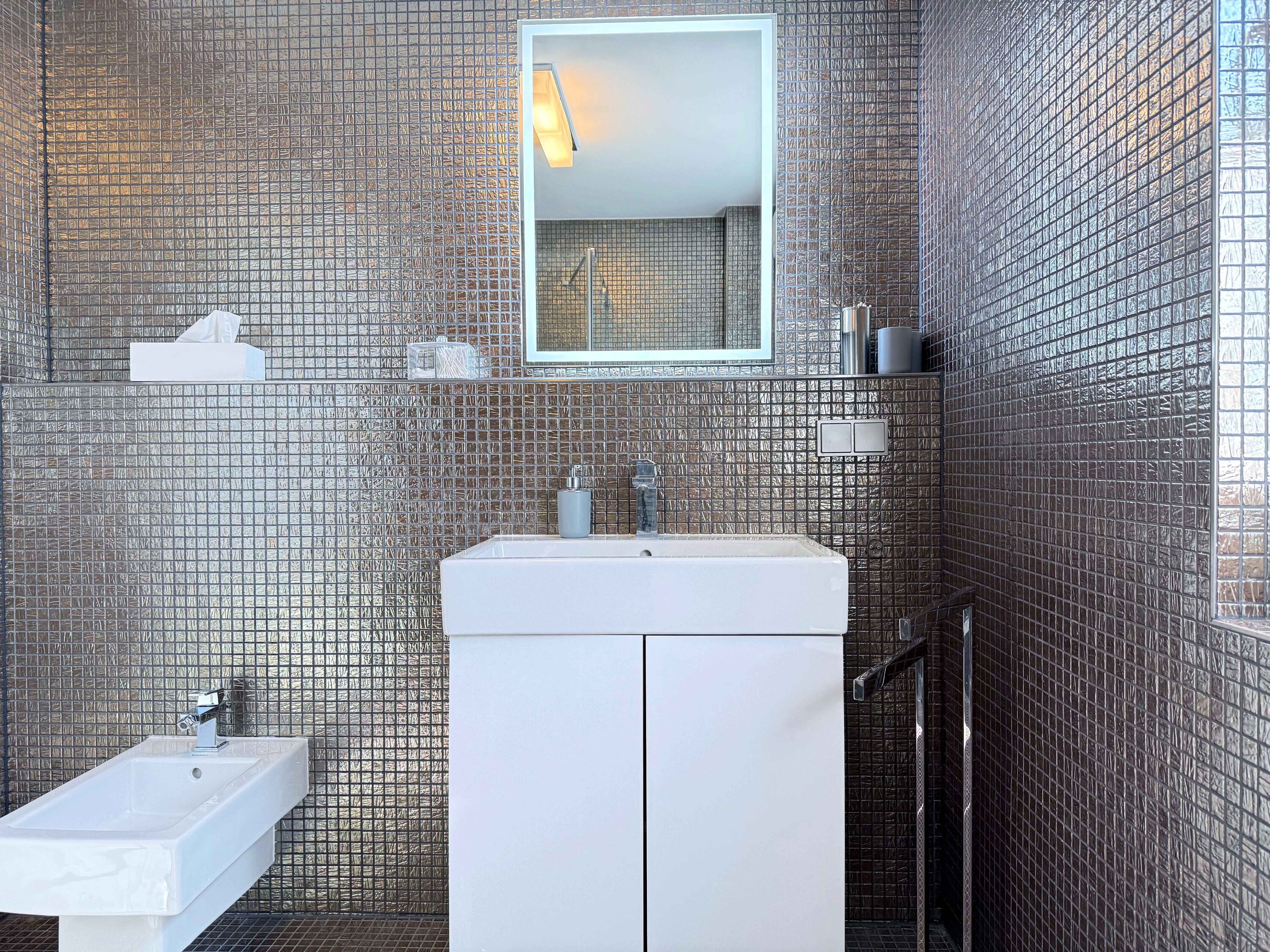 • Zwei moderne Badezimmer mit ebenerdiger Dusche und Föhn