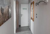 Die offene Küche ist zum Wohnzimmer hin ausgerichtet und verfügt über eine hochwertige Ceran-Kochfläche, einen Backofen, einen Kühlschrank sowie eine Spülmaschine. Ergänzt wird die Küchenausstattung durch eine Kaffeemaschine, einen Toaster, einen Wasserkocher sowie sämtliche notwendigen Küchenutensilien, Geschirr und Besteck. Ein Esstisch im Essbereich eignet sich ideal für gemeinsame Mahlzeiten.
