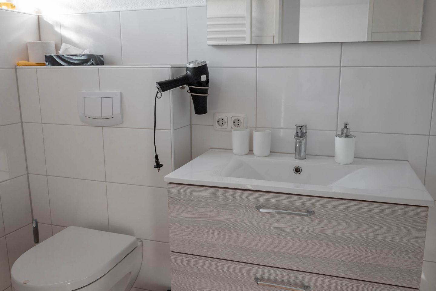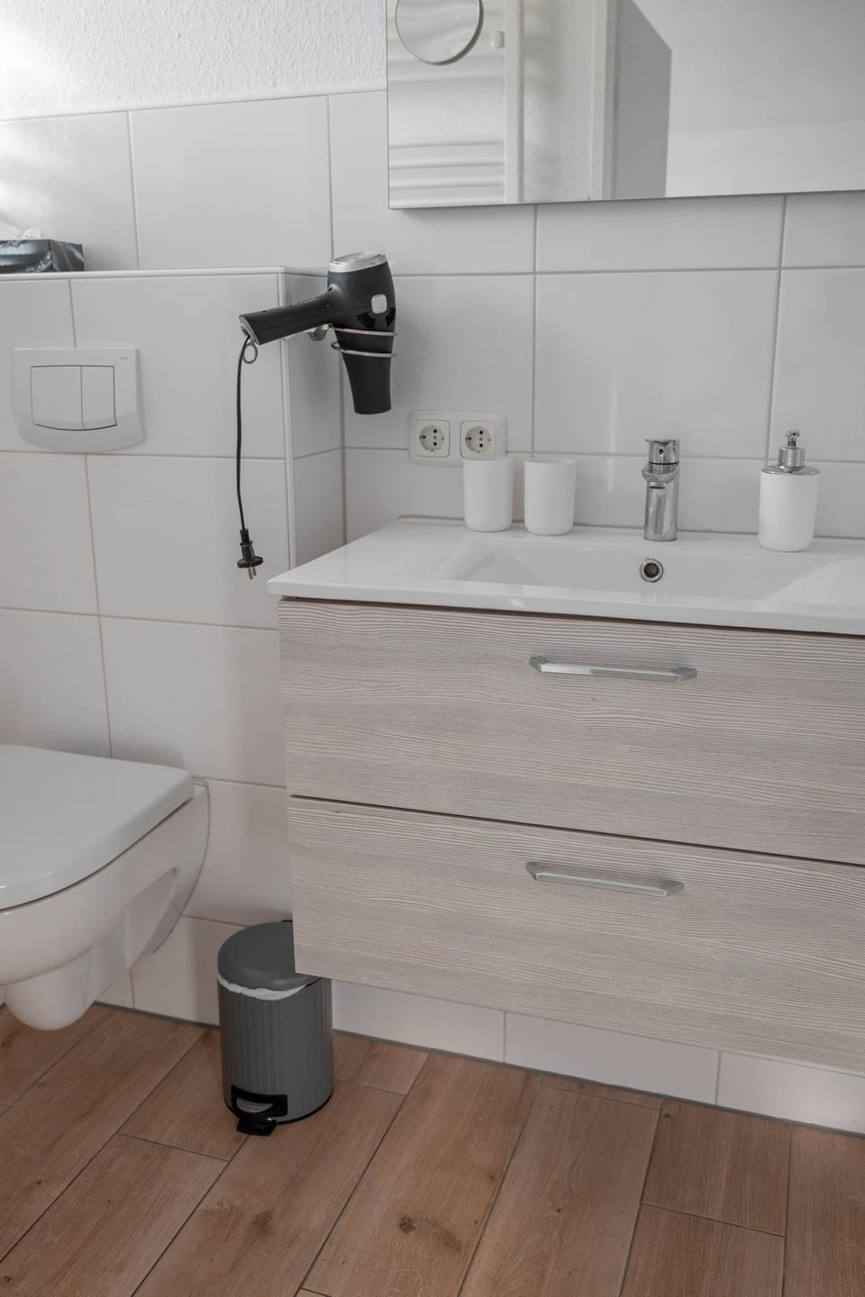 Das Badezimmer präsentiert sich mit einer bodengleichen XL Dusche, WC, Waschbecken, Spiegel und Kosmetikspiegel sowie einem Haartrockner.