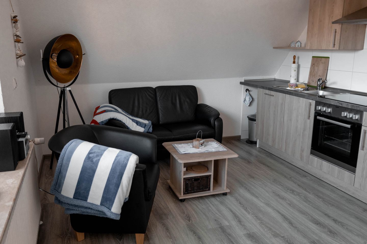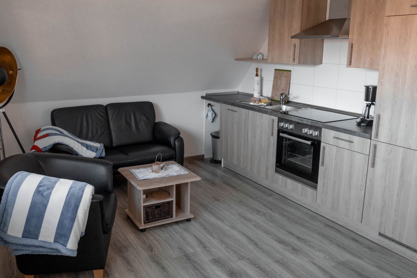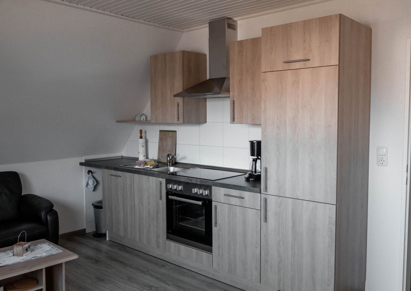 Die offene Küche ist zum Wohnzimmer hin ausgerichtet und verfügt über eine hochwertige Ceran-Kochfläche, einen Backofen, einen Kühlschrank sowie eine Spülmaschine. Ergänzt wird die Küchenausstattung durch eine Kaffeemaschine, einen Toaster, einen Wasserkocher sowie sämtliche notwendigen Küchenutensilien, Geschirr und Besteck. Ein Esstisch im Essbereich eignet sich ideal für gemeinsame Mahlzeiten.