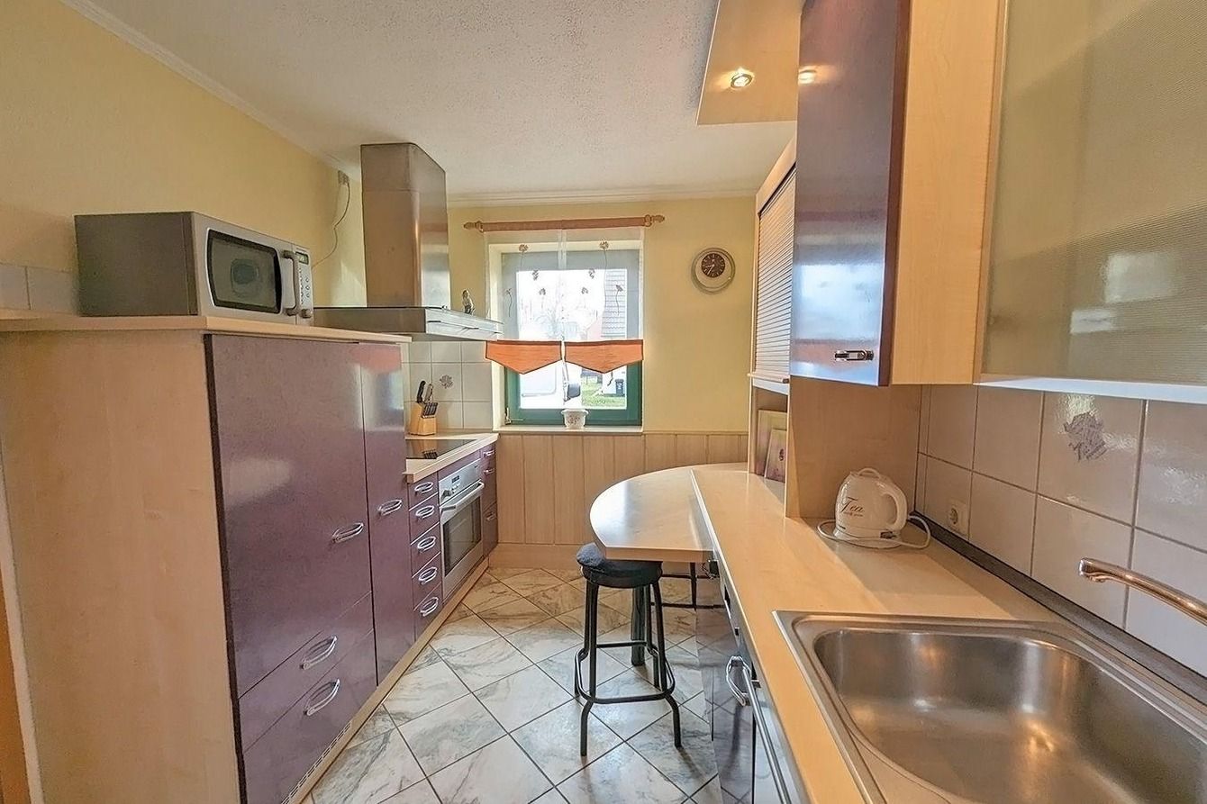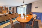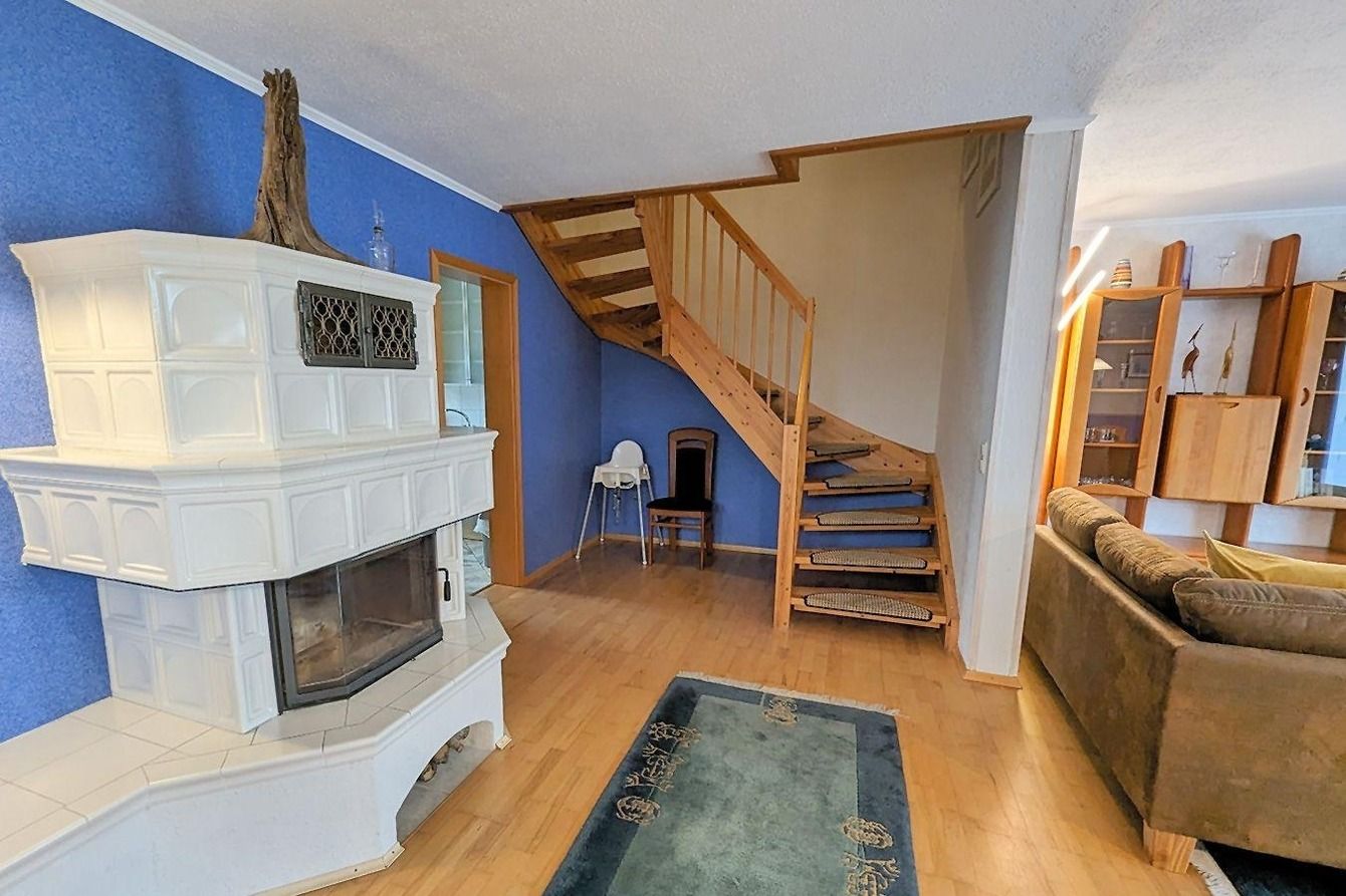 Im Erdgeschoss befindet sich der großzügige Wohn- Essbereich mit schöner Sitzecke und einem wunderschönen Kachel-Kamin-Ofen. Es gibt eine separate voll ausgestattete Küche und einen kleinen Hauswirtschaftsraum mit Waschmaschene.