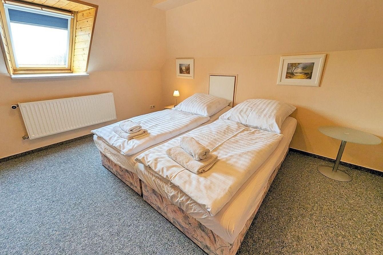 Das dritte Schlafzimmer mit zwei Einzelbetten ist im Dachgeschoss zu finden.