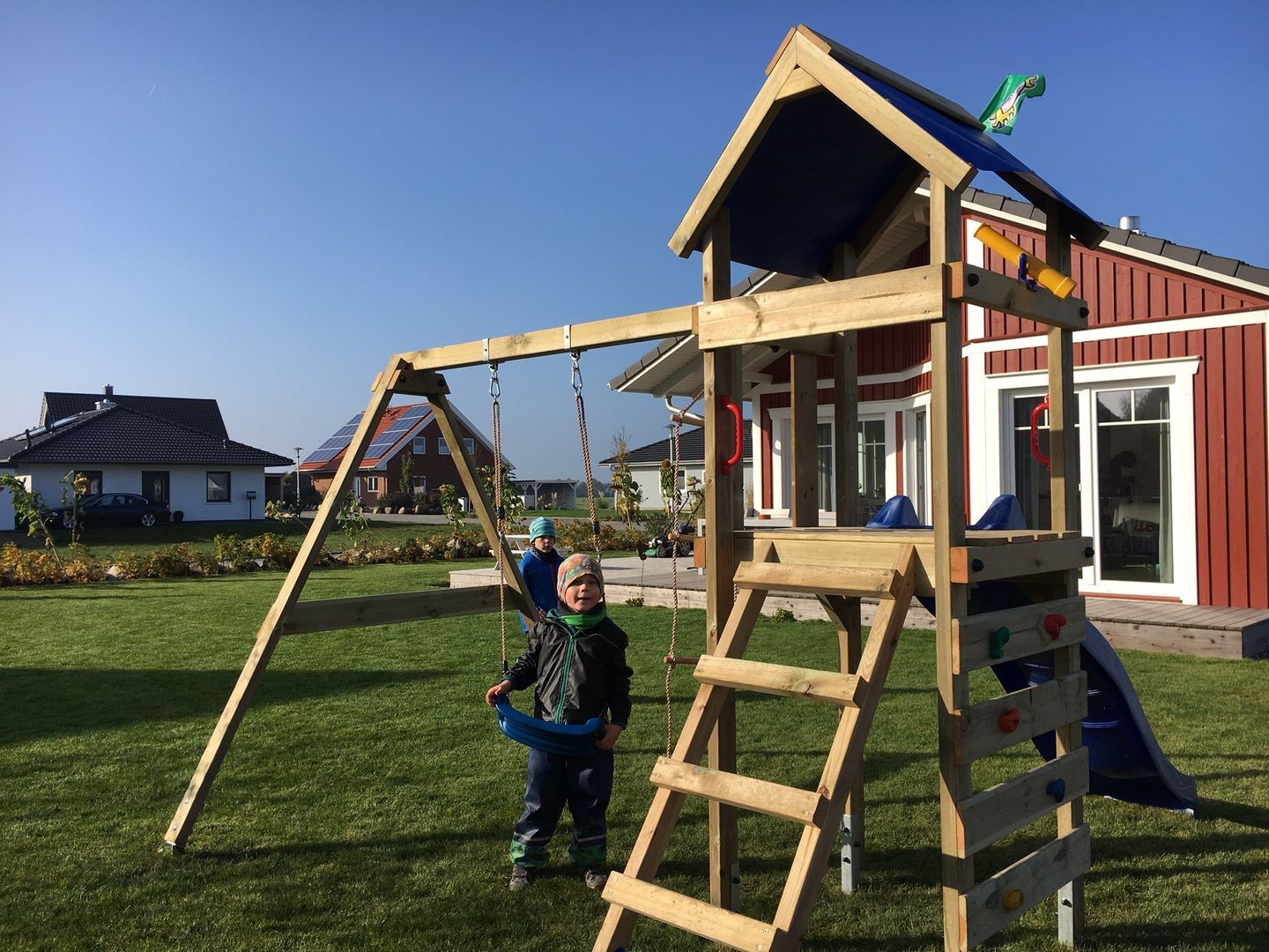 Der großzügige Wohnbereich mit knisterndem Kaminofen, offener Küche, gemütlicher Sofaecke, TV und einem einladenden Essplatz bildet das Herzstück des Hauses – ideal für gemeinsame Stunden mit Familie oder Freunden. Die drei Schlafzimmer sind praktisch und komfortabel eingerichtet: ein Zimmer mit Doppelbett und TV, eines mit zwei Einzelbetten und eines mit einem Etagenbett – perfekt für Groß und Klein.