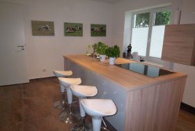Diese 70 m² große Wohnung im Erdgeschoss hat einen modernen, offenen Zuschnitt mit großzügiger Wohnküche und großem Schlafzimmer. In der Küche gibt es eine Kochinsel mit Küchentheke und vier Barhockern. Ein separater Esstisch ist nicht vorhanden. Die Küche ist mit Ceran-Kochfeld, Backofen, Kühlschrank mit Gefrierfach, Geschirrspüler, Mikrowelle und einer Senseo-KaffeePadmaschine ausgestattet. Außerdem gibt es eine normale Kaffeemaschine und einen Wasserkocher. Das Bad bietet Ihnen eine barrierefreie Regendusche mit einer Duschabtrennung in Echtglas. Im großzügigen Schlafzimmer gibt es zusätzlich zum 180 cm breiten Doppelbett eine Couch, auf der notfalls auch eine Person übernachten kann. In der Wohnküche befinden sich zudem zwei große Sofas, die ebenfalls ausziehbar sind. Ein WLAN-Anschluss, Fußbodenheizung sowie hundefreundliche rutschfeste Fliesen ergänzen die Ausstattung der Wohnung. Optimal für komfortable Nutzung ist die Wohnung für 2 Personen mit Hund.