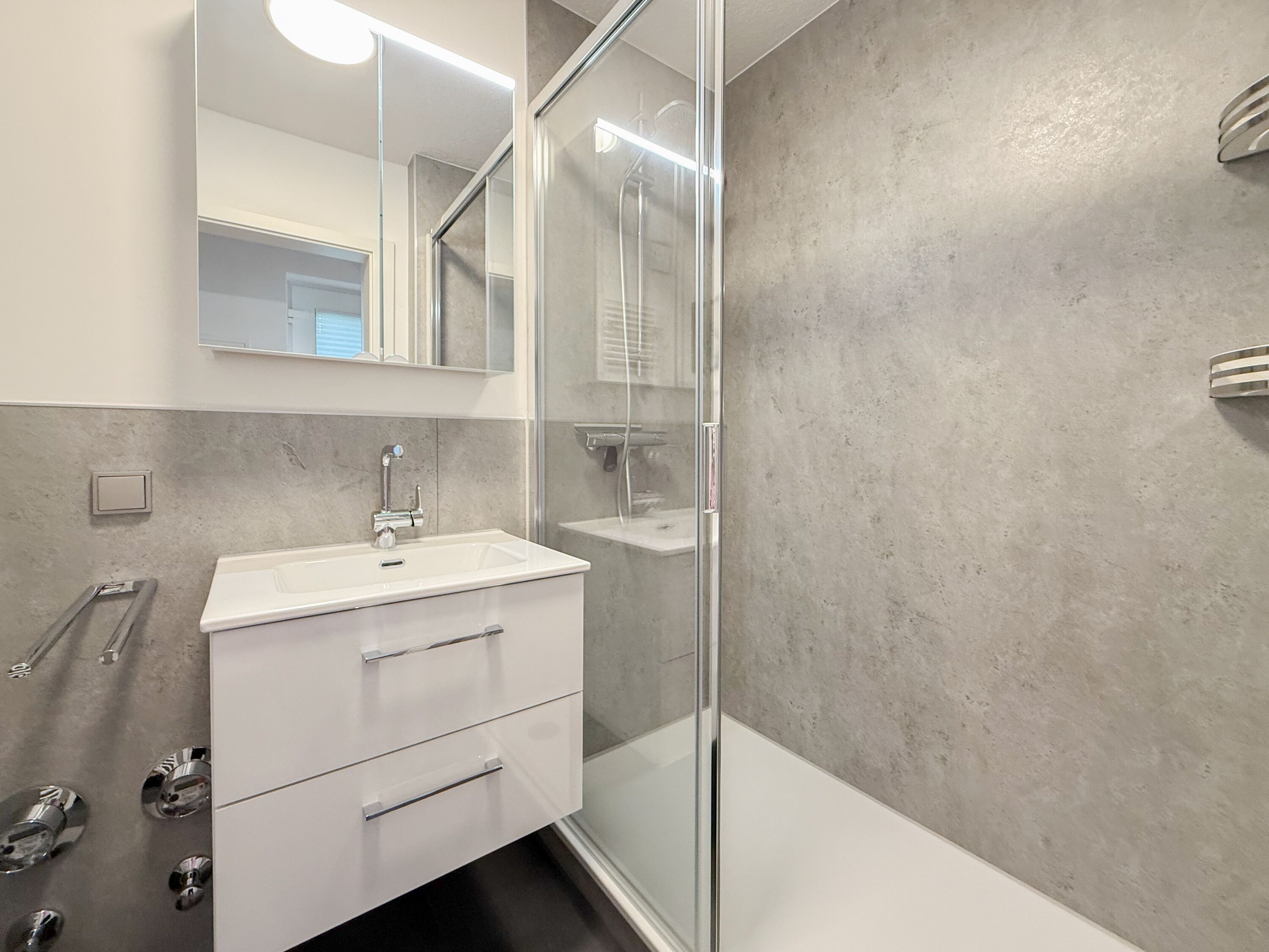 Das Schlafzimmer ist mit einem Doppelbett (160x200) und einem geräumigen Kleiderschrank eingerichtet. Sämtliche Fenster verfügen über Plissees und Vorhänge zur vollständigen Verdunkelung. Alle Fenster sind mit Insektenschutzgittern versehen, jeweils rechtsseitig der Doppelfenster und die Terrassentür. Das neue Duschbad ist modern gestaltet. WLAN steht Ihnen selbstverständlich zur Verfügung.