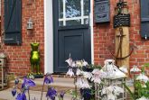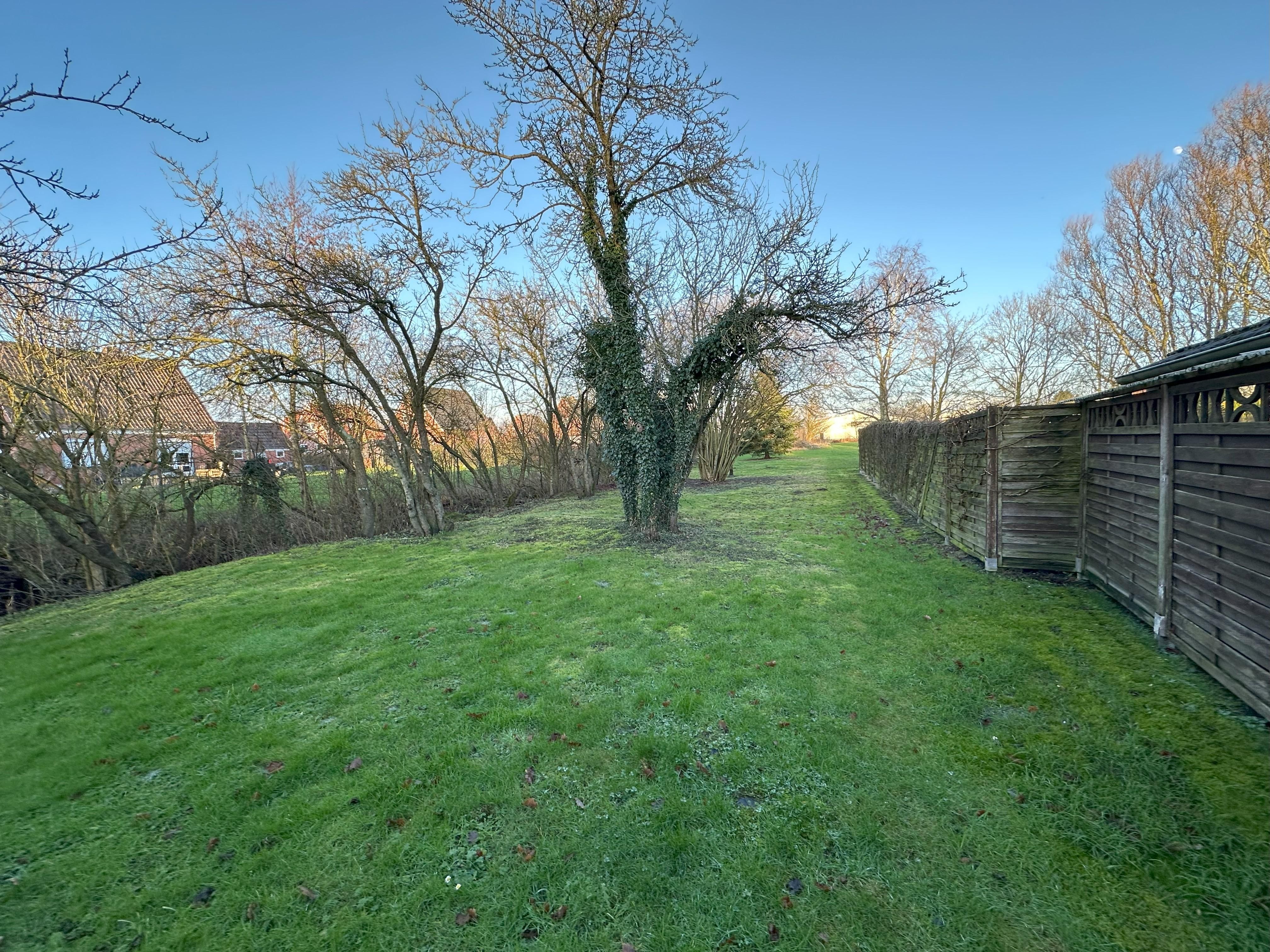 Der Garten hat einen Strandkorb, einen Grill und eine Gartentischgruppe, eine Terrasse und ein Gartenhaus mit Kamin.