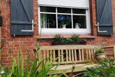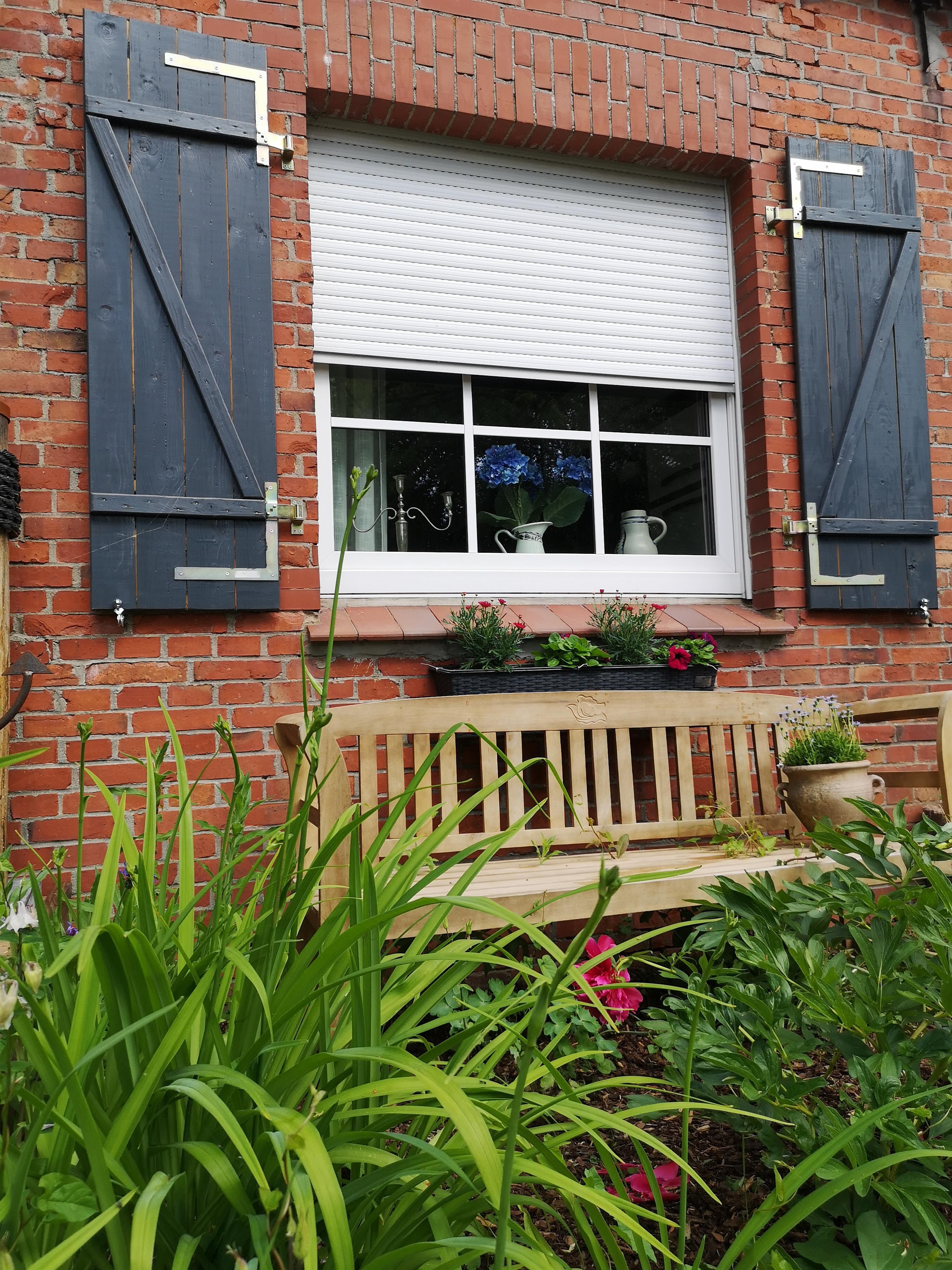Im Garten haben wir ein massives Gartenhaus das ausgestattet ist mit einem Kaminofen, und einem Ostfriesensofa. Holz müssen sie sich vor Ort kaufen und können dann Abends auf dem Ostfriesensofa vor dem Kamin sitzen.