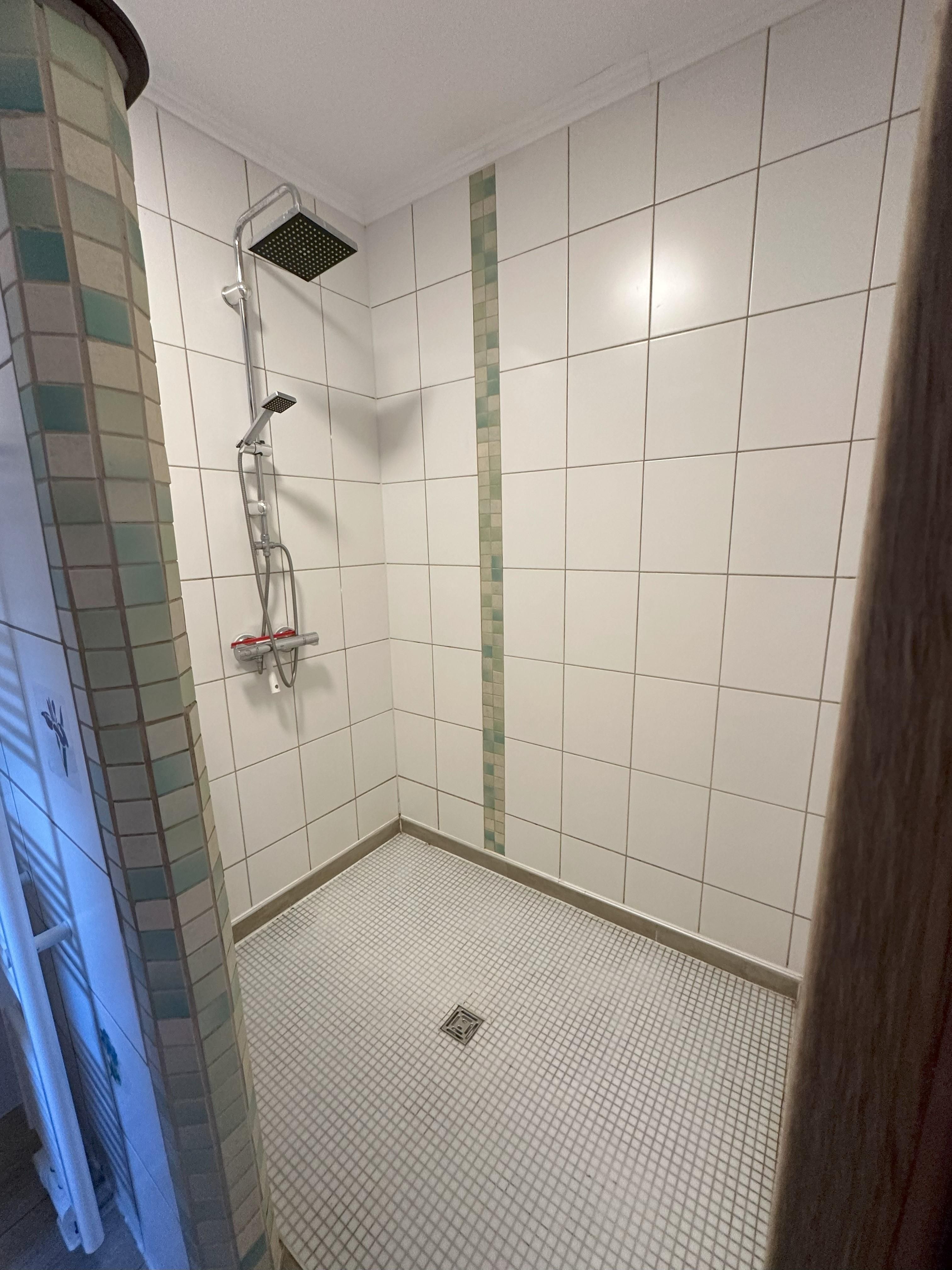 Das Bad hat eine bodentiefe Dusche und ist mit Handtüchern ausgestattet.