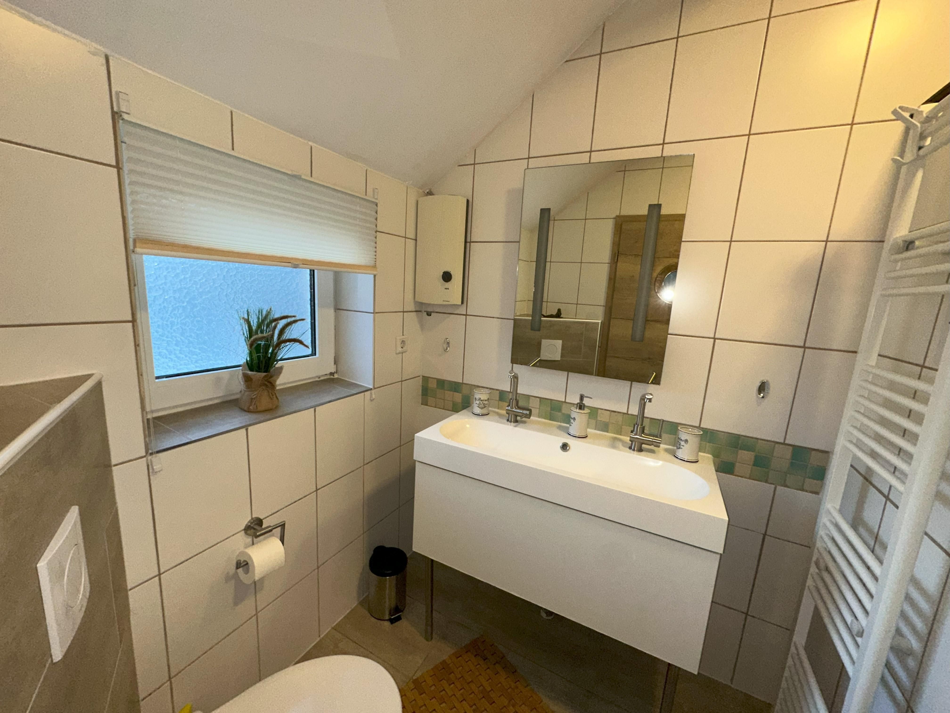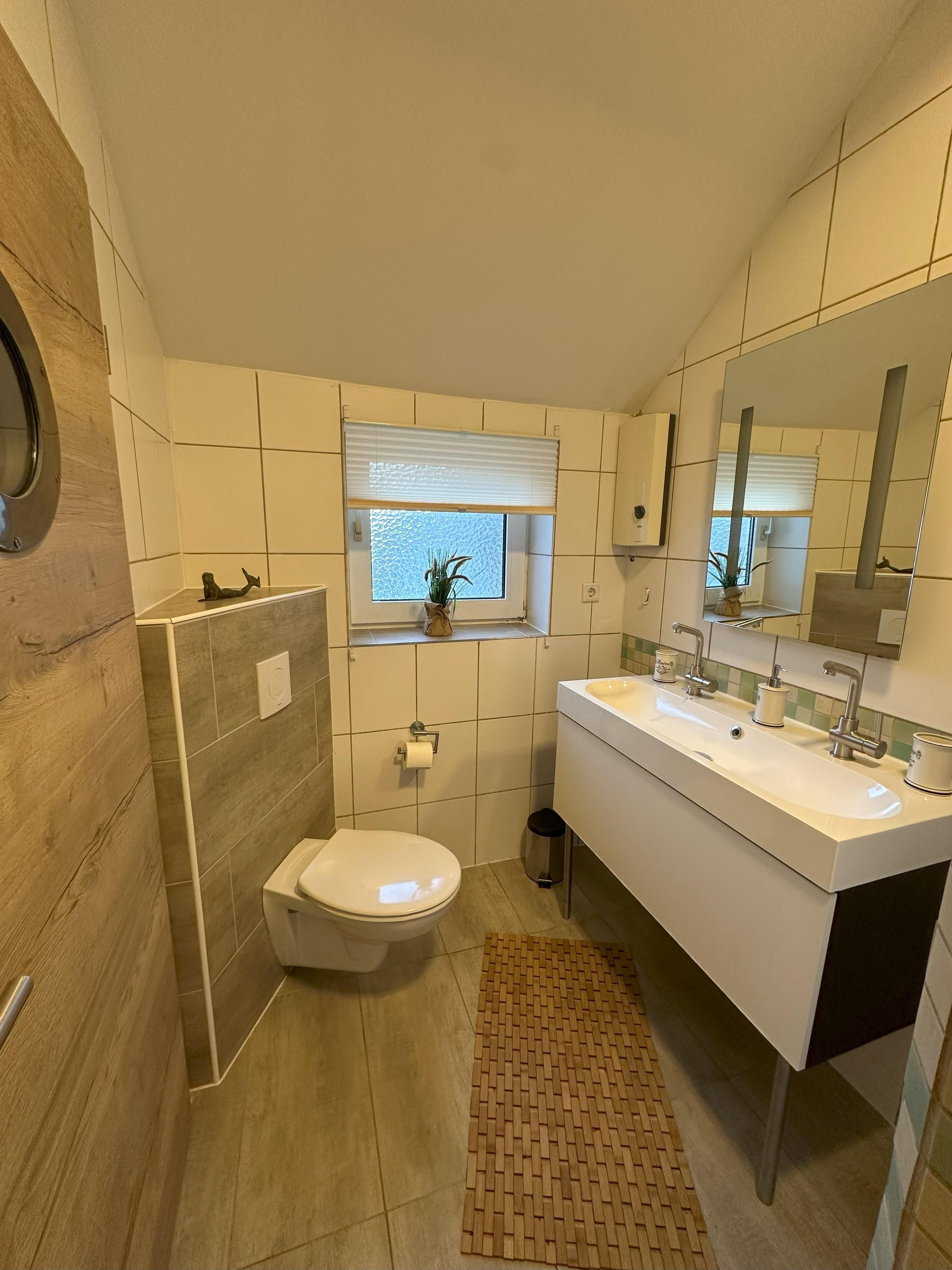 Das Bad hat ein Doppelwaschbecken und ist mit Handtüchern ausgestattet. Das Schlafzimmer hat ein großes Doppelbett in 180x200 cm , Bettwäsche in 155x220cm und einen Fernseher.
