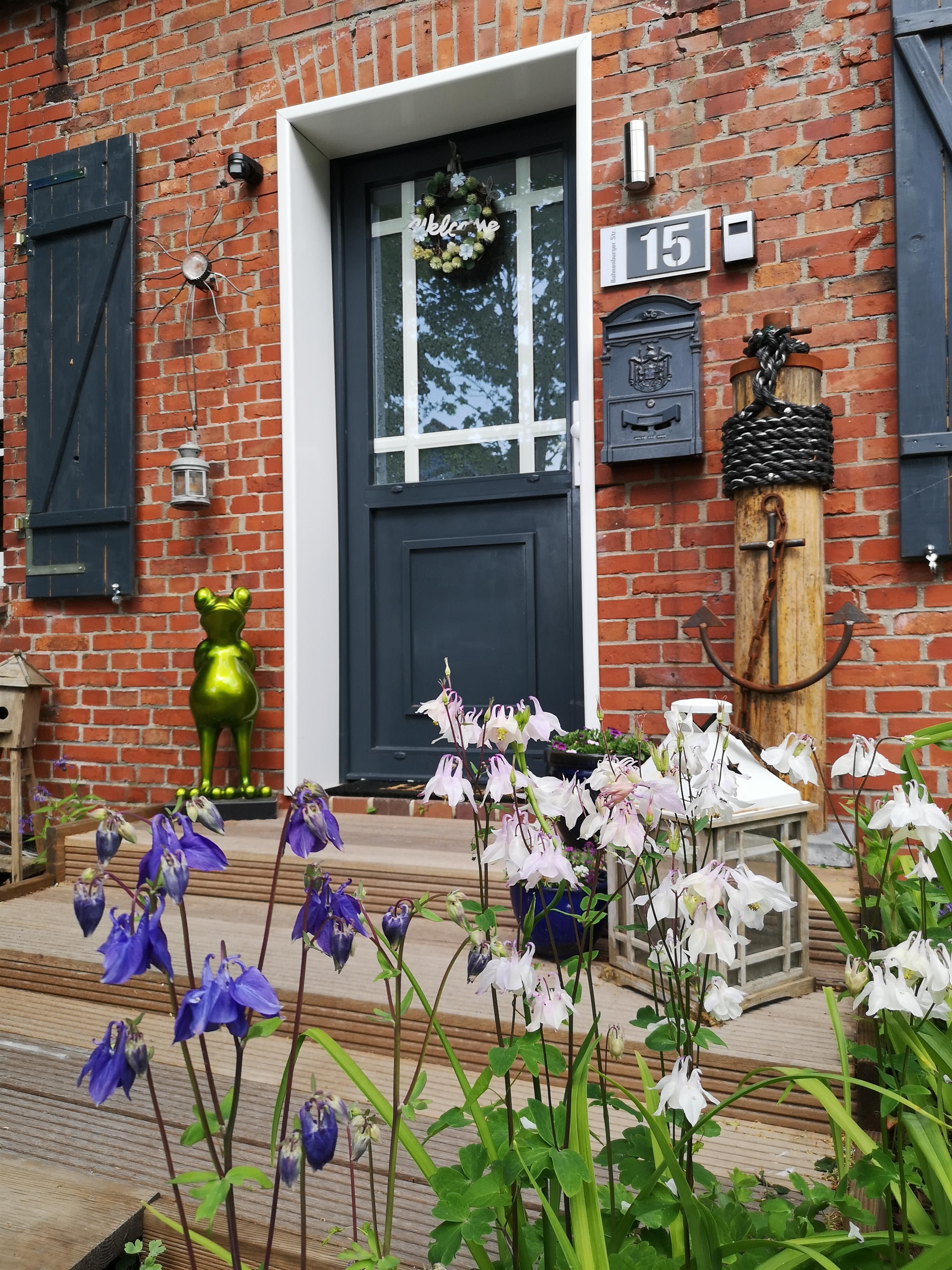 Vor dem Gartenhaus ist unsere Terrasse die ausgestattet ist mit einem echten Nordsee Strandkorb und einer Tischgruppe aus Teakholz. Einen Grill haben wir auch für Sie.