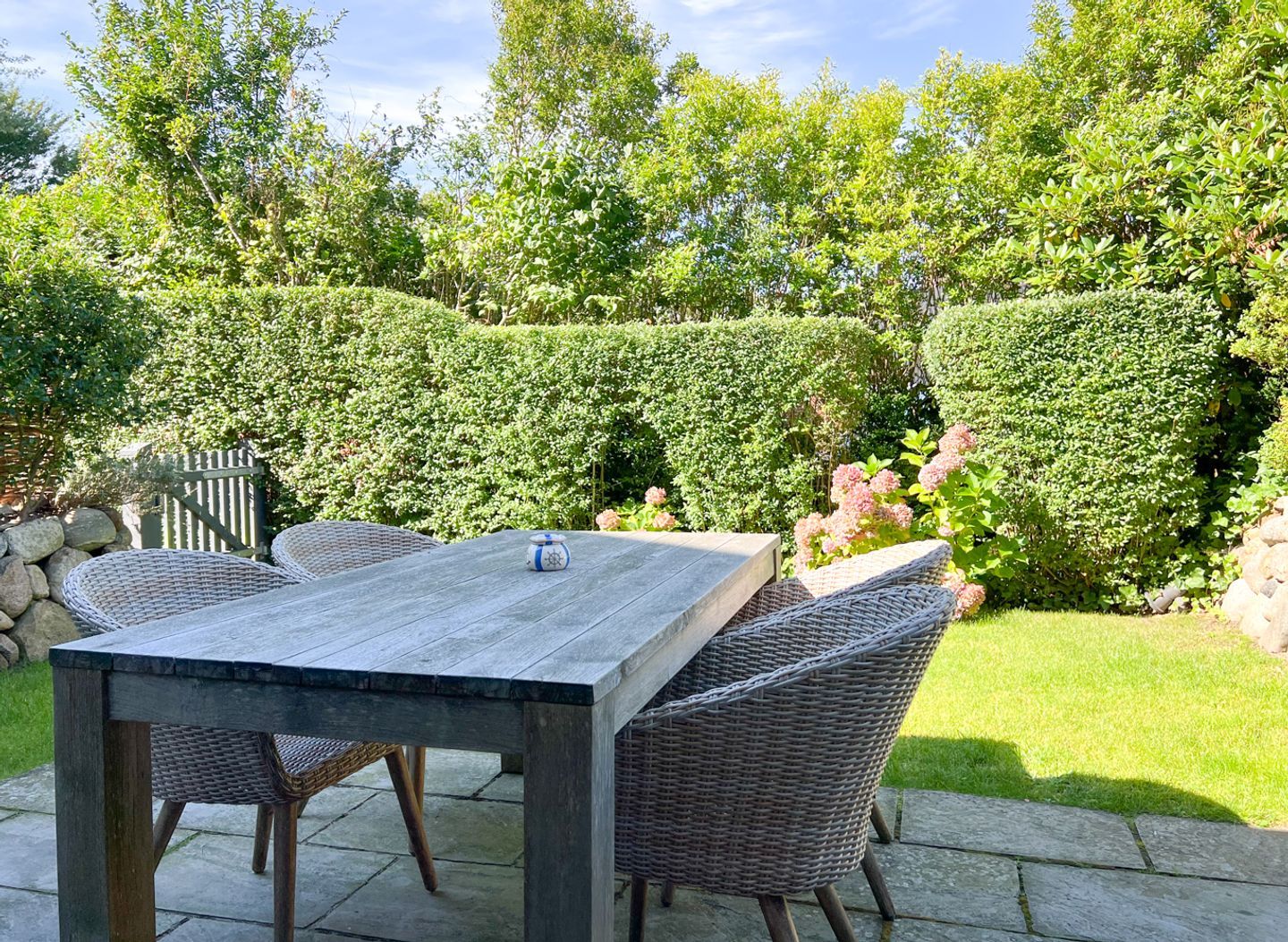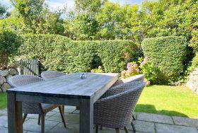Ein absolutes Lieblingsplätzchen ist die geschützte Terrasse mit kleinem Garten. Genießen Sie hier ein ausgedehntes Frühstück in der Morgensonne oder lassen Sie den Tag mit einem Glas Wein entspannt ausklingen. Gartenmöbel stehen selbstverständlich bereit.