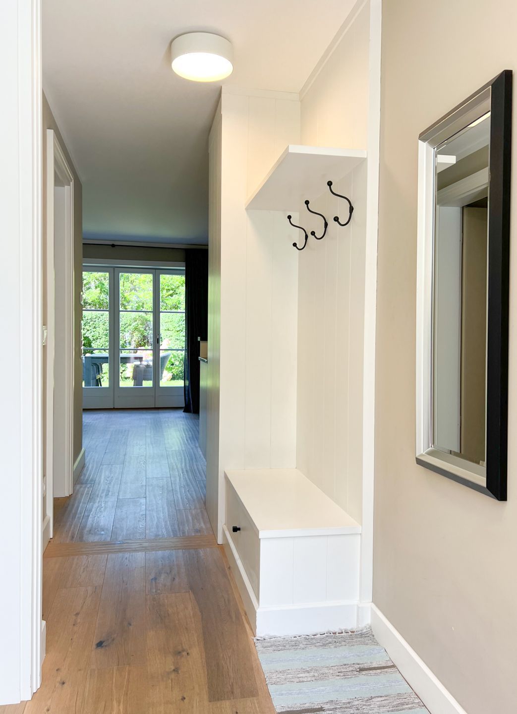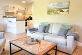 Das helle Wohnzimmer besticht durch maritimen Charme, hochwertige Möbel und gemütliche Details. Große Terrassentüren öffnen den Blick ins Grüne und lassen viel Licht herein. Ein Gaskamin sorgt für stimmungsvolle Abende, das Schlafsofa bietet eine komfortable zusätzliche Schlafmöglichkeit. Ob mit einem guten Buch, einem Film oder Musik über das Bluetooth-Dock – hier lässt es sich wunderbar entspannen.