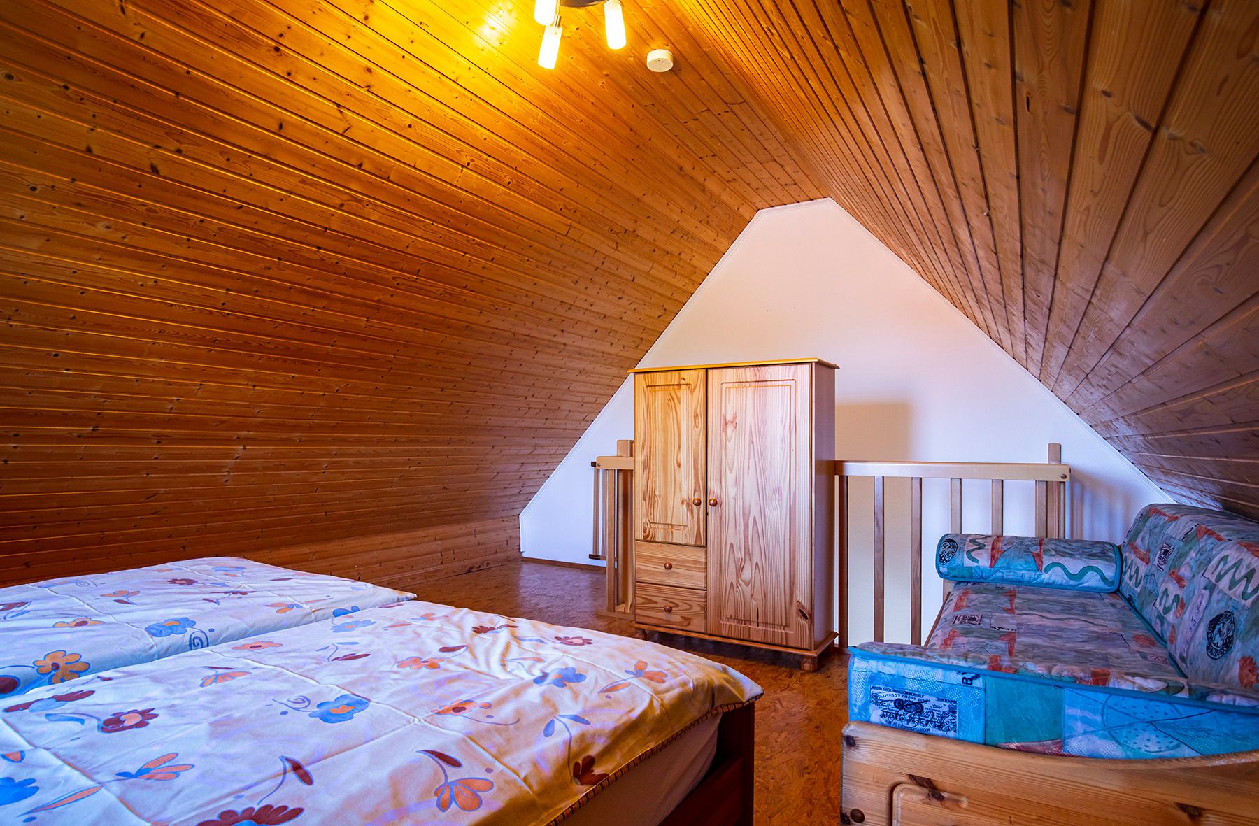 Die Unterkunft ist für bis zu 5 Personen ausgelegt. Sie ist hochwertig ausgestattet und verfügt über 3 getrennte Schlafzimmer. Das Wohn- und Esszimmer mit offener Küche und angrenzendem Balkon bilden den Wohnmittelpunkt. Auf der gleichen Etage befinden sich das Elternschlafzimmer, ein Kinderzimmer sowie ein gut ausgestattetes Duschbad. Eine freitragende Holztreppe führt in das Obergeschoss, wo sich ein weiteres großes Kinderzimmer mit 2 Einzelbetten befindet. Alle Schlafräume verfügen über sehr komfortable Betten mit Mehrzonenmatratzen und verstellbaren Lattenrosten für einen erholsamen Schlaf.