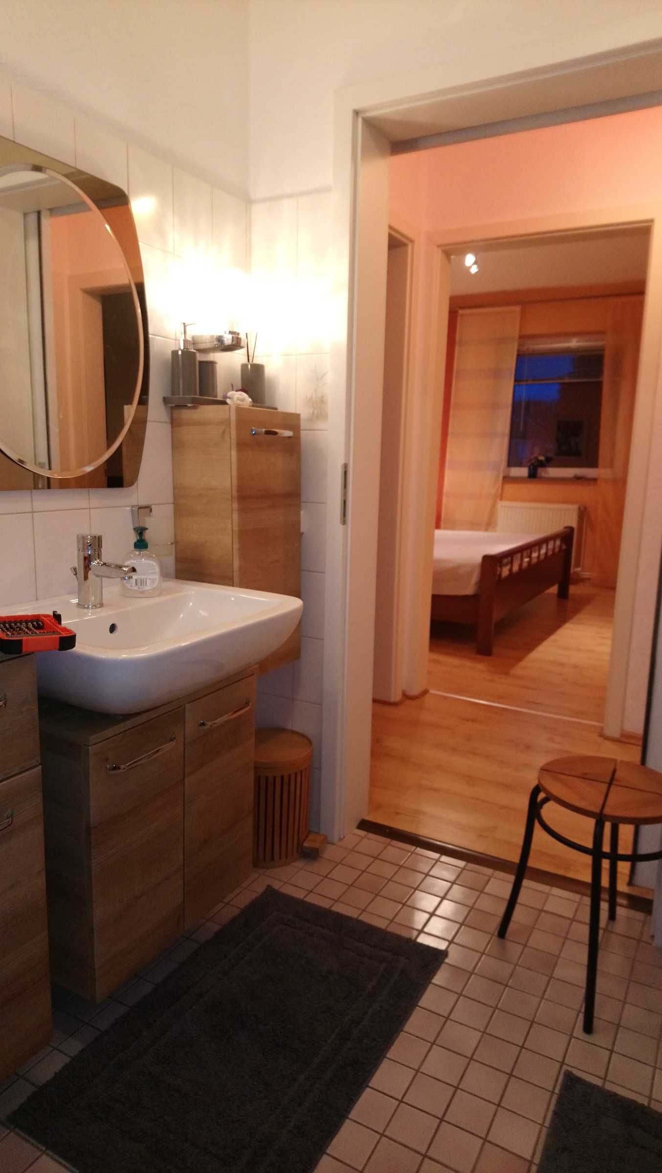 Voll eingerichtete FeWo mit 2 Zimmern und komplett eingerichteter Küche (ohne Spülmaschine), hochwertigen Vollholzmöbeln, mit Samsung 32 LCD-TV und schnellem Vodafone Wifi-WLAN-Internet. Bad mit Wanne und Handdusche hinter Duschabtrennung.