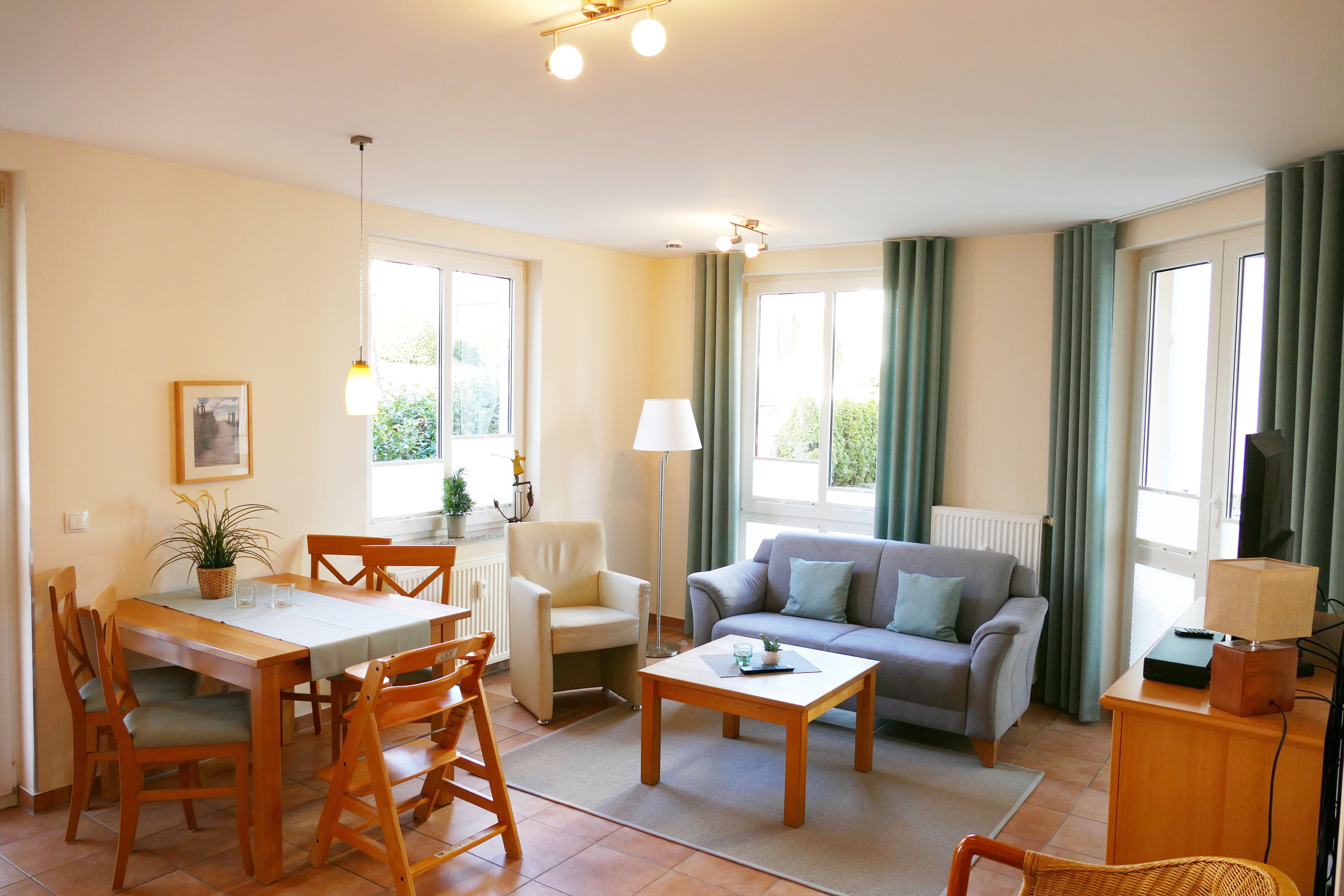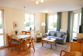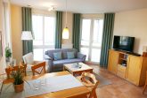 Die helle und freundliche Ferienwohnung befindet sich im Erdgeschoss des Neubaus der Villa Linquenda. Die 65 qm große Wohnung ist hochwertig eingerichtet und bietet Platz für bis zu vier Personen. Sie verfügt über ein Wohnbereich mit Sitzgruppe & Flat-TV, eine komplett ausgestattete Küchenzeile, ein Schlafzimmer mit Doppelbett ( 1,80m x 2,00m) und zusätzlichem Flat-TV sowie ein zweites Schlafzimmer mit zwei Einzelbetten. Das Bad verfügt über eine Dusche und WC. Zwei Balkone runden das Angebot der Wohnung ab.