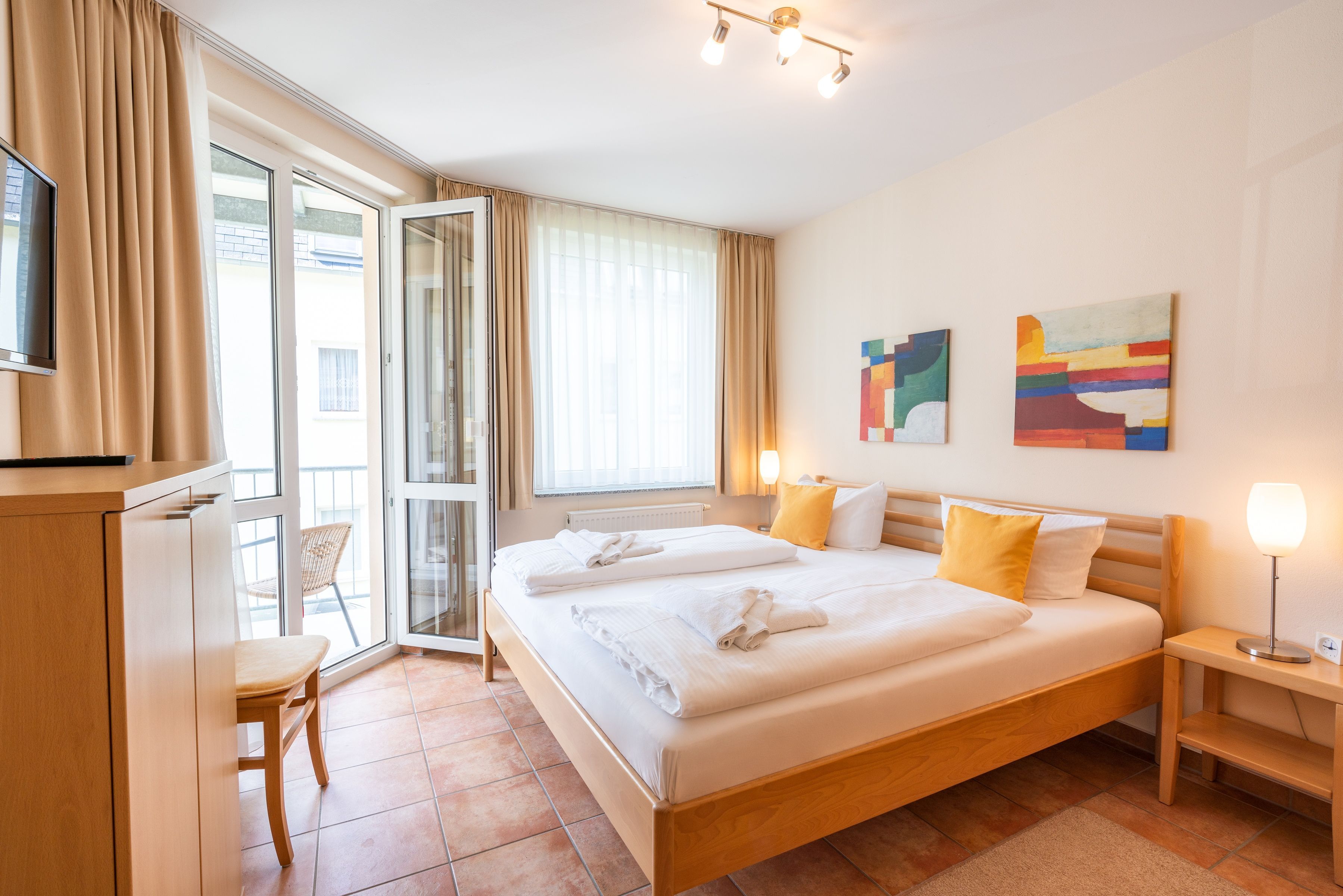 Alle Wohnungen sind mit viel Liebe zum Detail und hochwertigem Interieur ausgestattet. Warme Terrakottafliesen und harmonische Dekostoffe schaffen ein einladendes Ambiente. Für Familien stellen wir Ihnen auf Anfrage gerne kostenlos ein Kinderreisebett und einen Hochstuhl zur Verfügung. Zudem ist für jedes Appartement ein PKW-Stellplatz reserviert. Bitte beachten Sie, dass bei größeren Fahrzeugen die Parkmöglichkeiten etwas eng ausfallen könnten. Selbsverständlich ist auch WLAN inklusive. Genießen Sie die Zeit auf Ihrem Balkon oder Ihrer Terrasse, wo Balkonmöbel zur Verfügung stehen. Der Fahrradraum Nr. 09 steht Ihnen ebenfalls kostenfrei zur Verfügung und bietet Platz für bis zu zwei Fahrräder.