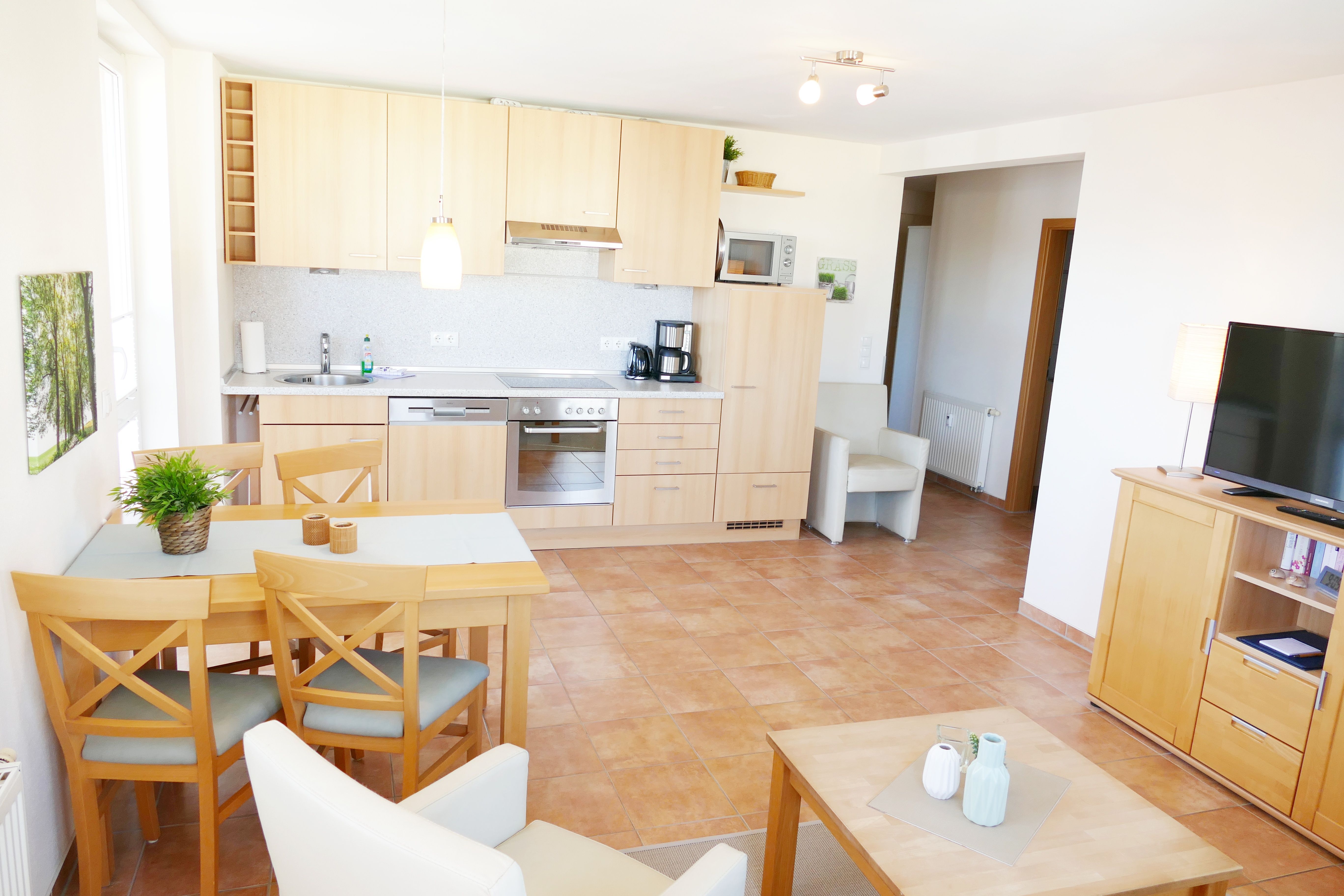Die helle und freundliche Ferienwohnung in der dritten Etage des Neubaus der Villa Linquenda bietet auf 63 m² komfortablen Platz für bis zu vier Personen. Die hochwertig eingerichtete Wohnung verfügt über einen gemütlichen Wohnbereich mit Sitzgruppe und Flat-TV sowie eine komplett ausgestattete Küchenzeile.
